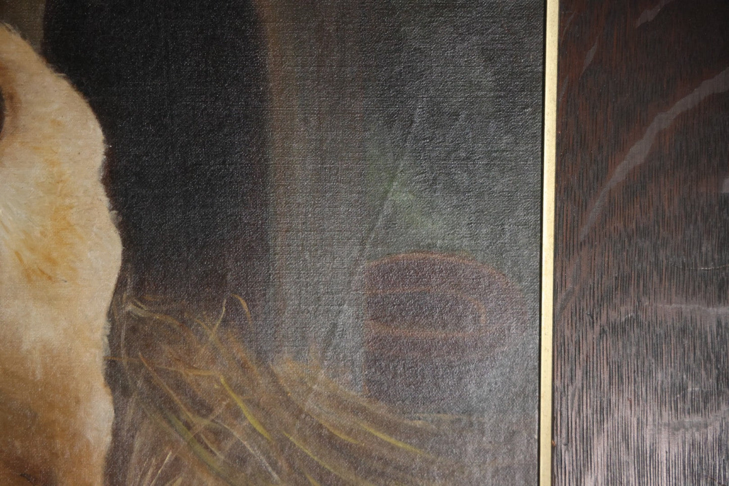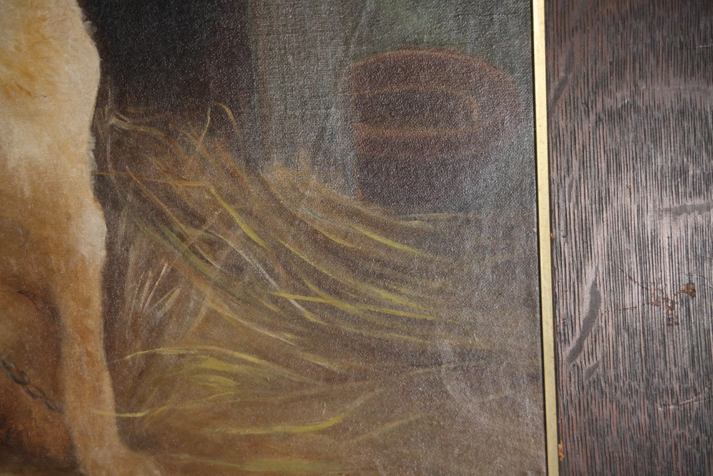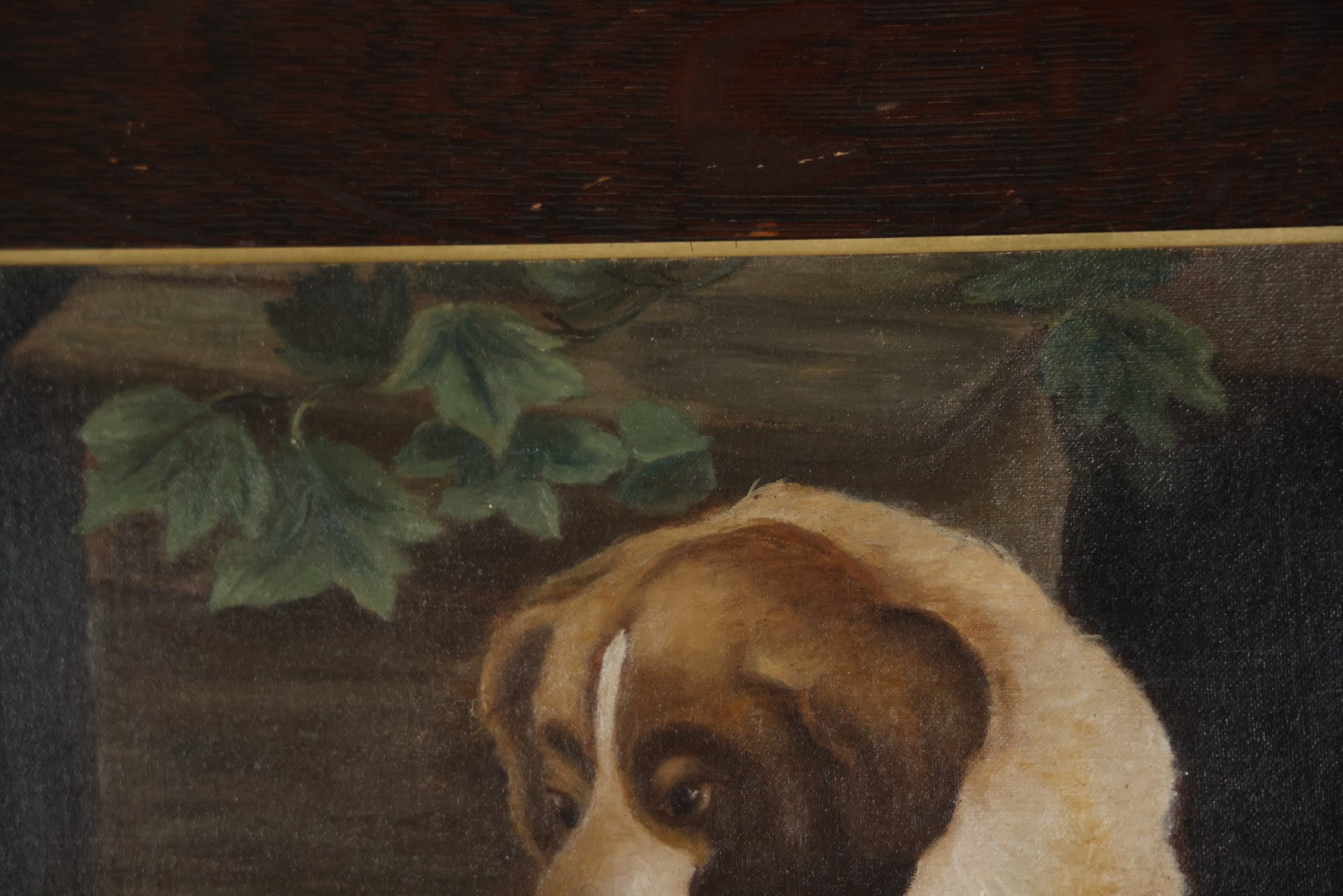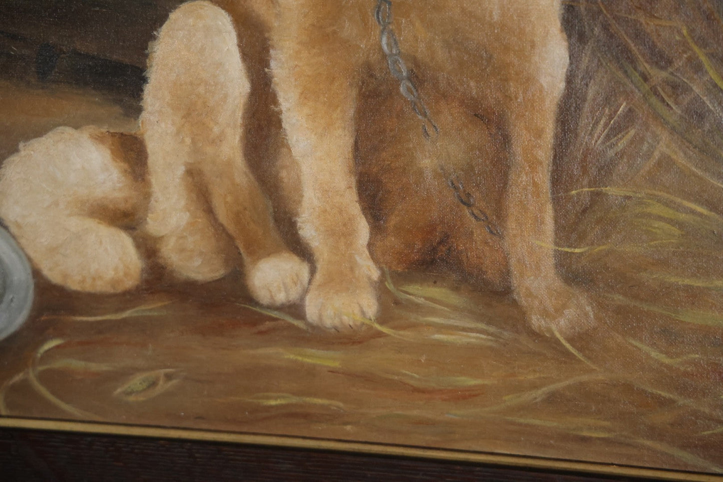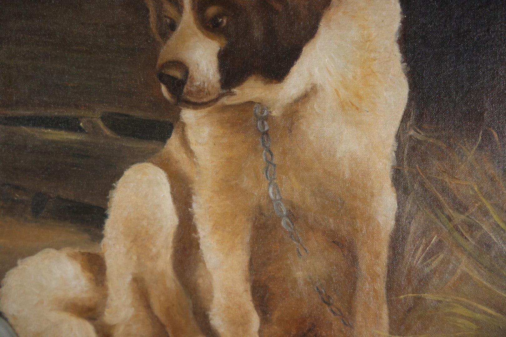 Antique Oil On Canvas Painting Of A Large Saint Bernard Dog Sharing A Saucer Of Water With A Small Gray Cat, On A Farm, Horses In Background, In Frame, 28" x 30"