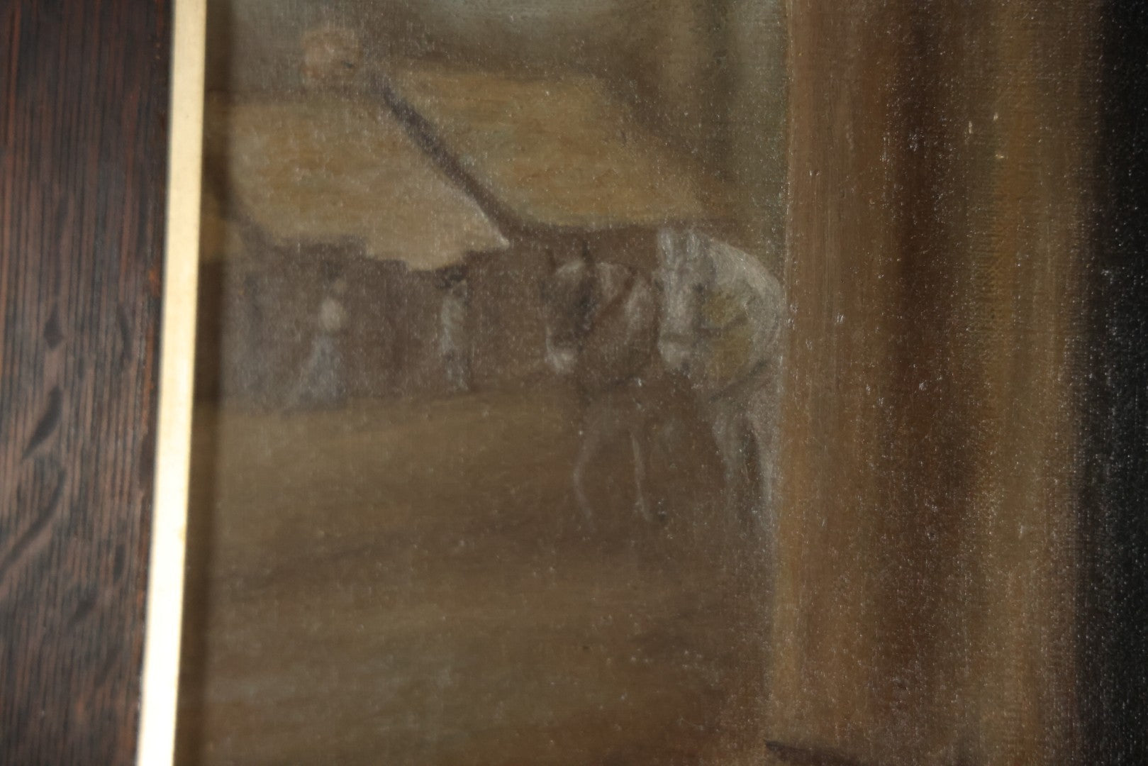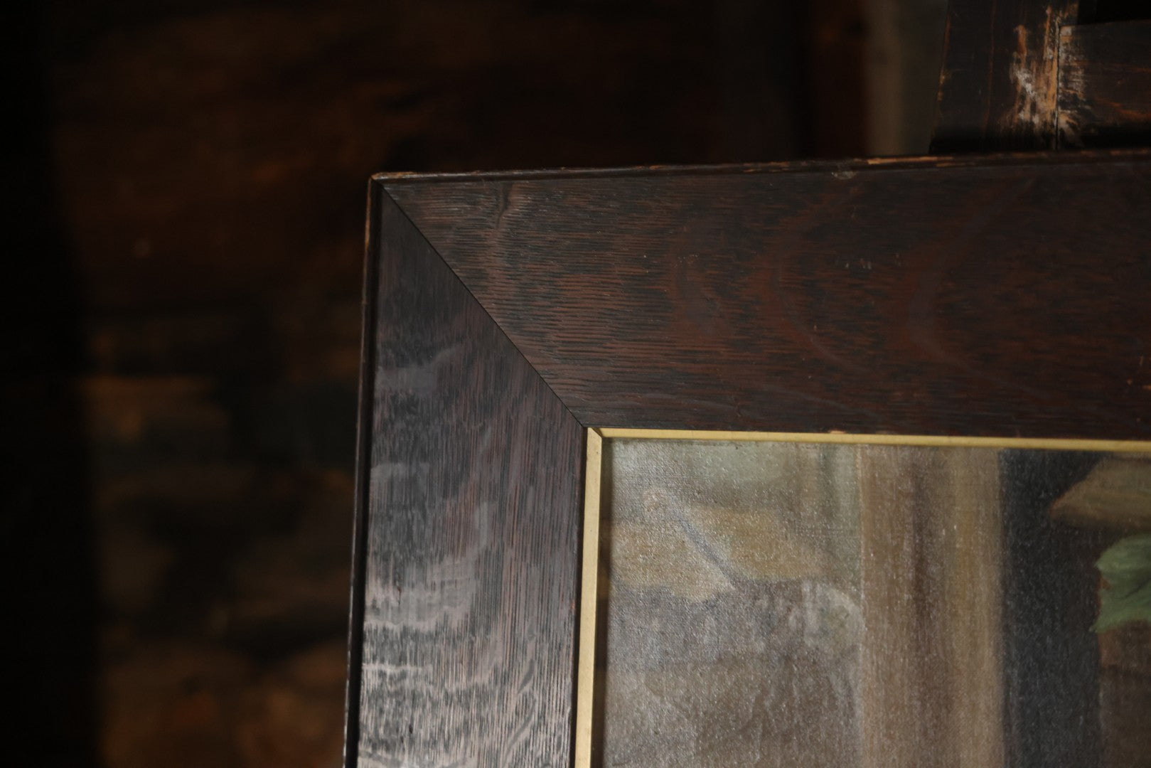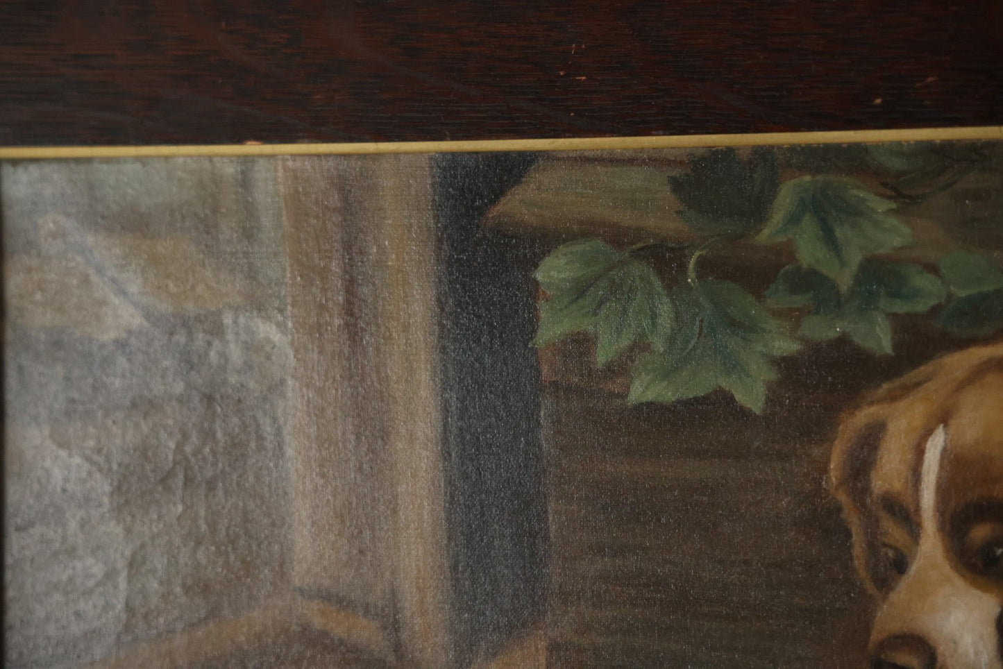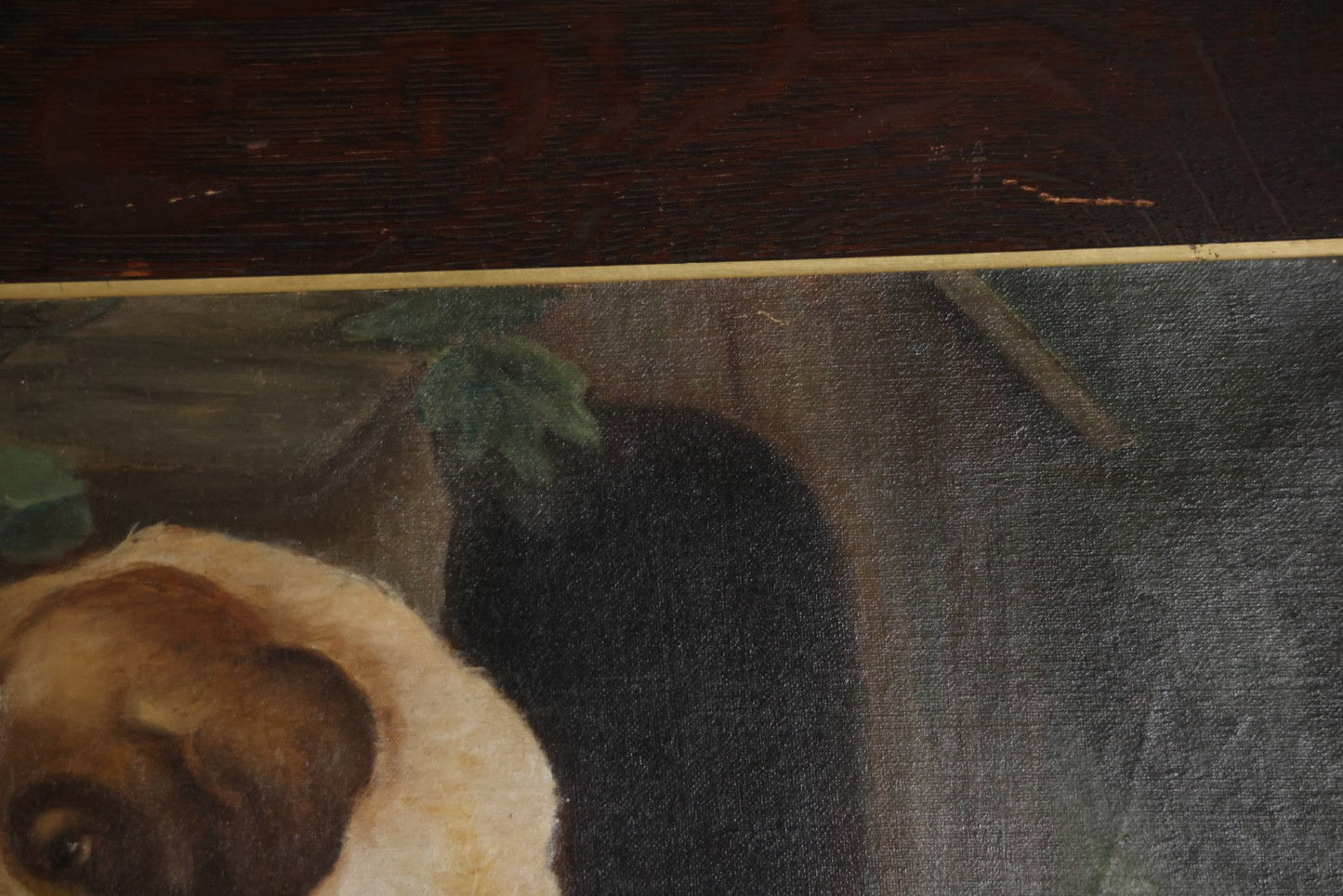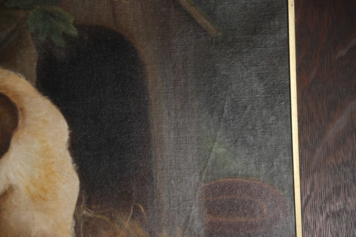 Antique Oil On Canvas Painting Of A Large Saint Bernard Dog Sharing A Saucer Of Water With A Small Gray Cat, On A Farm, Horses In Background, In Frame, 28" x 30"