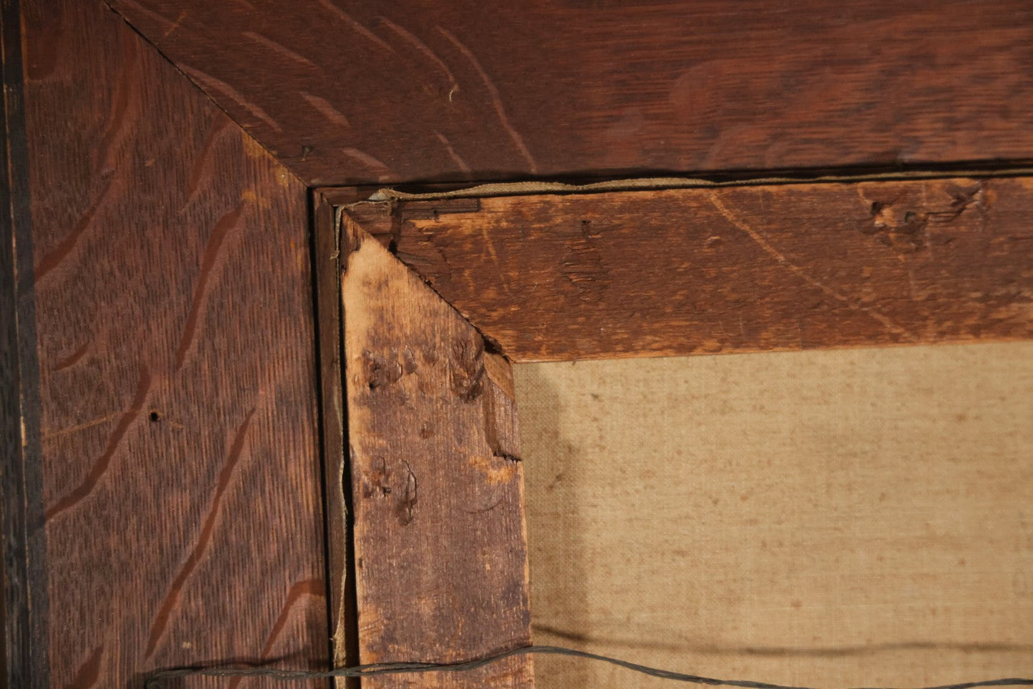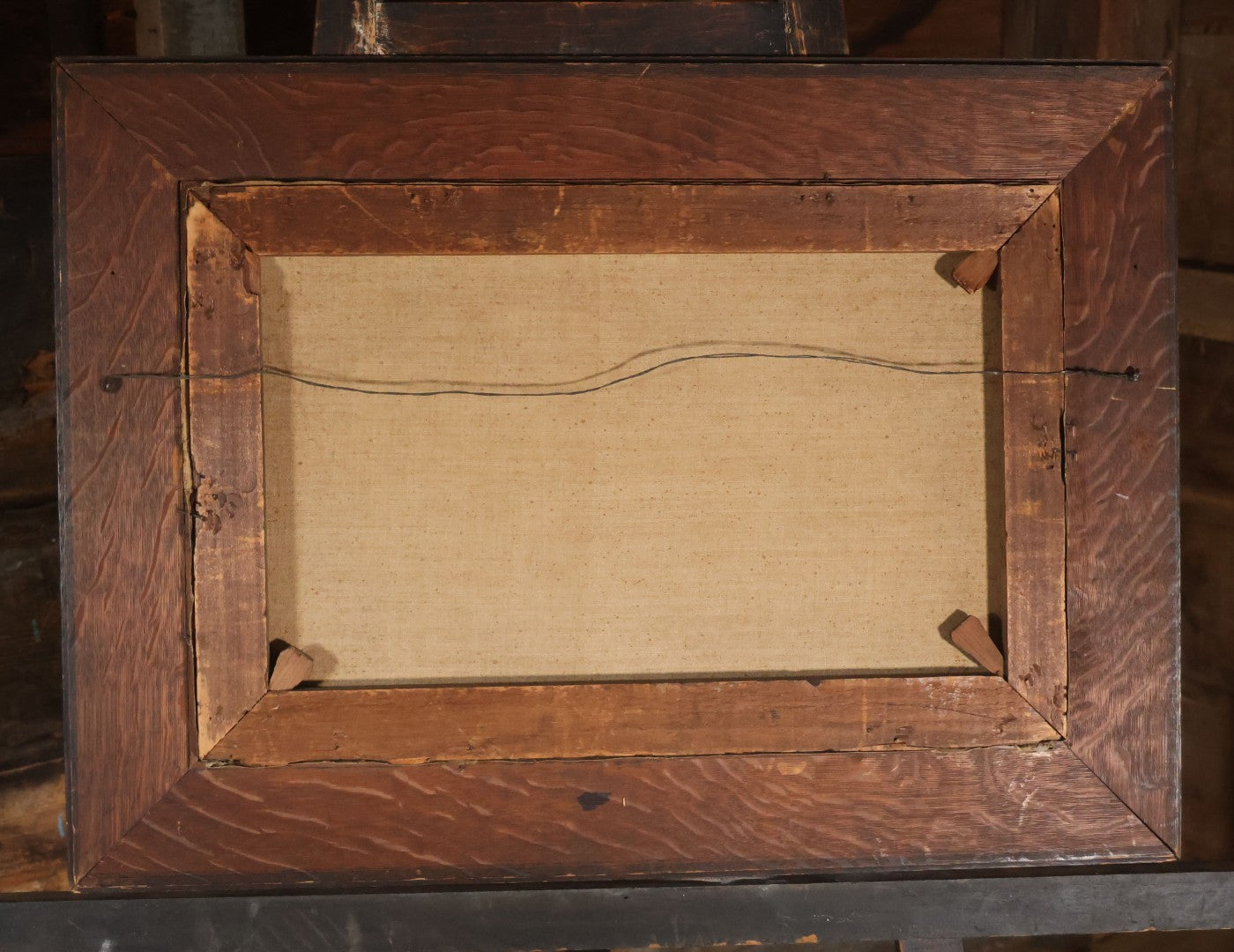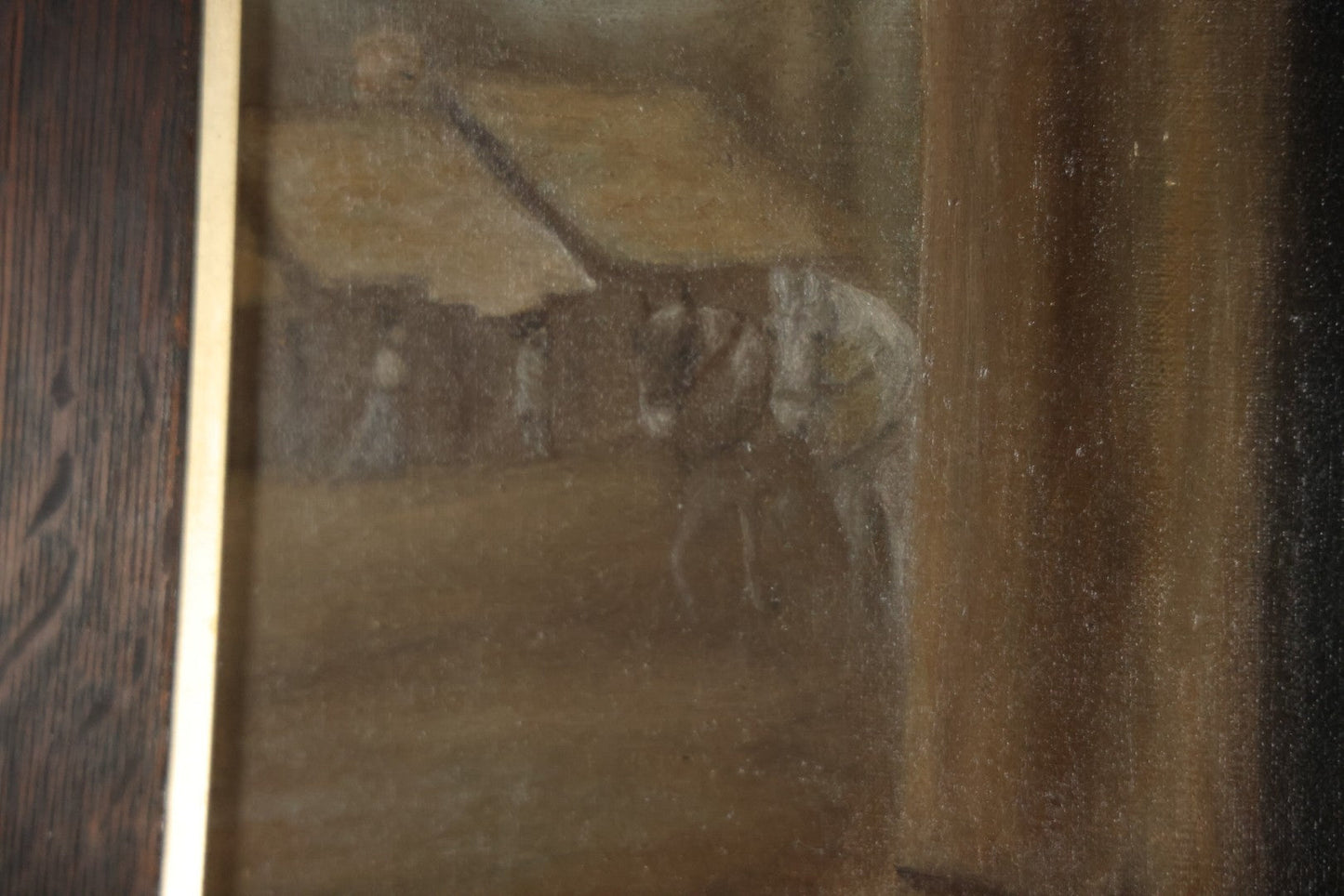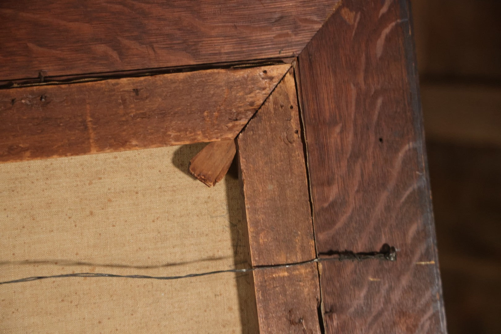 Antique Oil On Canvas Painting Of A Large Saint Bernard Dog Sharing A Saucer Of Water With A Small Gray Cat, On A Farm, Horses In Background, In Frame, 28" x 30"