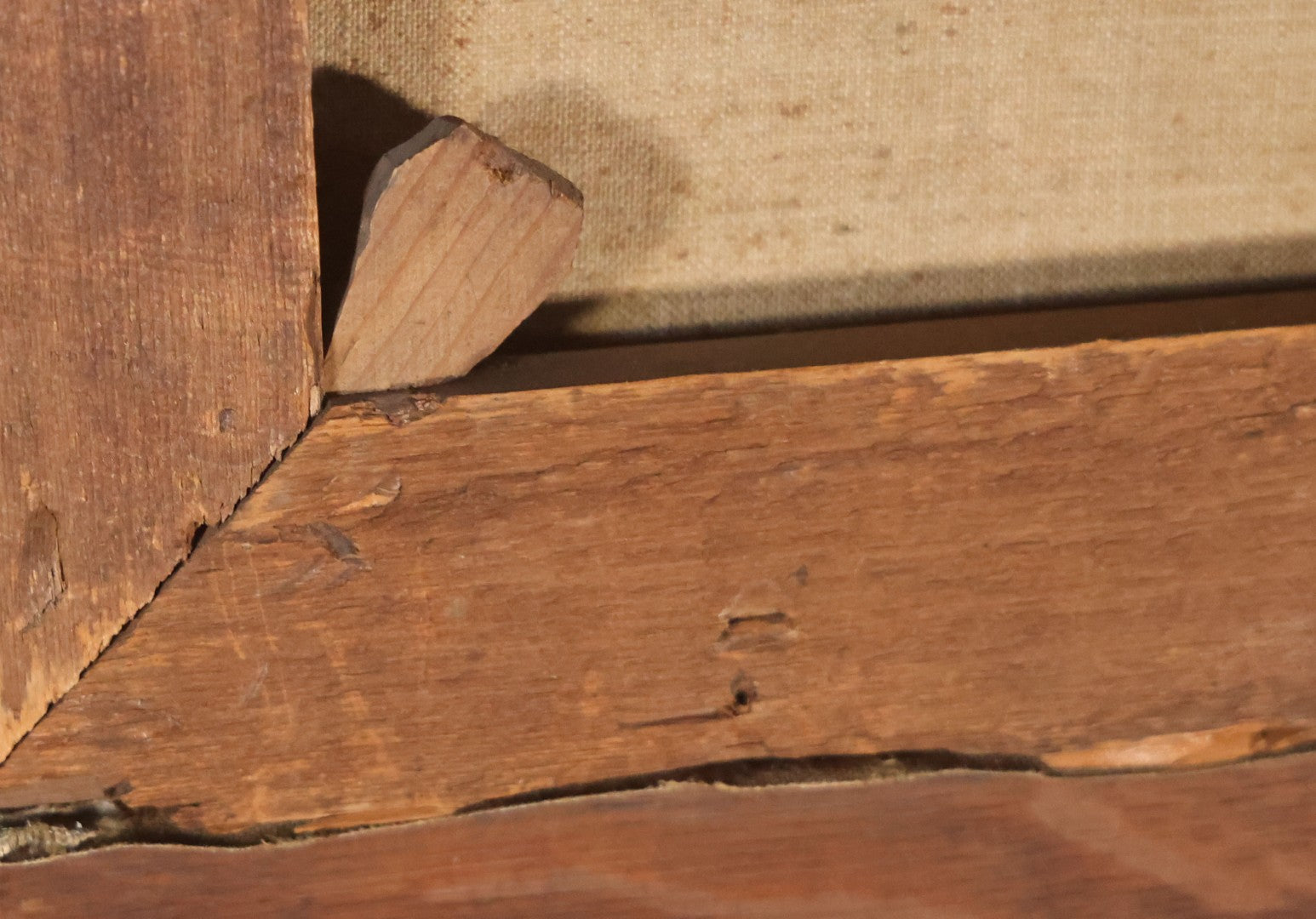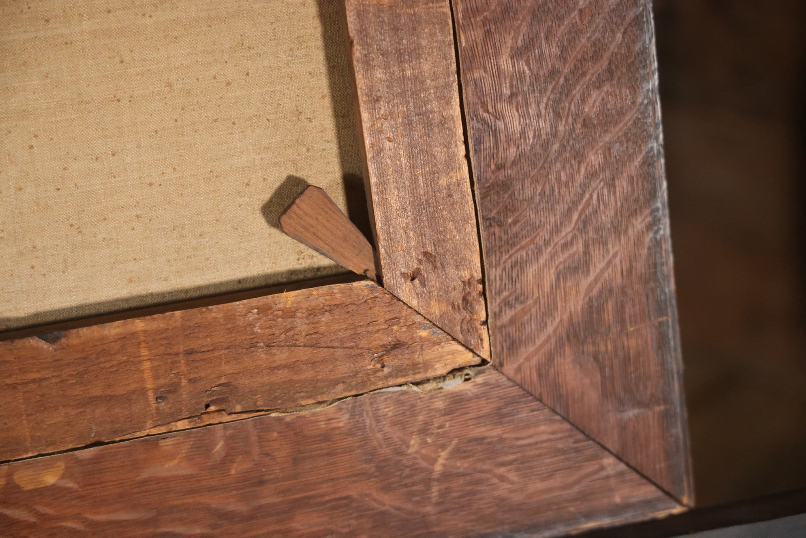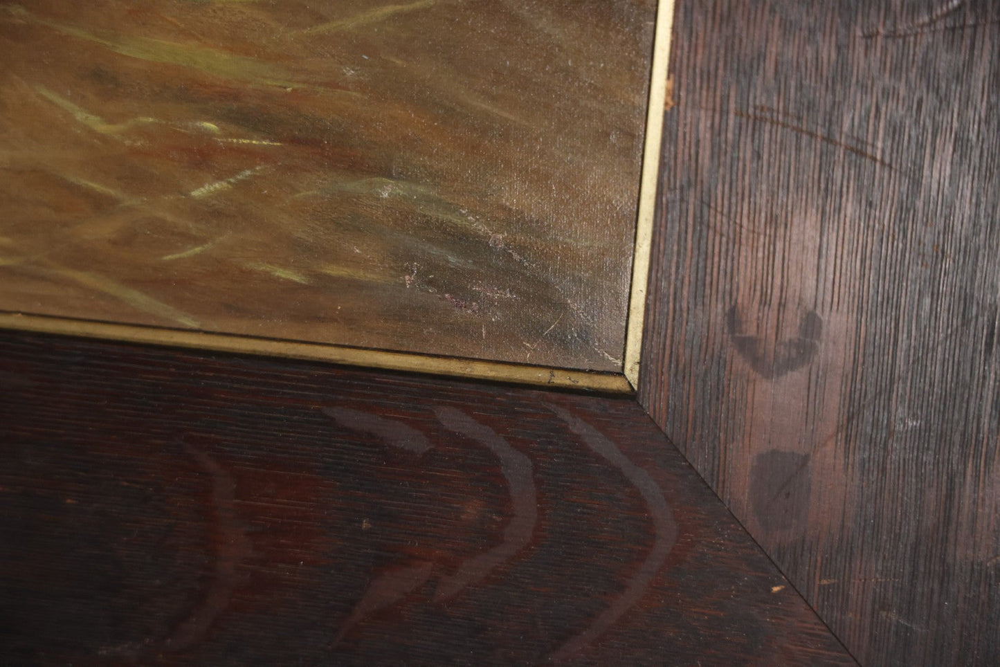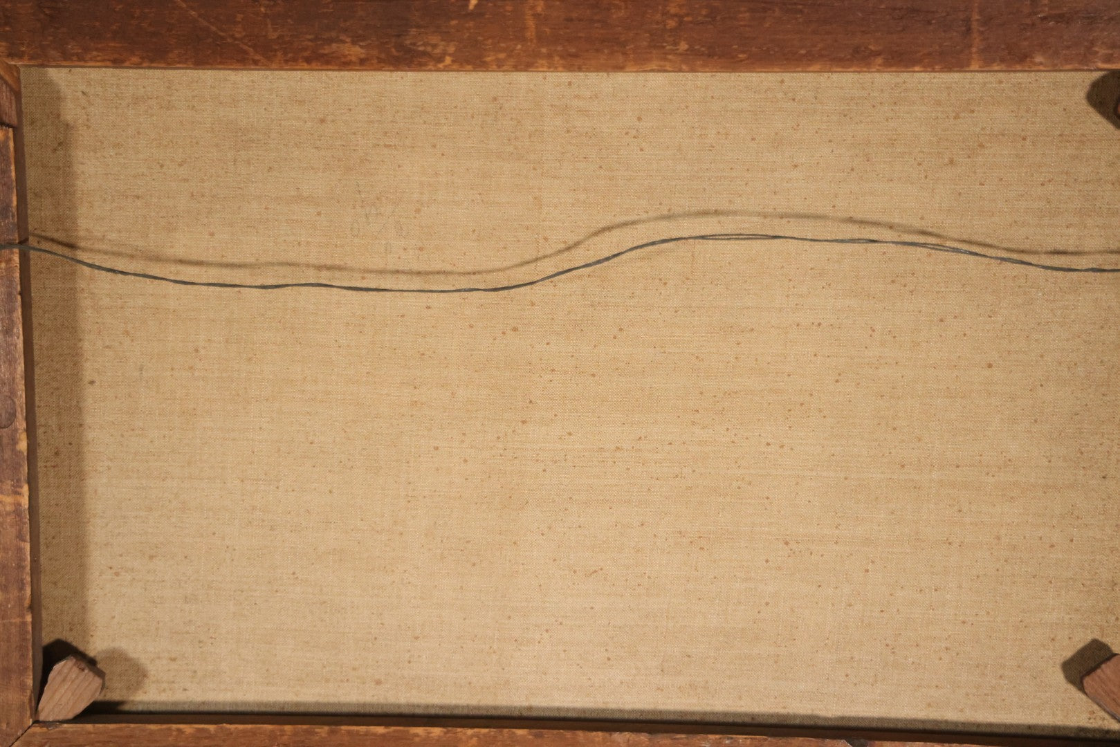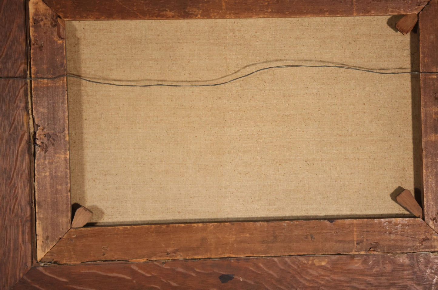 Antique Oil On Canvas Painting Of A Large Saint Bernard Dog Sharing A Saucer Of Water With A Small Gray Cat, On A Farm, Horses In Background, In Frame, 28" x 30"