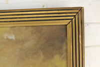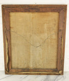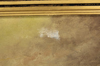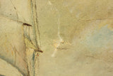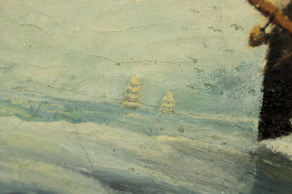 Here is a lovely antique oil on canvas painting in a wood frame. The scene depicts a large clipper ship in focus with two smaller clipper ships in the distance. A flock of seagulls flies behind the ship. The painting is signed in the lower right corner, but I cannot make out the signature. The painting is in fair condition with a couple of holes and tears in the canvas. It would still make a lovely wall hanger to decorate any home. The frame measures 24 x 28".