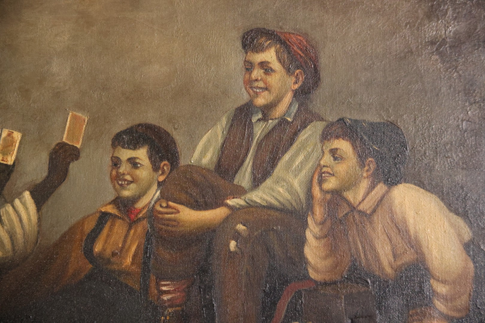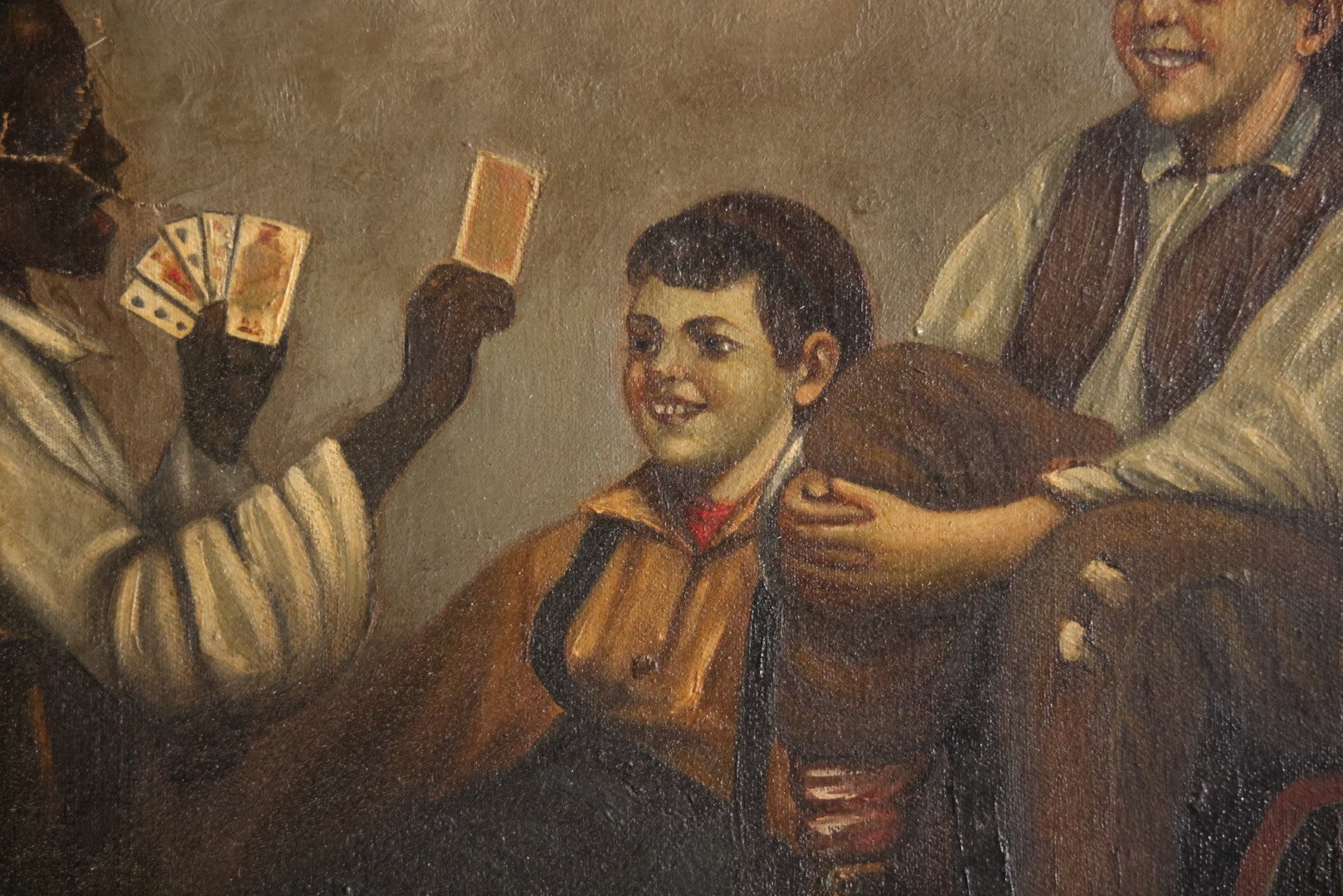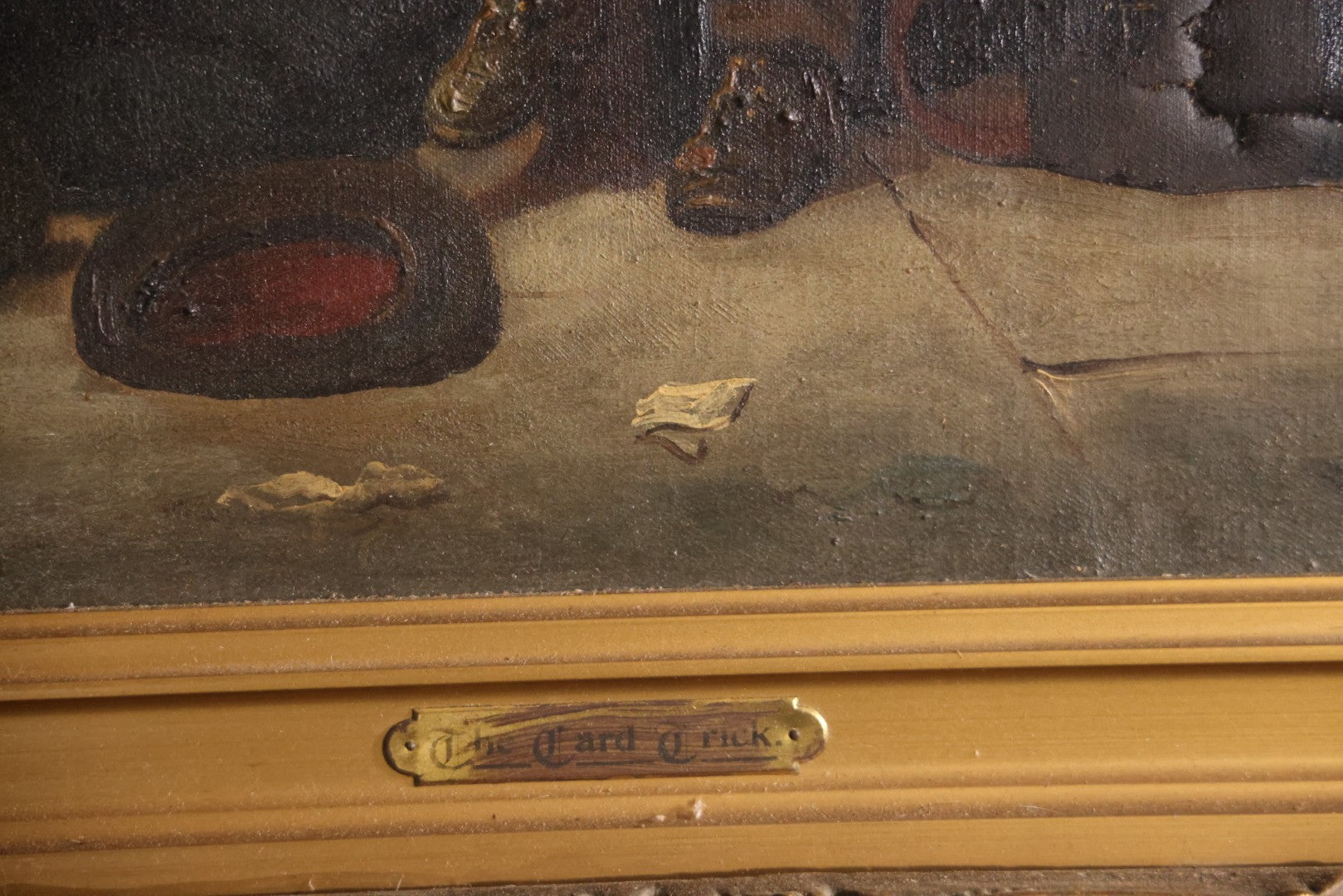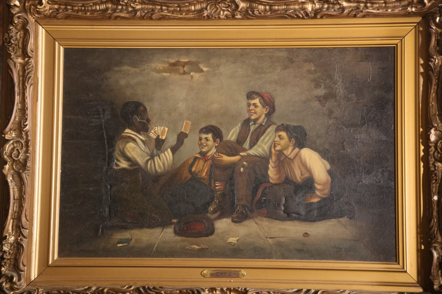 Antique Oil On Canvas Painting Titled "The Card Trick" After John George Brown, Little Boy Showing Off Card Trick To Young Friends, Artist Signed Lower Right, Illegible, In Ornate Frame With Title Plaque, Note Holes, Damage, 37-1/2" x 27-1/2"