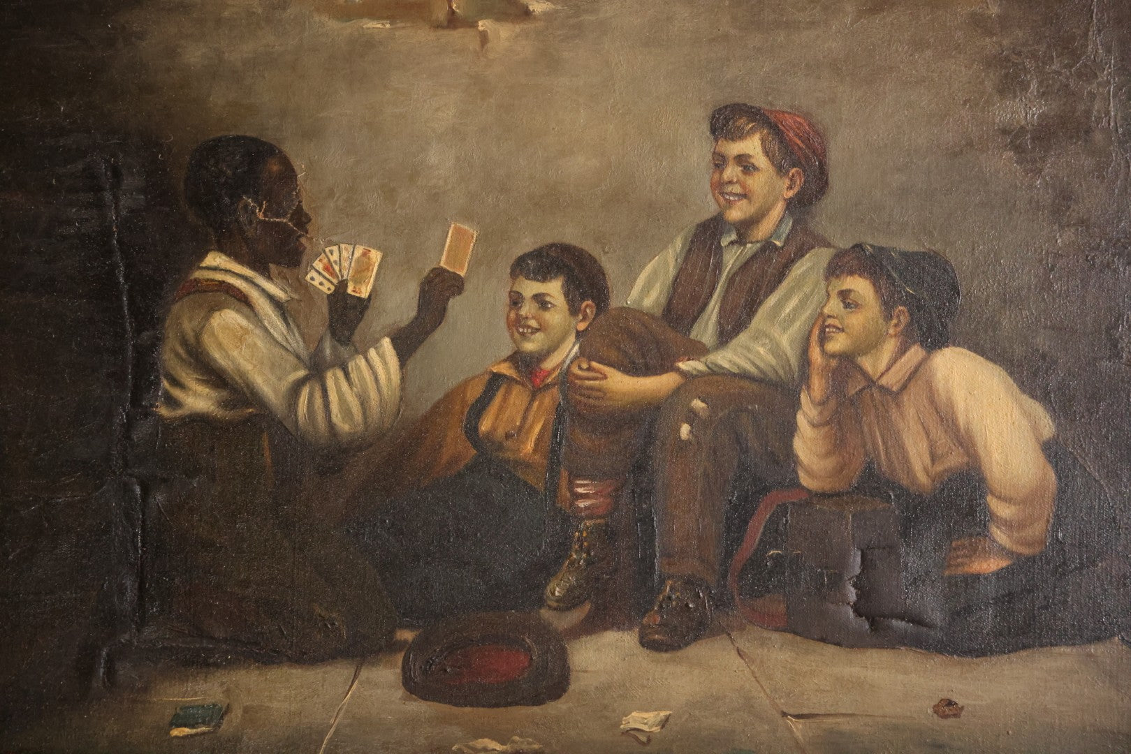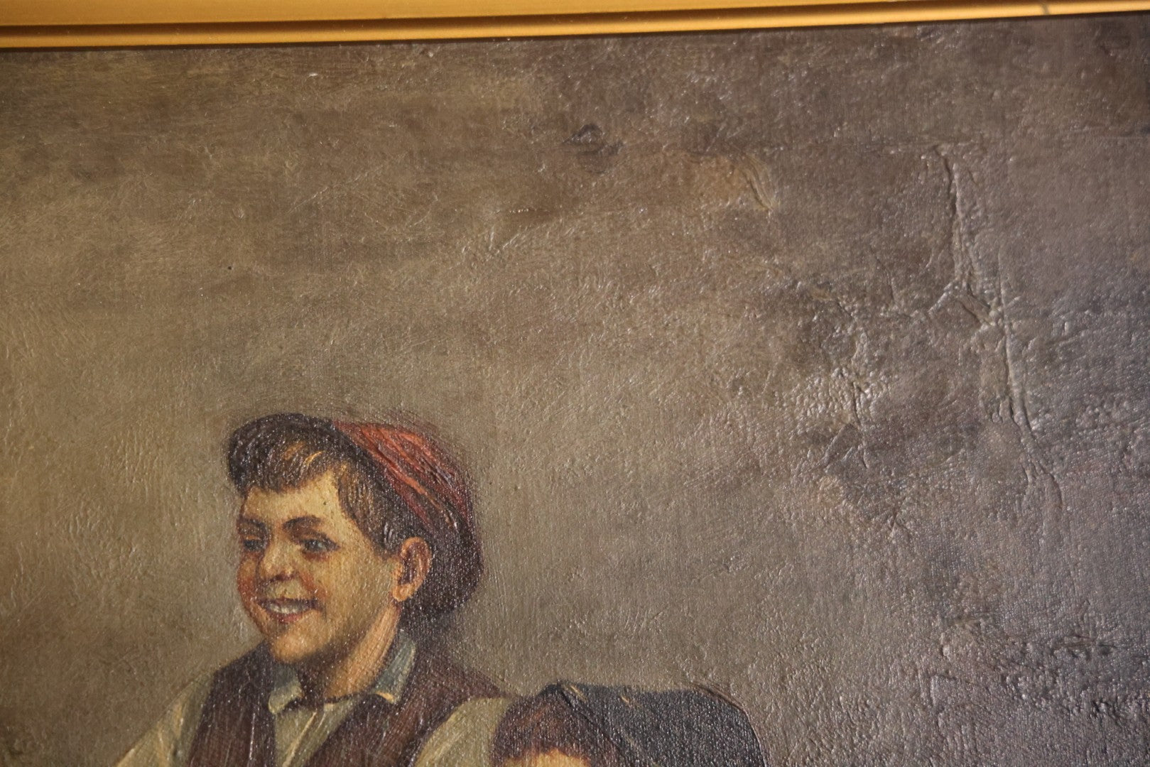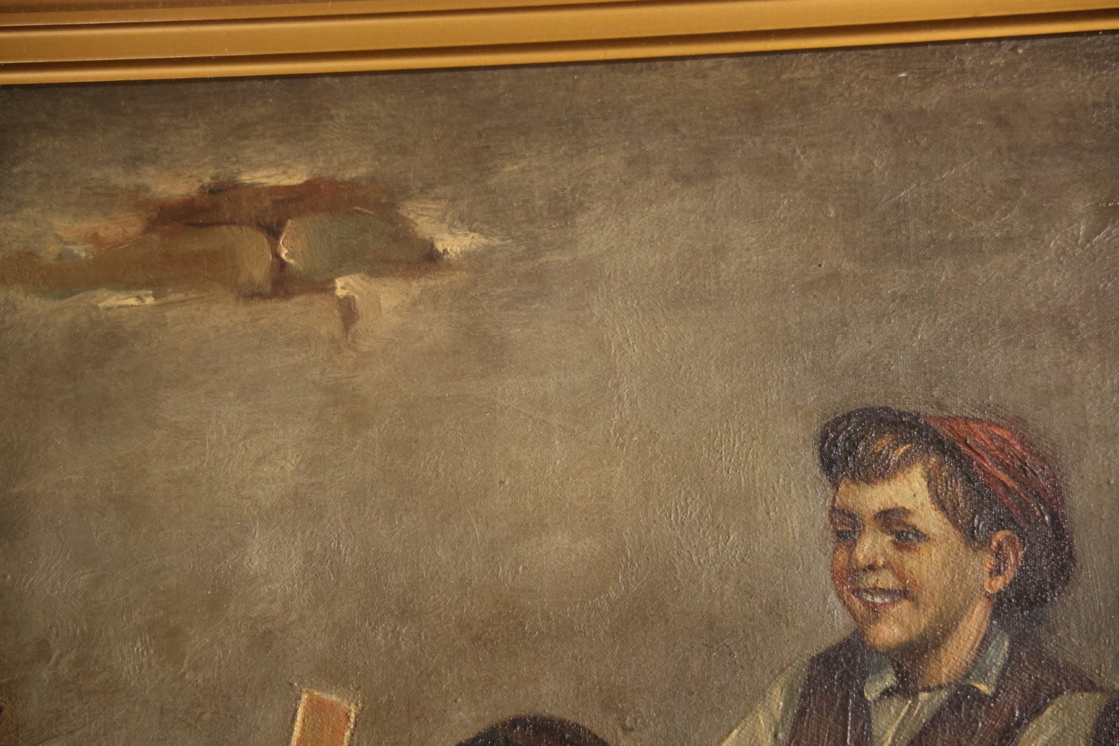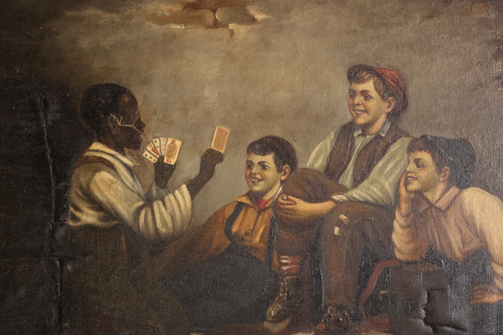 Antique Oil On Canvas Painting Titled "The Card Trick" After John George Brown, Little Boy Showing Off Card Trick To Young Friends, Artist Signed Lower Right, Illegible, In Ornate Frame With Title Plaque, Note Holes, Damage, 37-1/2" x 27-1/2"
