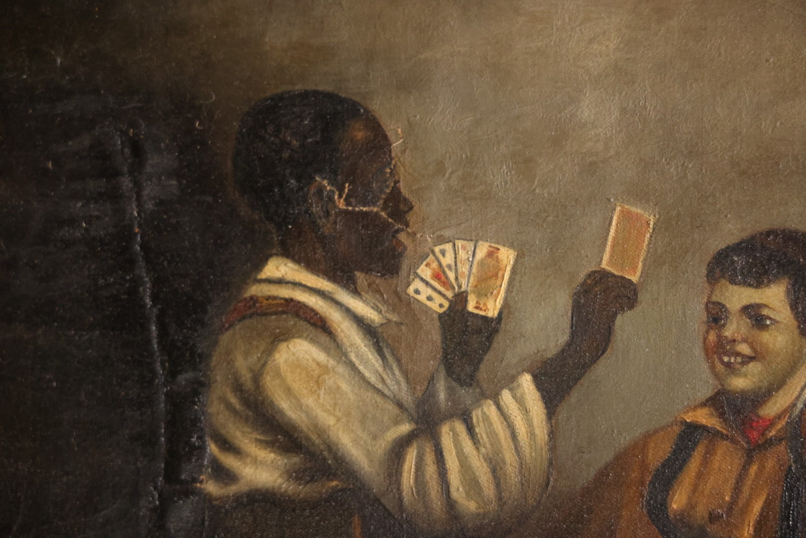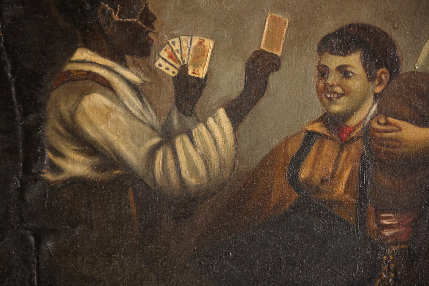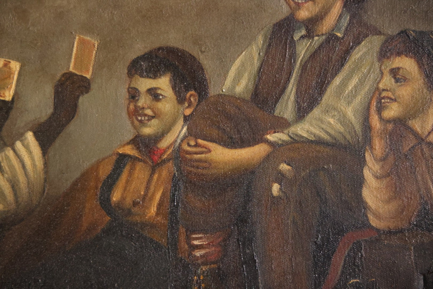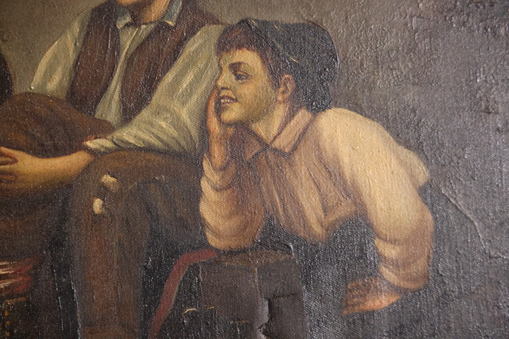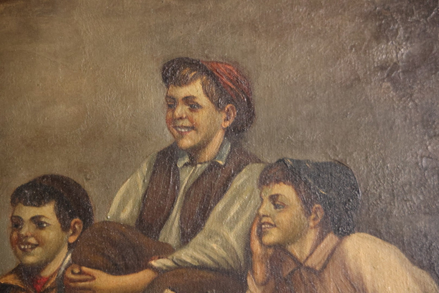 Antique Oil On Canvas Painting Titled "The Card Trick" After John George Brown, Little Boy Showing Off Card Trick To Young Friends, Artist Signed Lower Right, Illegible, In Ornate Frame With Title Plaque, Note Holes, Damage, 37-1/2" x 27-1/2"