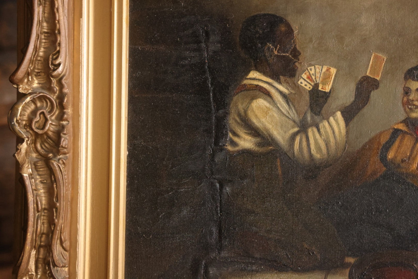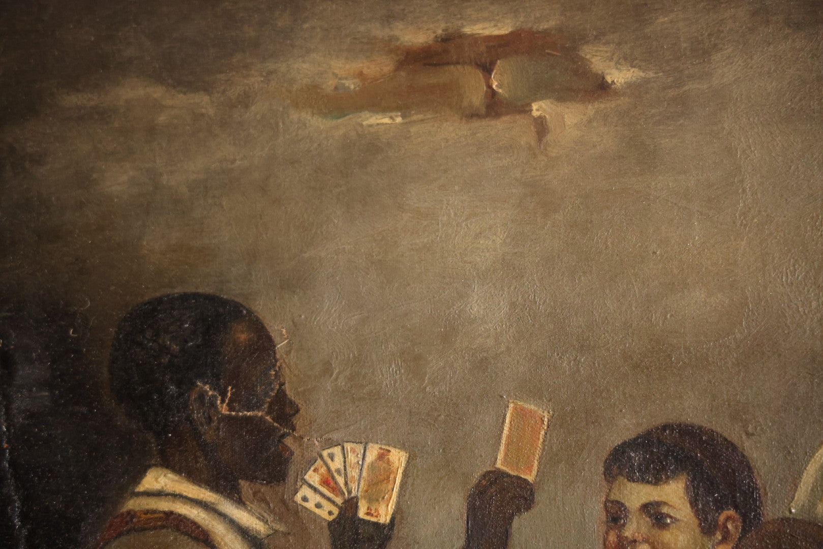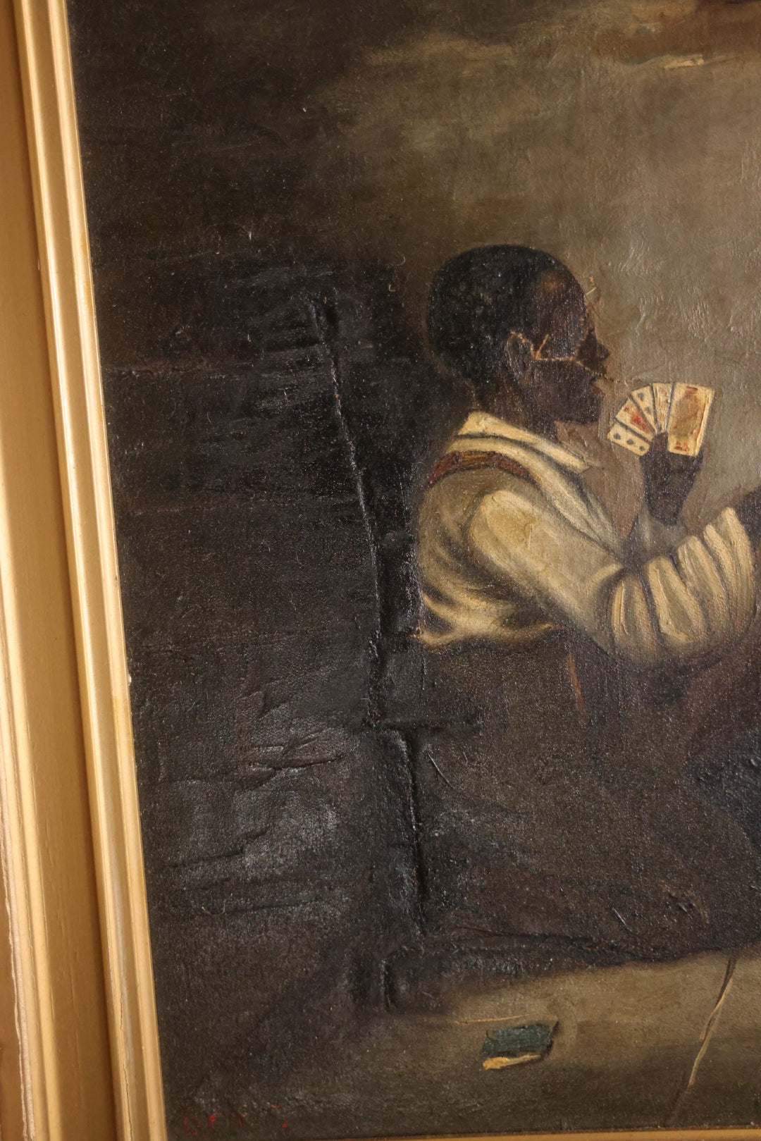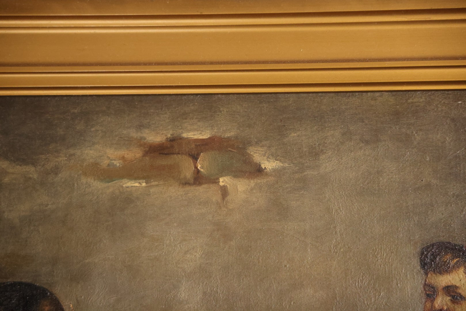 Antique Oil On Canvas Painting Titled "The Card Trick" After John George Brown, Little Boy Showing Off Card Trick To Young Friends, Artist Signed Lower Right, Illegible, In Ornate Frame With Title Plaque, Note Holes, Damage, 37-1/2" x 27-1/2"