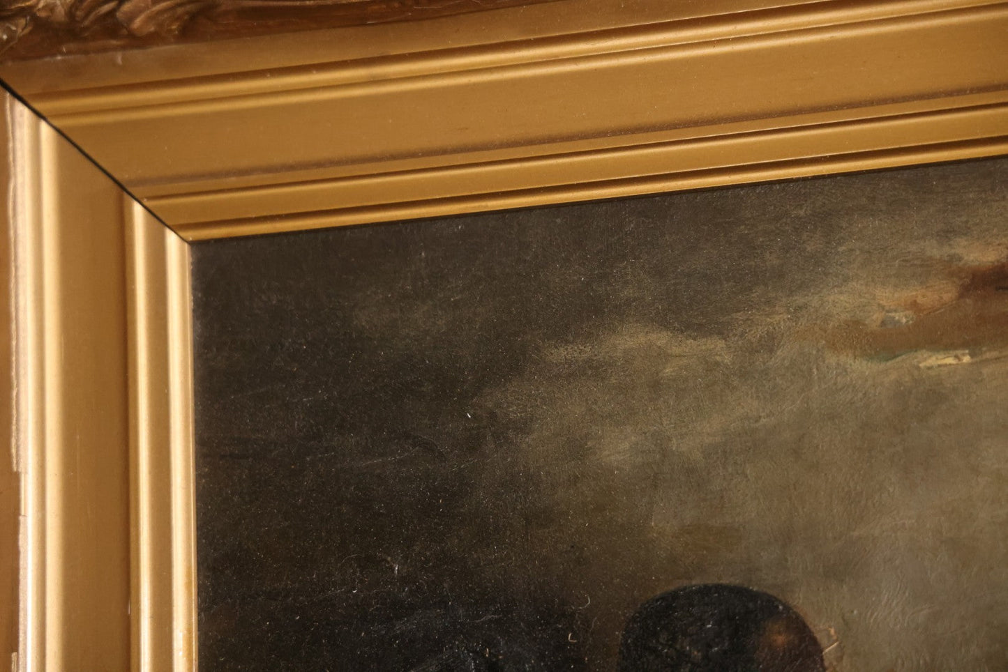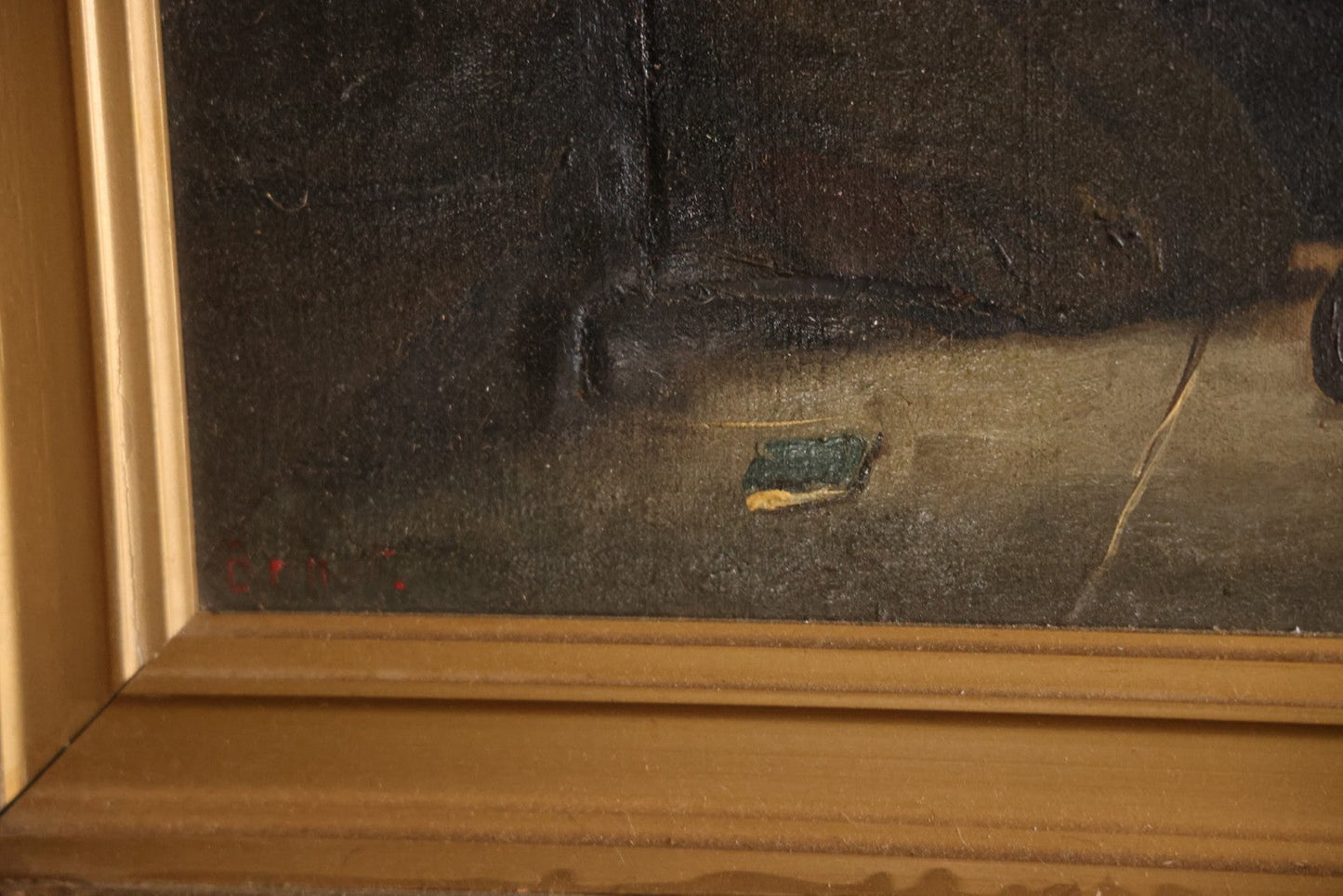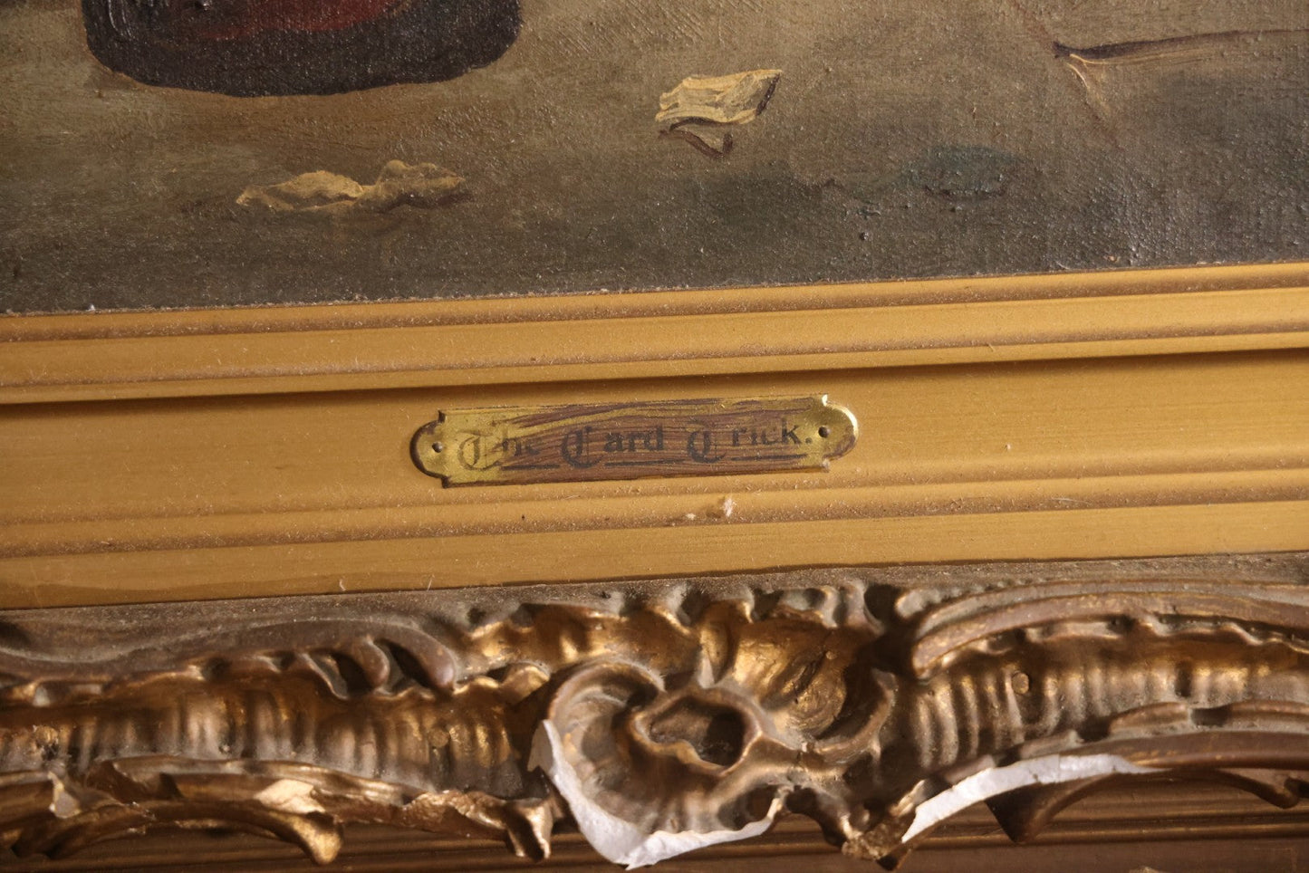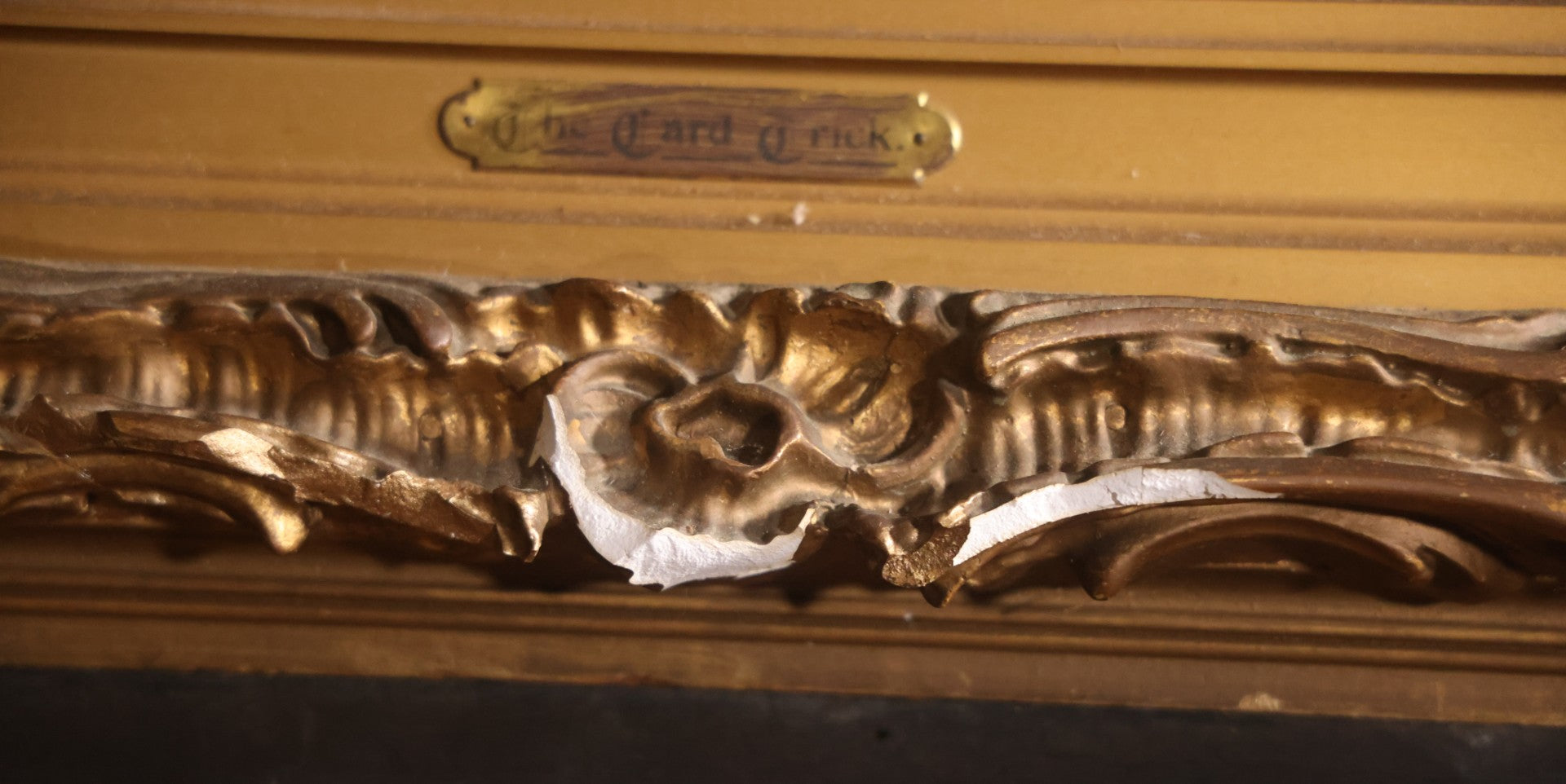 Antique Oil On Canvas Painting Titled "The Card Trick" After John George Brown, Little Boy Showing Off Card Trick To Young Friends, Artist Signed Lower Right, Illegible, In Ornate Frame With Title Plaque, Note Holes, Damage, 37-1/2" x 27-1/2"