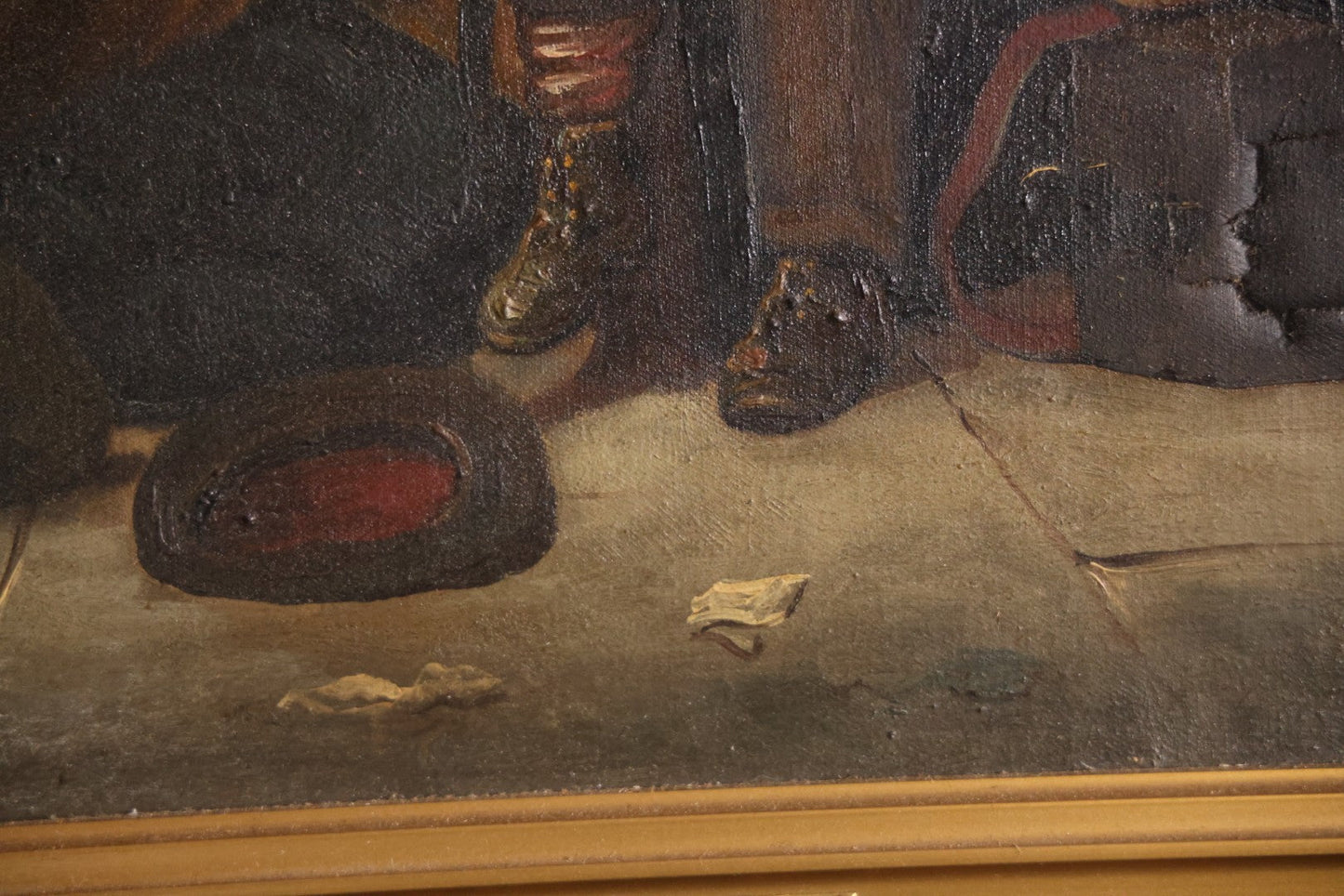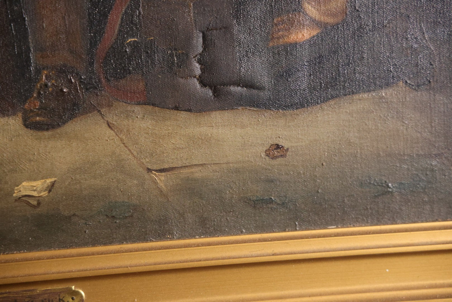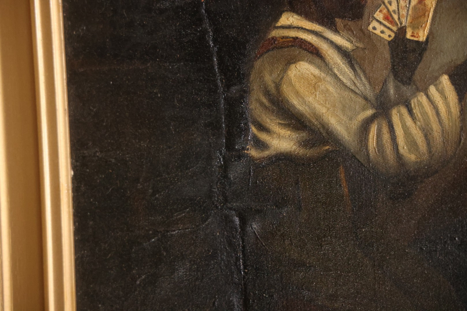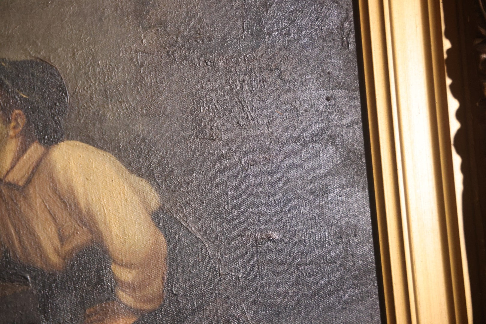Holes, tears, wear, and damage throughout the canvas, including a hole/tear in the middle of the face of the young boy performing the trick. Large repaired tear, down left side. Various wear and tear, losses to gesso throughout frame.