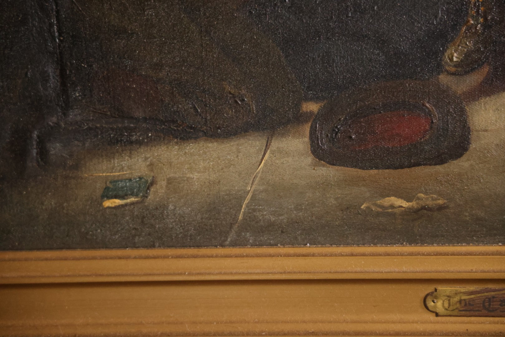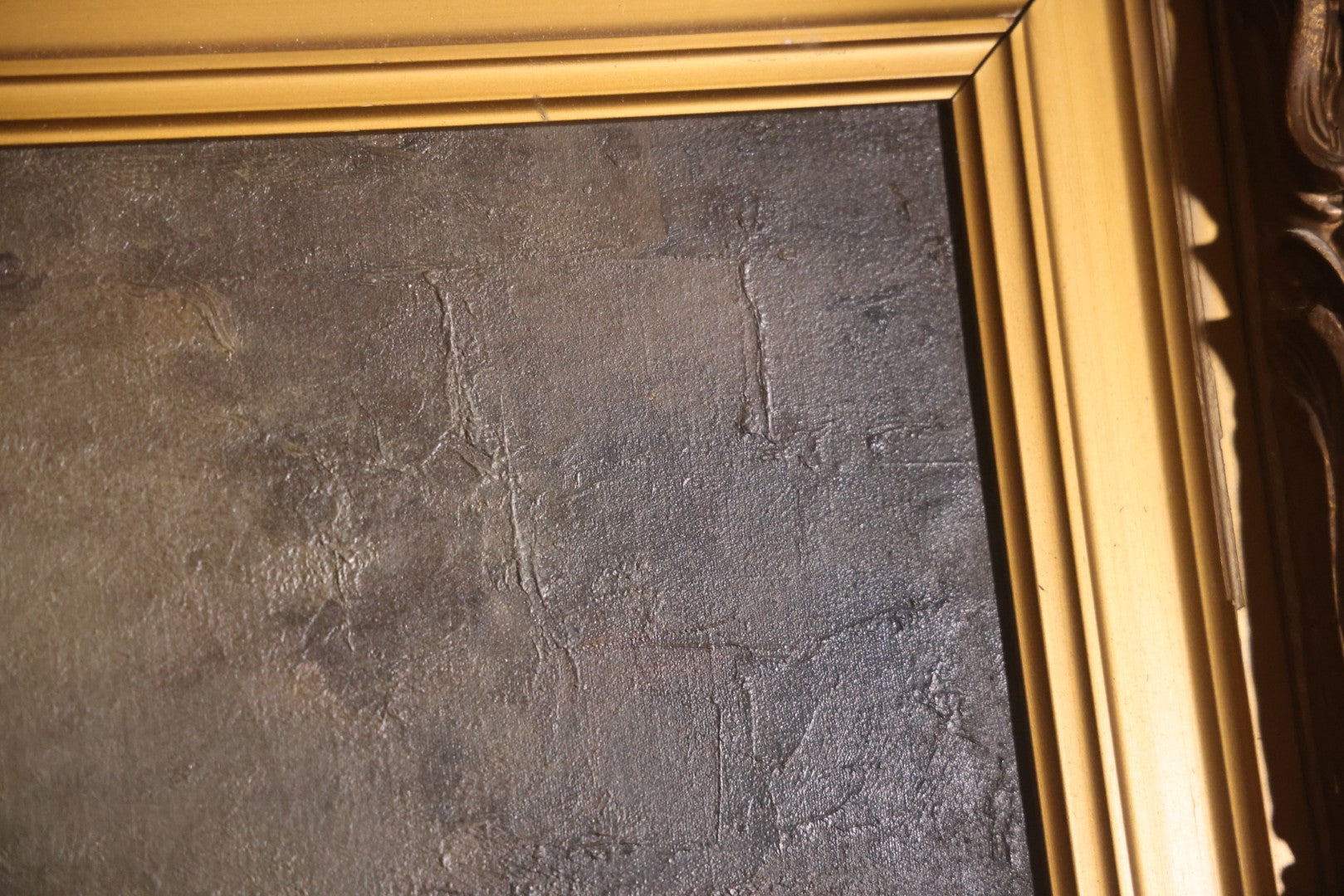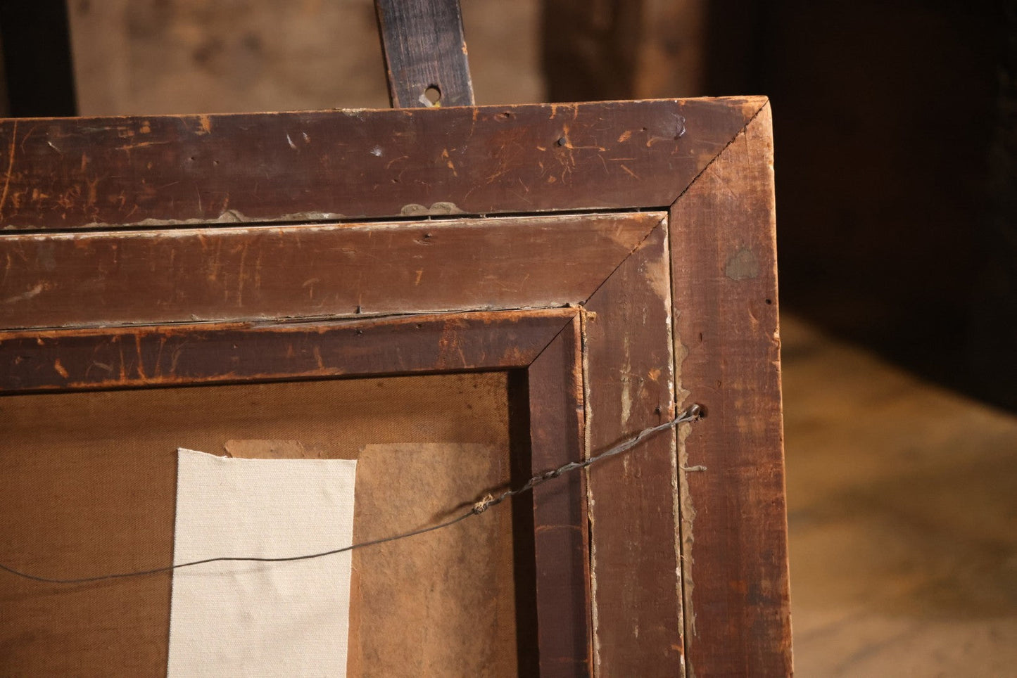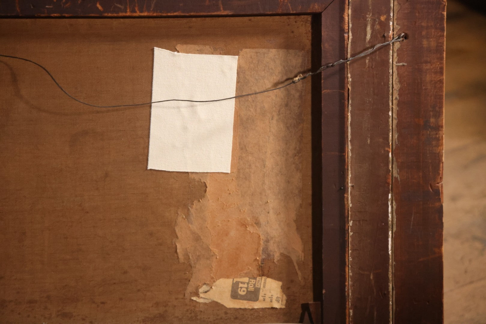 Holes, tears, wear, and damage throughout the canvas, including a hole/tear in the middle of the face of the young boy performing the trick. Large repaired tear, down left side. Various wear and tear, losses to gesso throughout frame.
