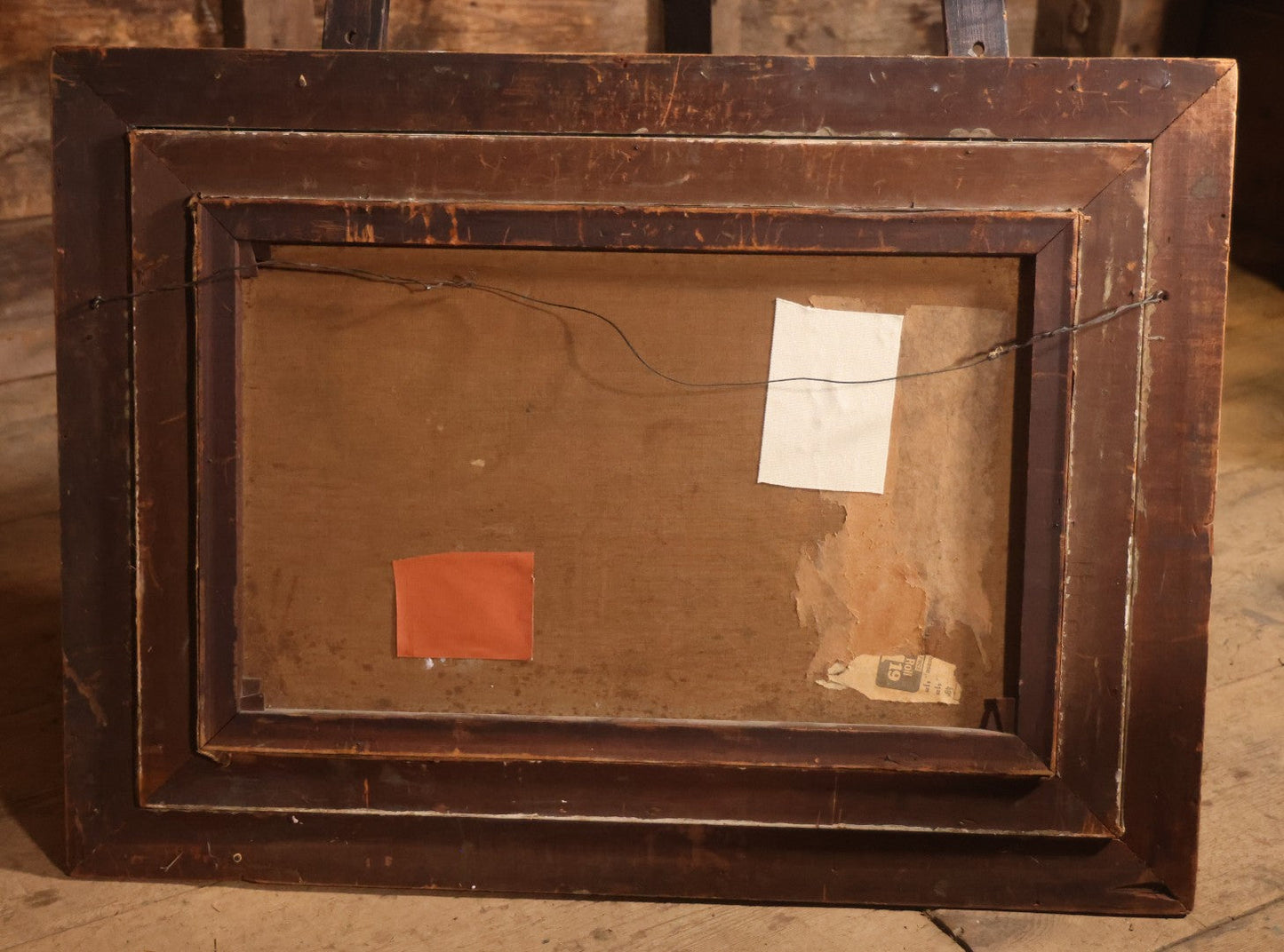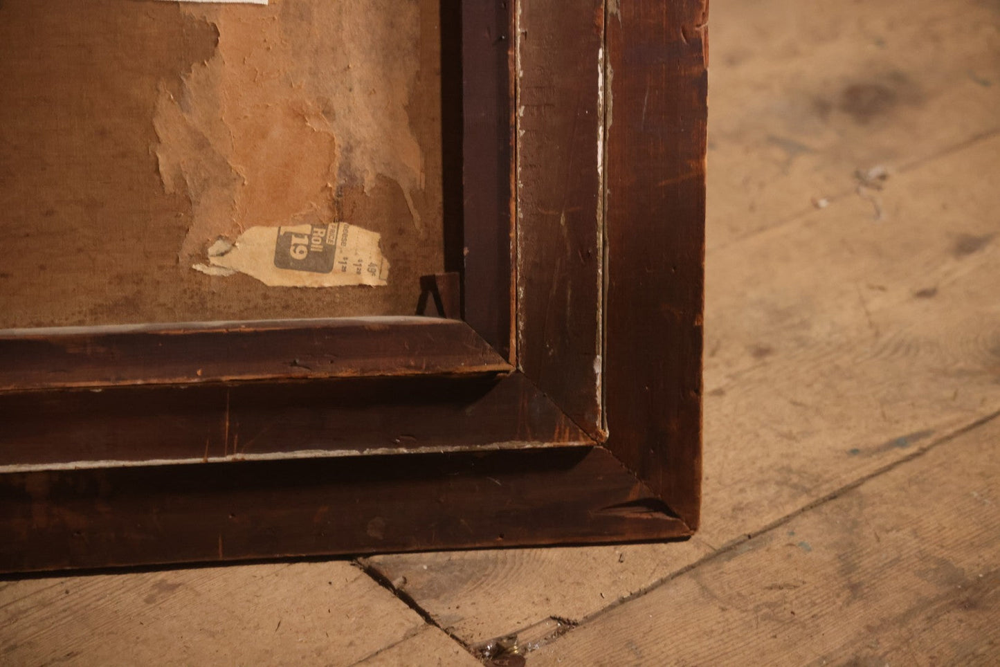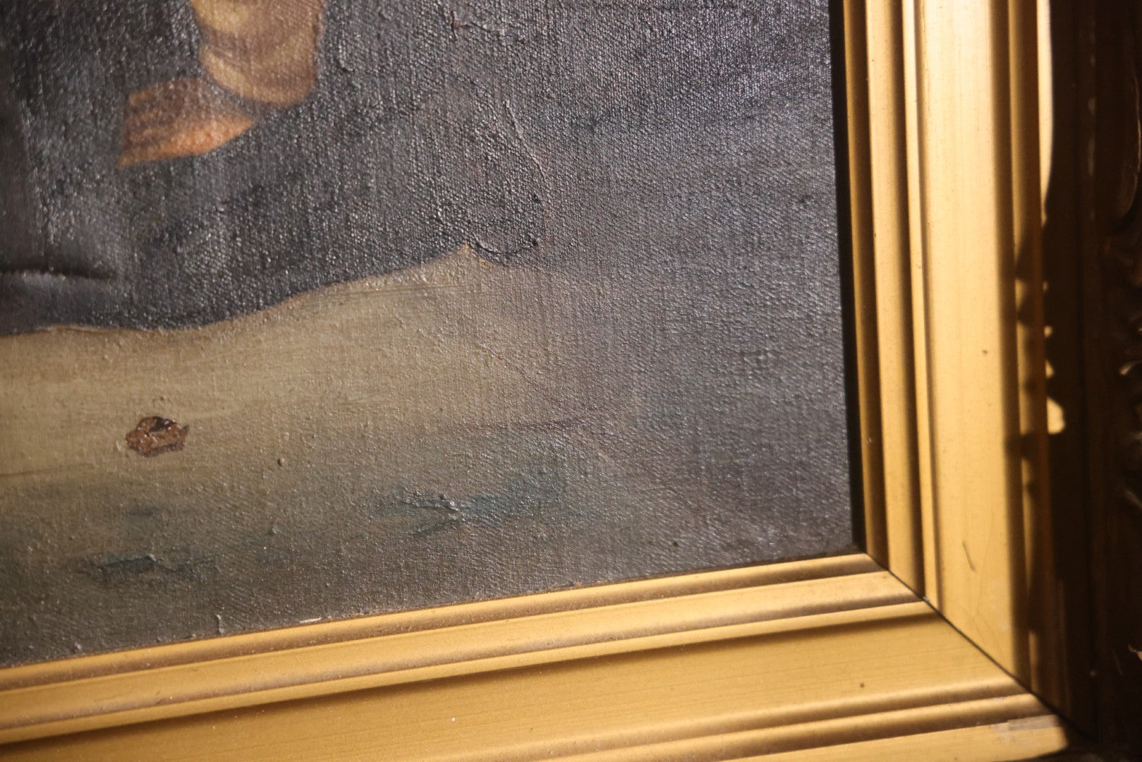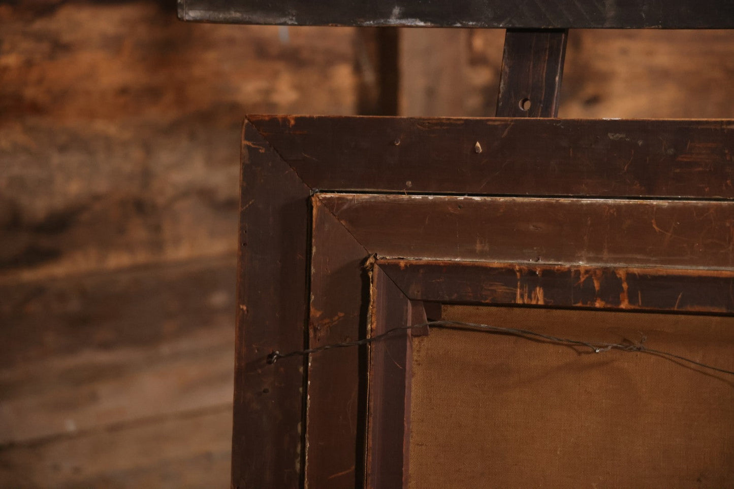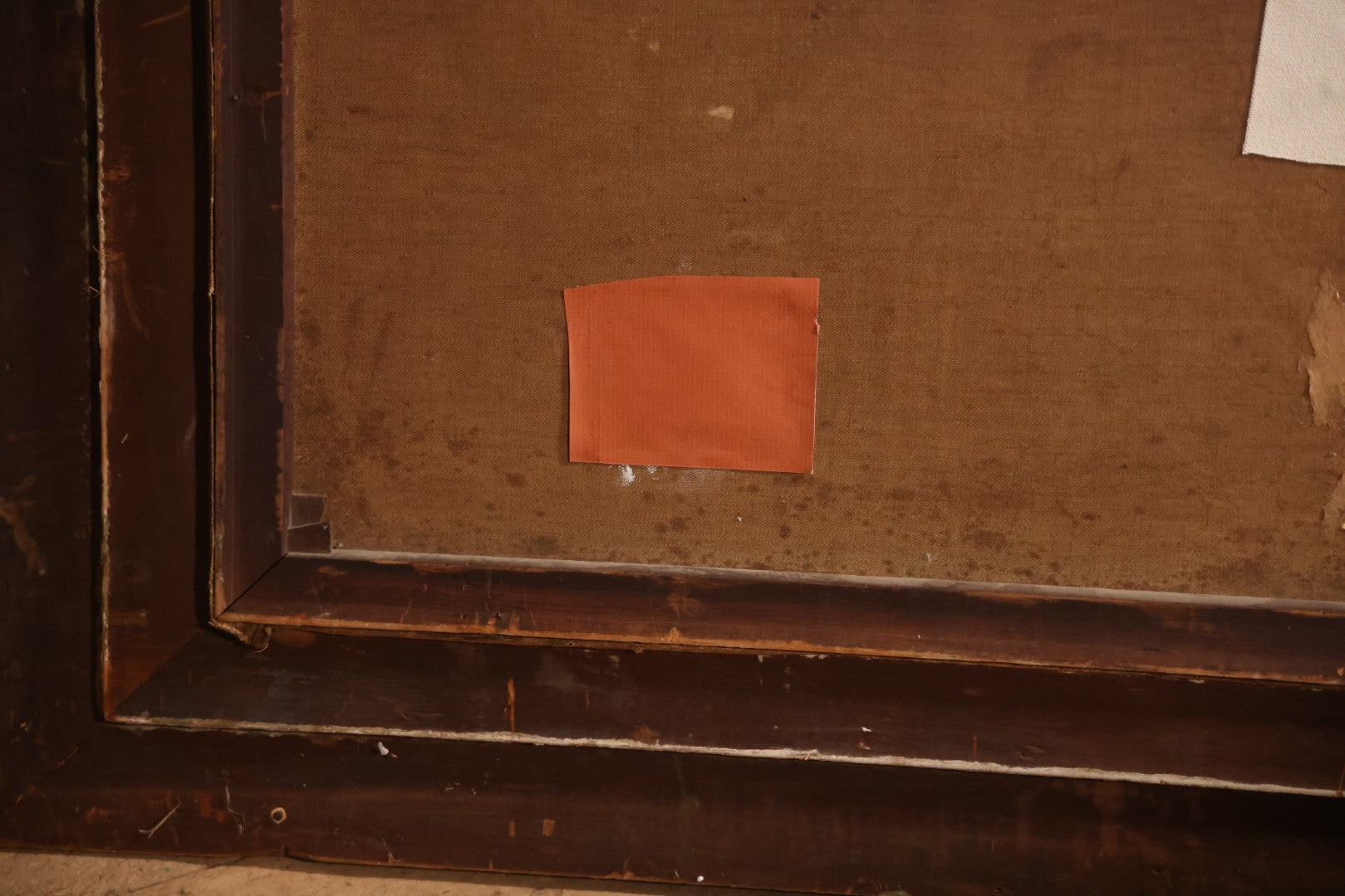Holes, tears, wear, and damage throughout the canvas, including a hole/tear in the middle of the face of the young boy performing the trick. Large repaired tear, down left side. Various wear and tear, losses to gesso throughout frame.