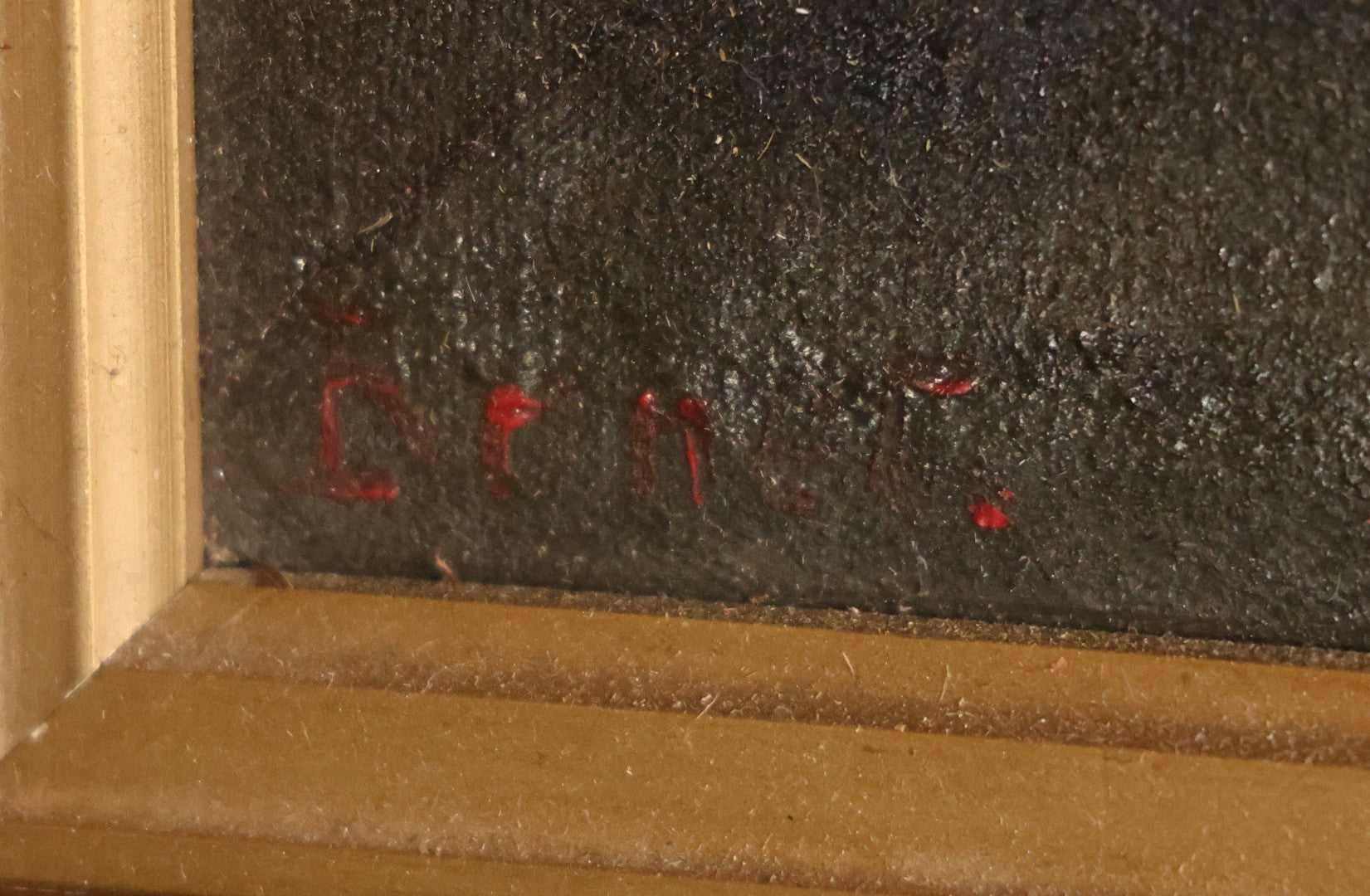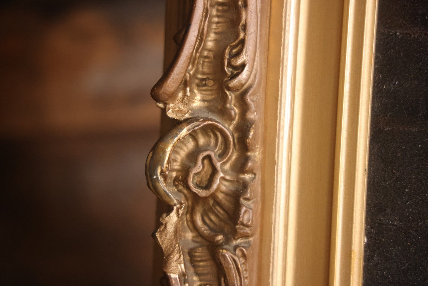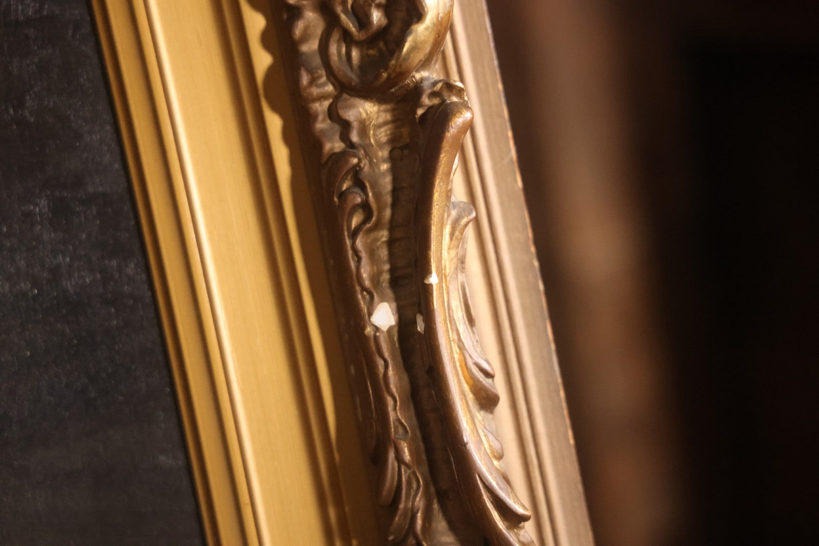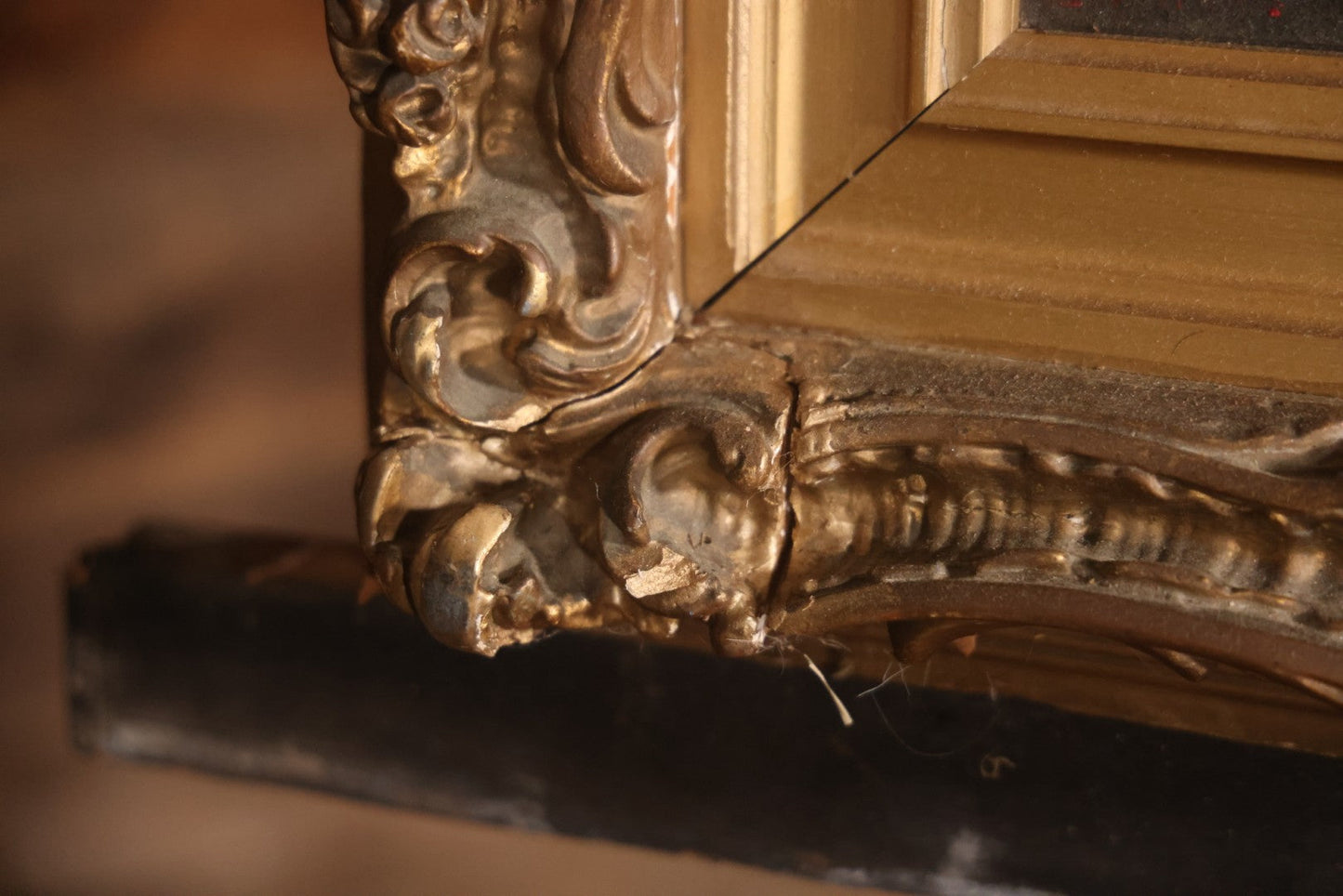 Holes, tears, wear, and damage throughout the canvas, including a hole/tear in the middle of the face of the young boy performing the trick. Large repaired tear, down left side. Various wear and tear, losses to gesso throughout frame.