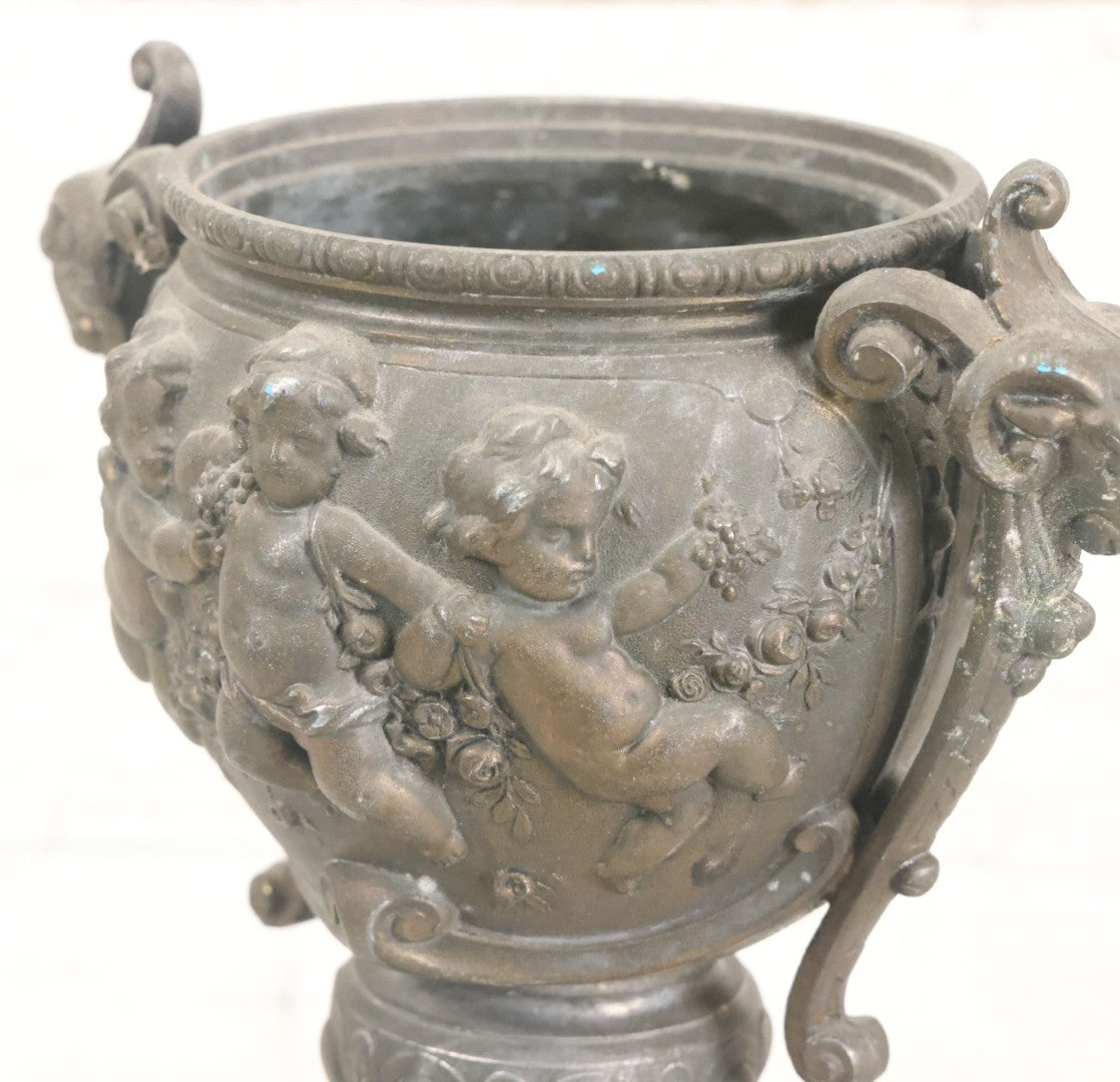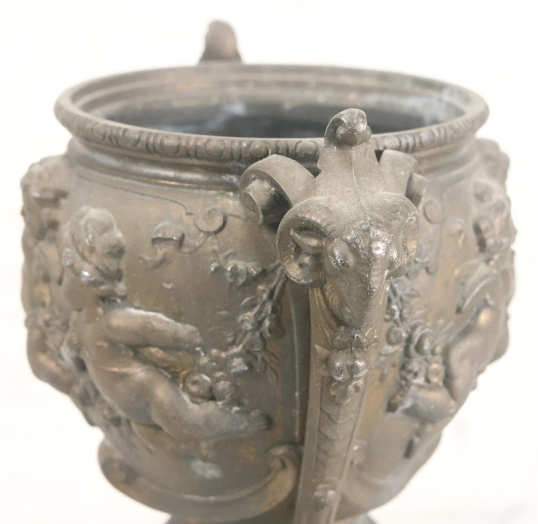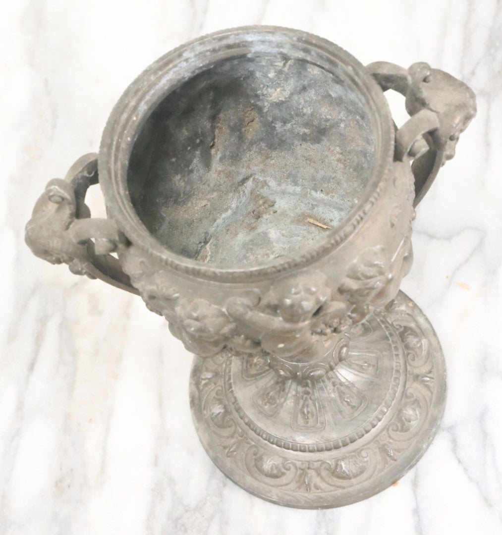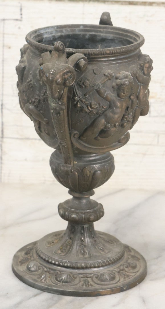 Lot 010 - Antique Ornate Cast Pot Metal Urn With Cherub And Goat Head Motifs, With Makers Mark On Bottom, Marked No. 1409, 9-1/2" High