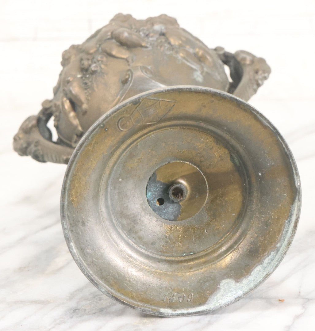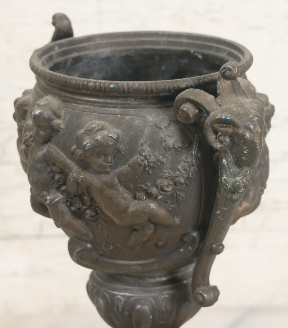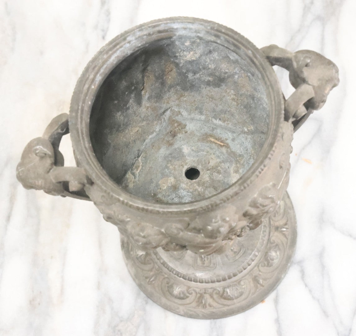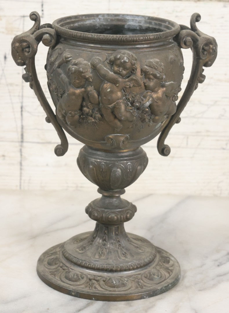 Lot 010 - Antique Ornate Cast Pot Metal Urn With Cherub And Goat Head Motifs, With Makers Mark On Bottom, Marked No. 1409, 9-1/2" High