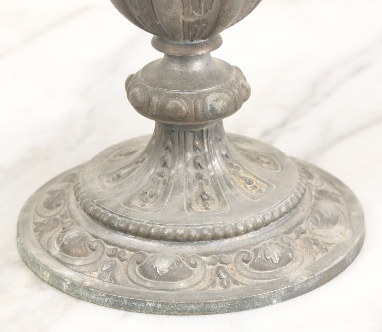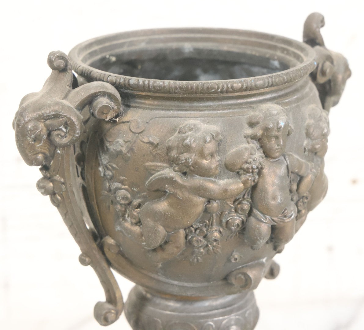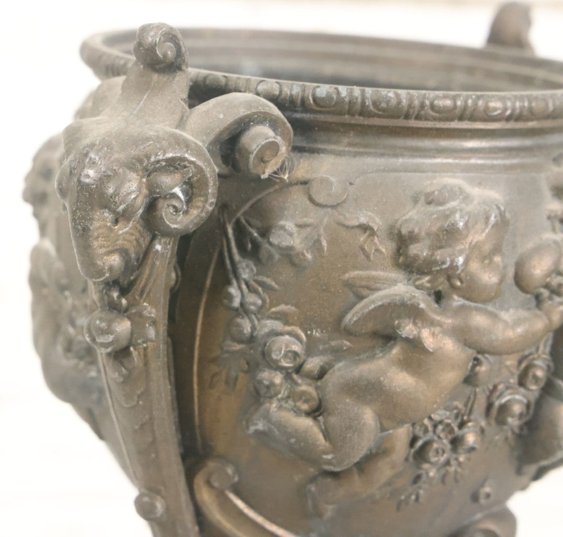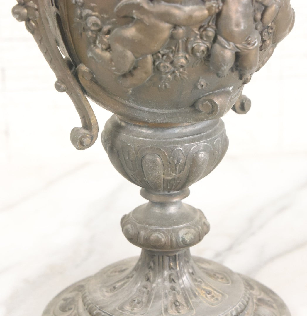 Lot 010 - Antique Ornate Cast Pot Metal Urn With Cherub And Goat Head Motifs, With Makers Mark On Bottom, Marked No. 1409, 9-1/2" High