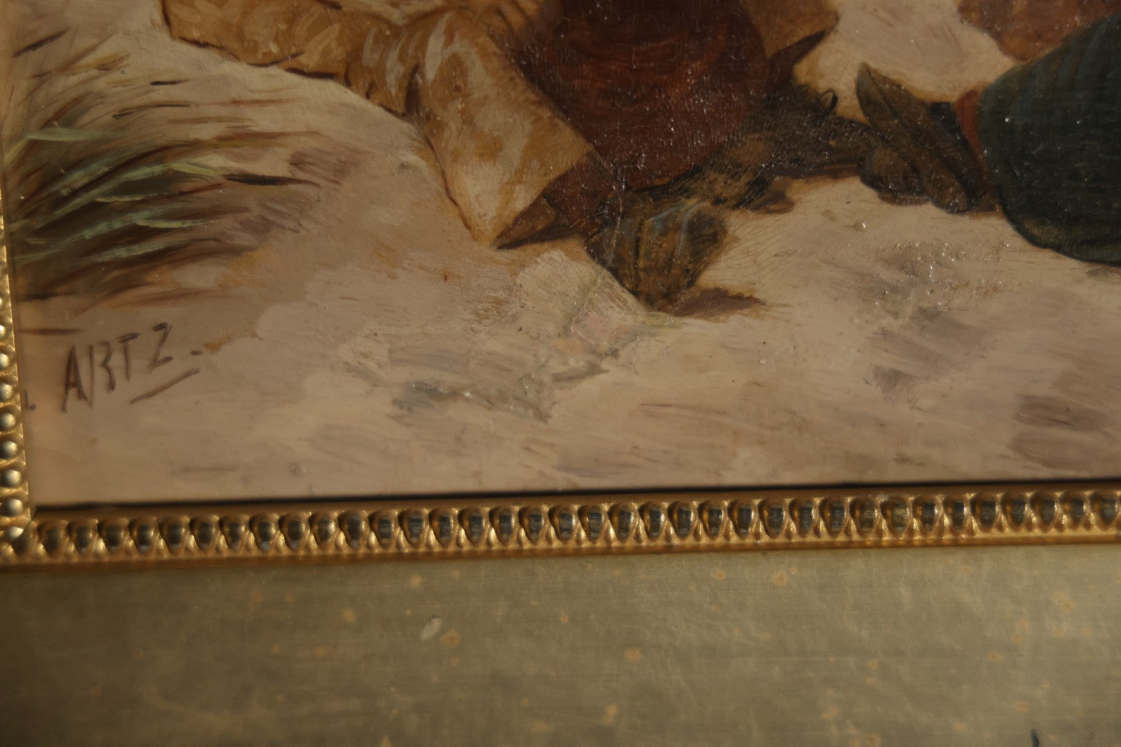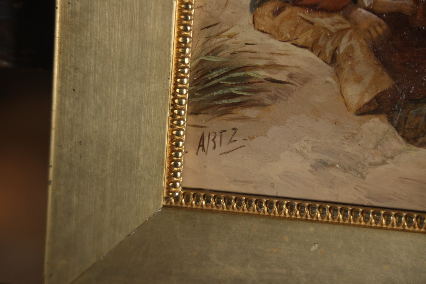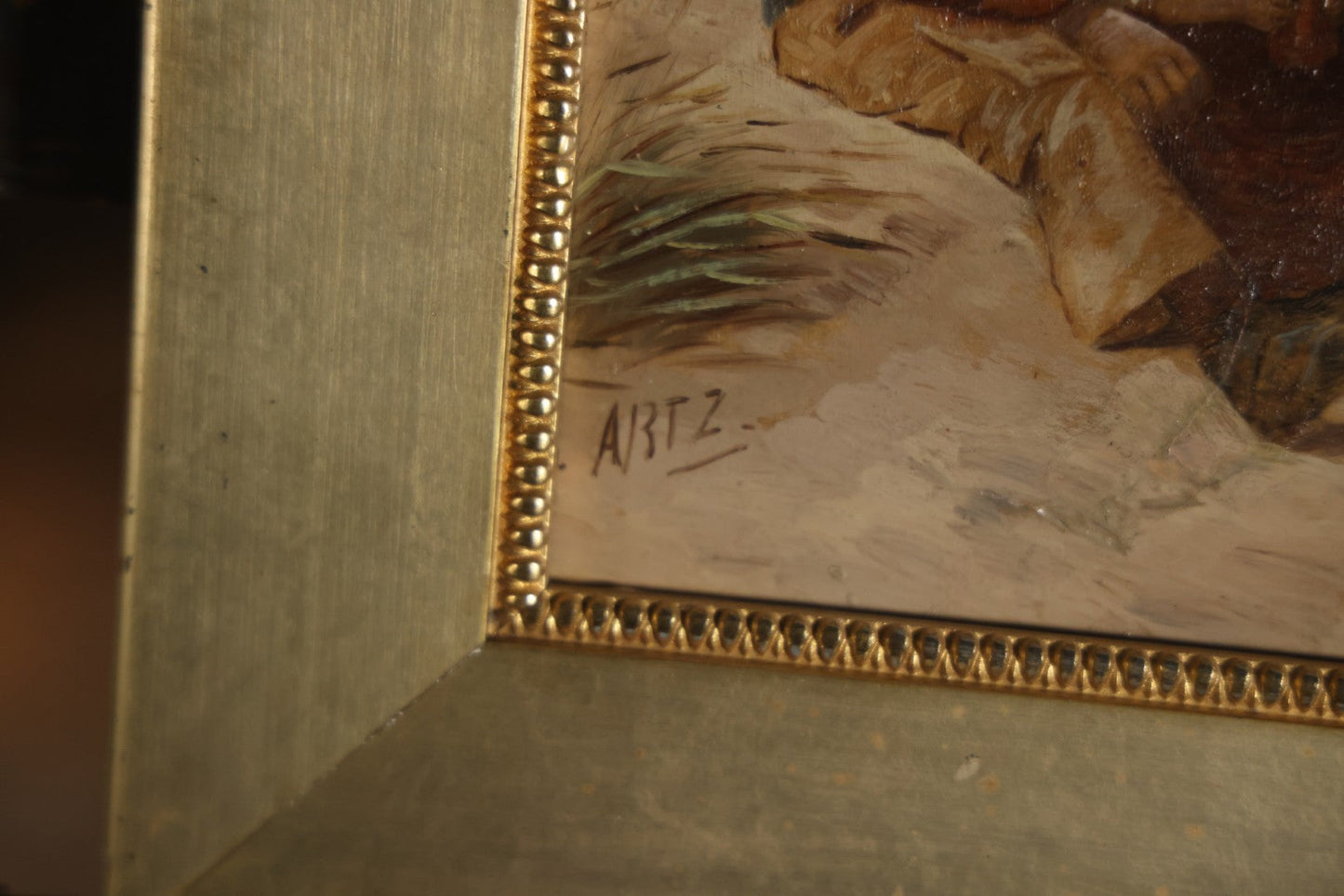There seem to be several versions of this painting bearing the ARTZ signature. Various wear and tear throughout, minor losses.