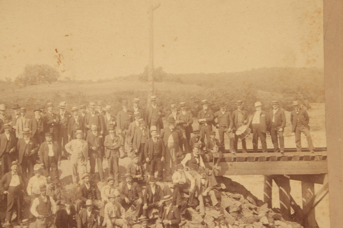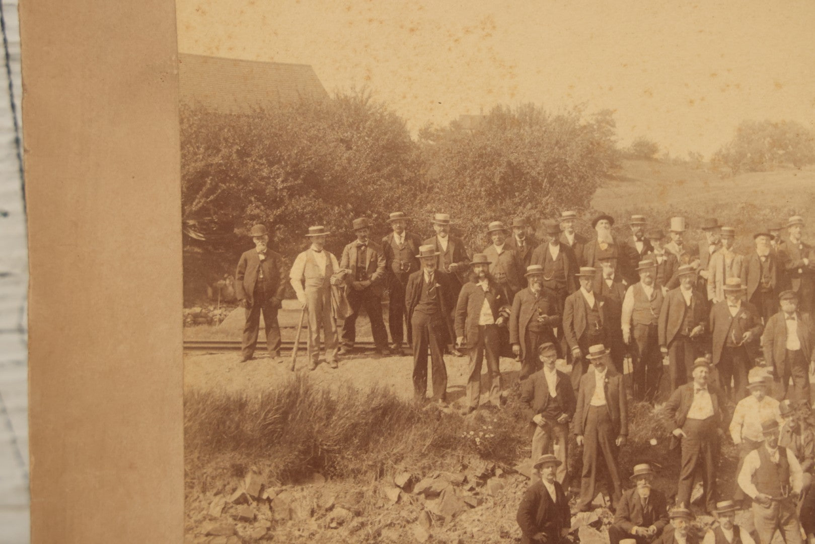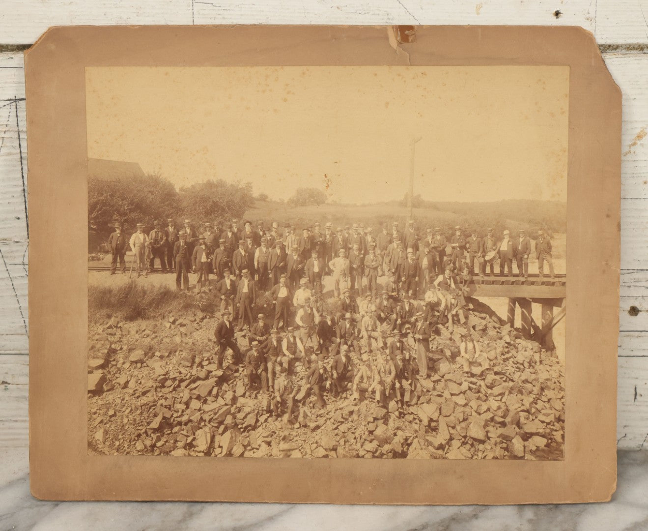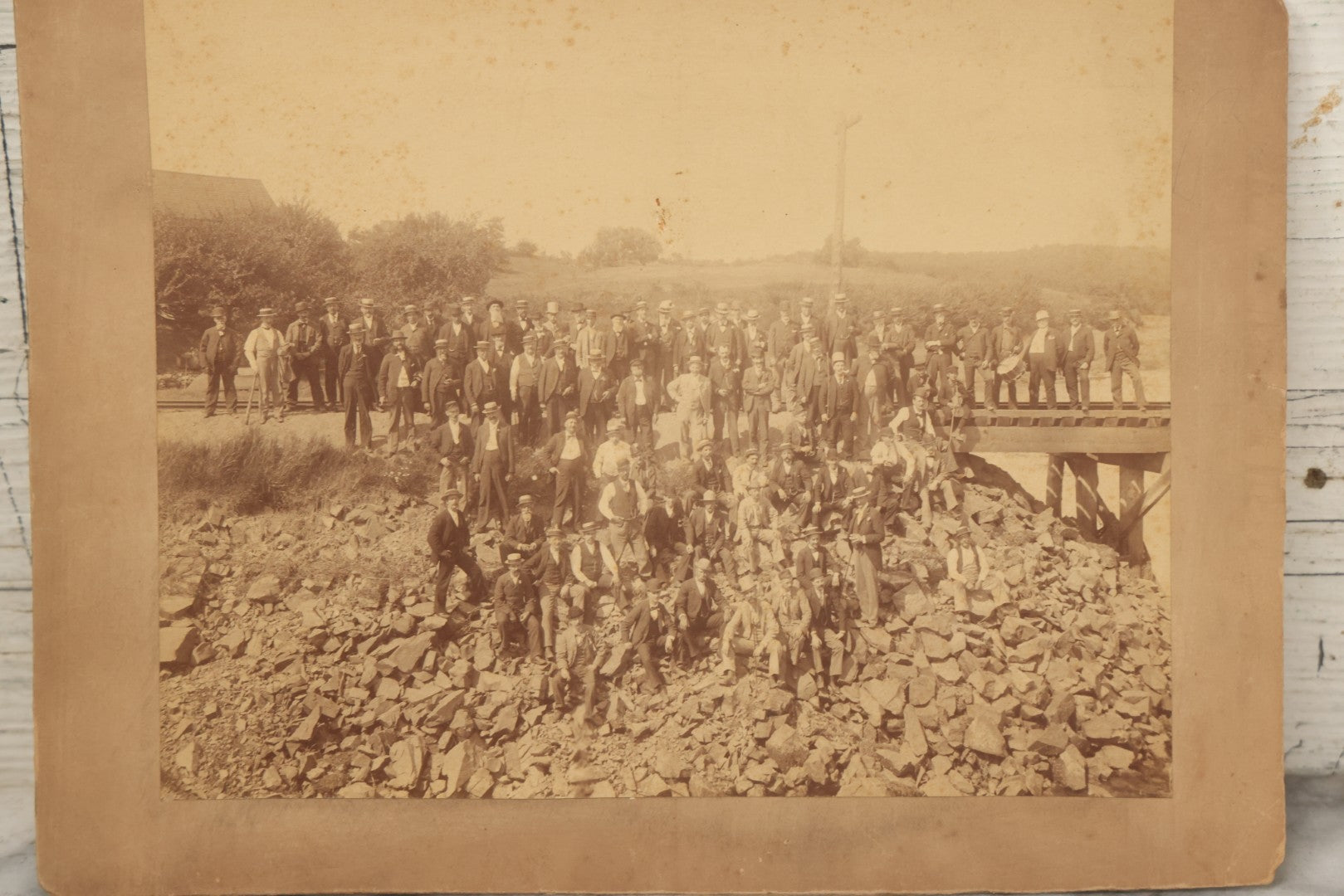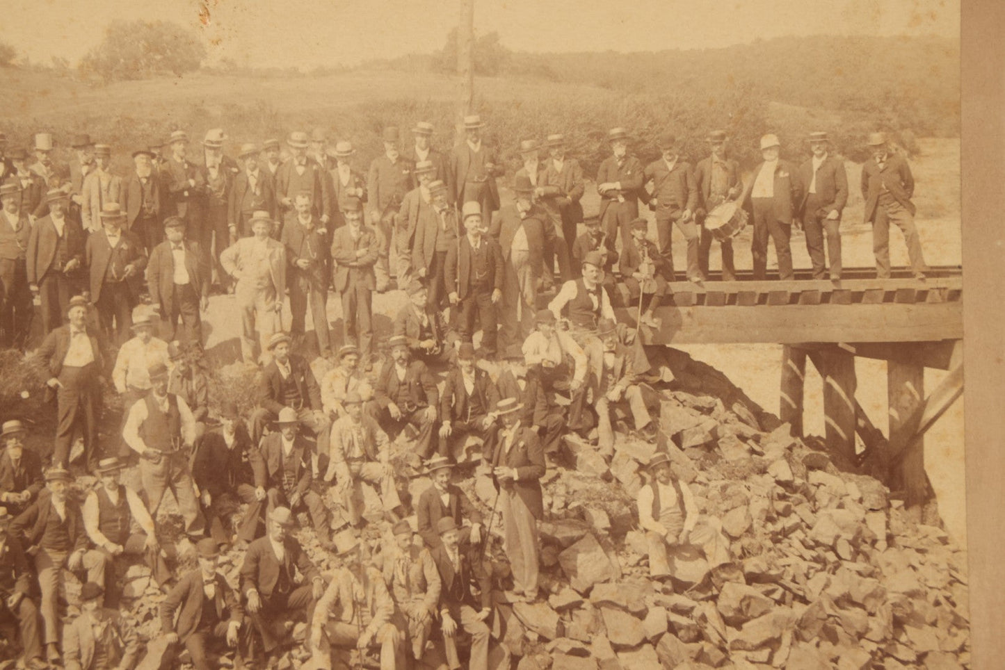 Lot 064 - Antique Photograph Of A Large Group Of Men Posing Next To The Dover Point Trestle Railroad Train Bridge, Dover, New Hampshire, With Detailed Identification On Verso, 1892
