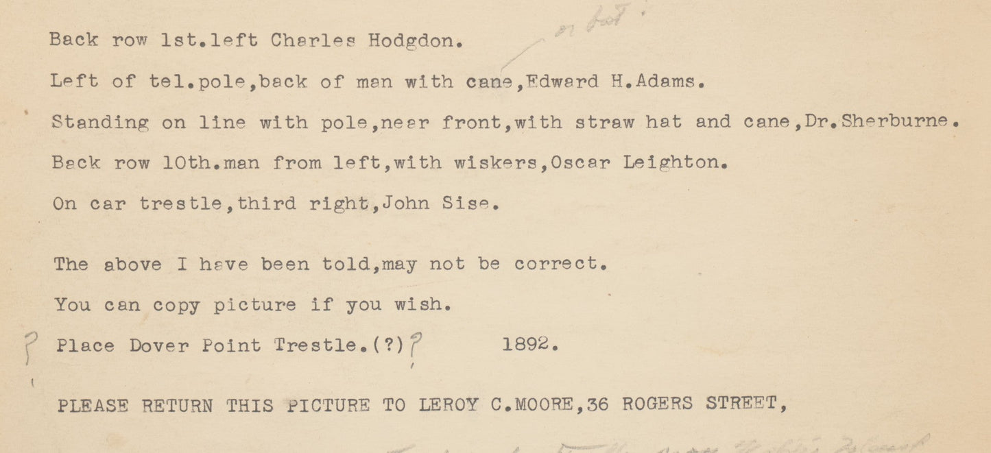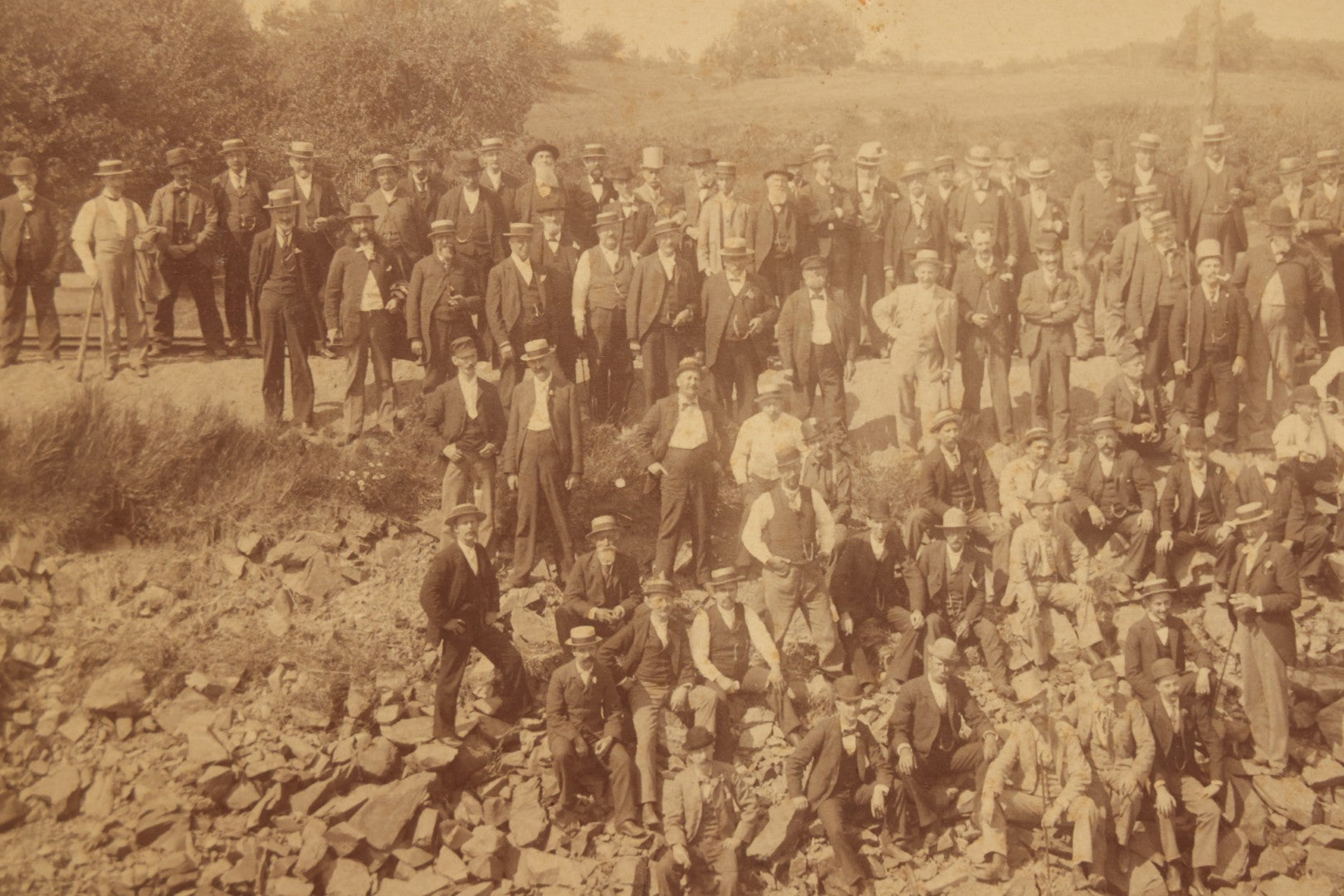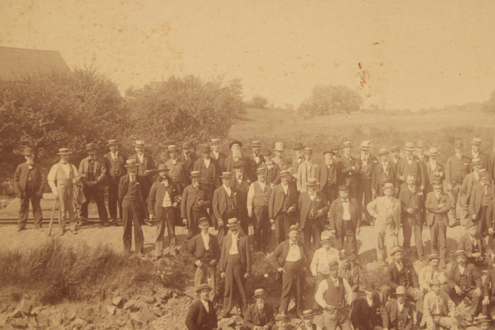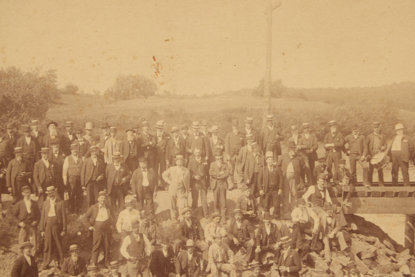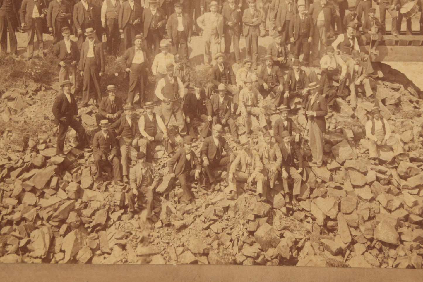 Lot 064 - Antique Photograph Of A Large Group Of Men Posing Next To The Dover Point Trestle Railroad Train Bridge, Dover, New Hampshire, With Detailed Identification On Verso, 1892