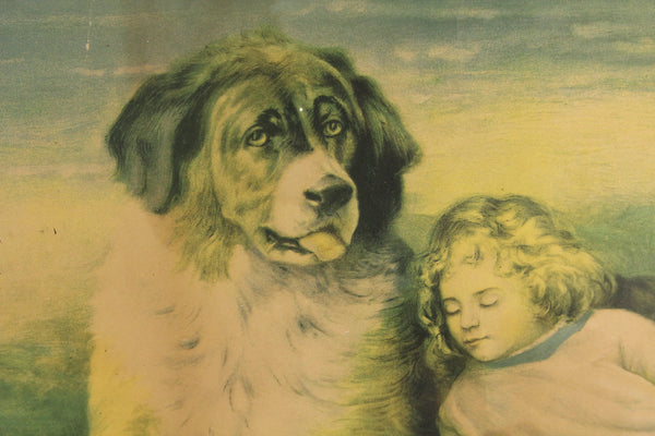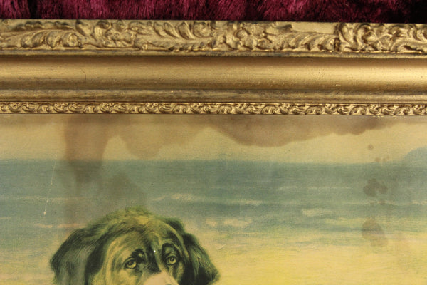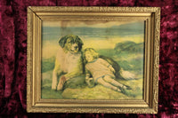 Here is a large antique print of a young girl resting on her Saint Bernard dog in an ornate gold frame. The print shows signs of wear and fading, including some water damage. It is nonetheless charming and ready to hang. The frame measures 21.75" x 17.75".