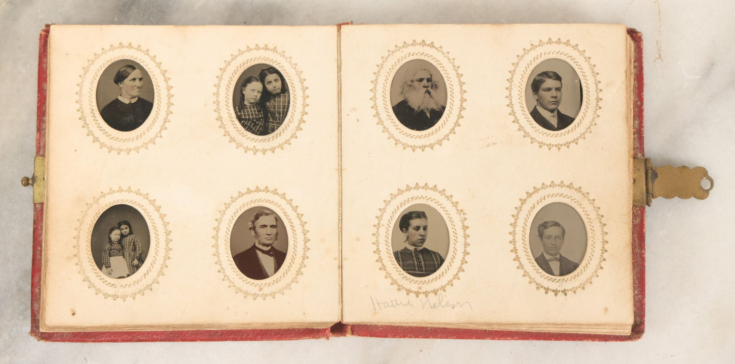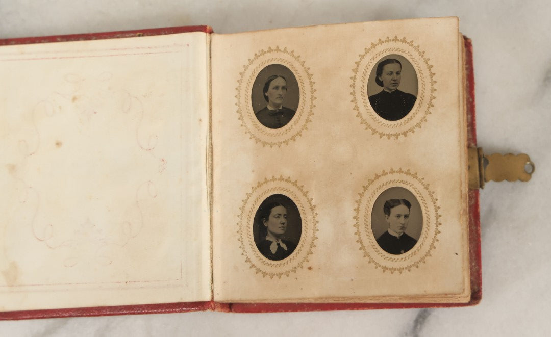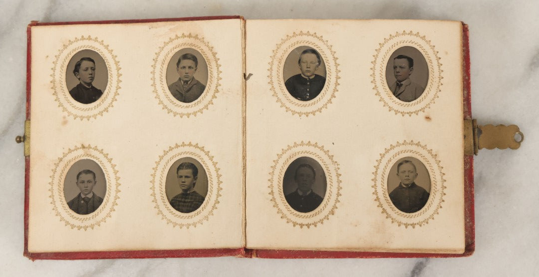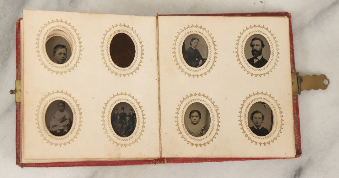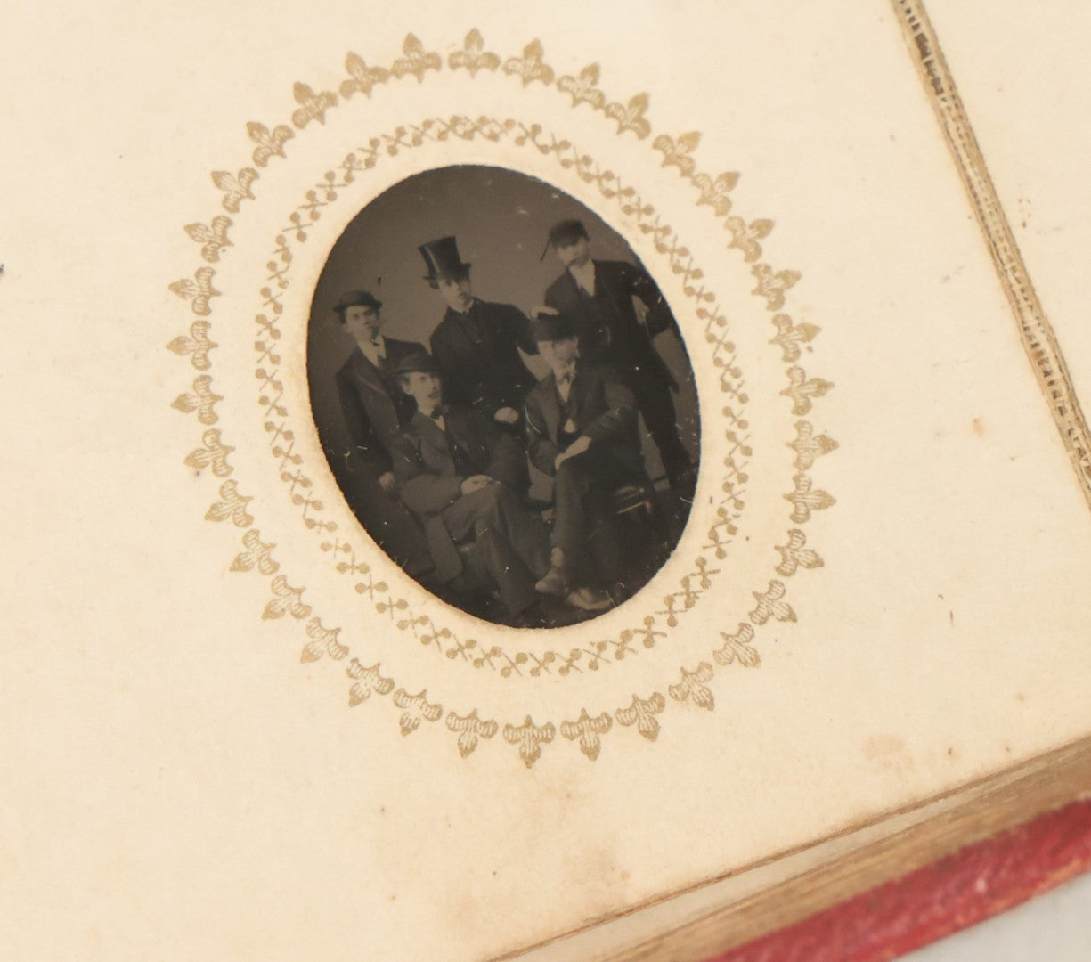 Lot 079 - Antique Red Gem Tintype Photograph Album Containing 70+ Photos, Including Three Dapper Young Men Smoking, Many Identified (All Pages Pictured)