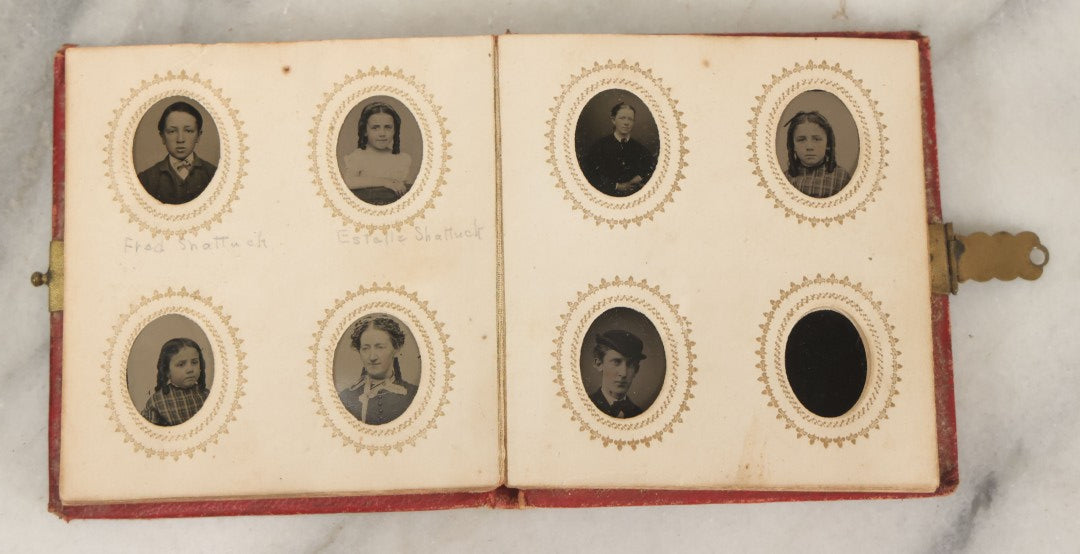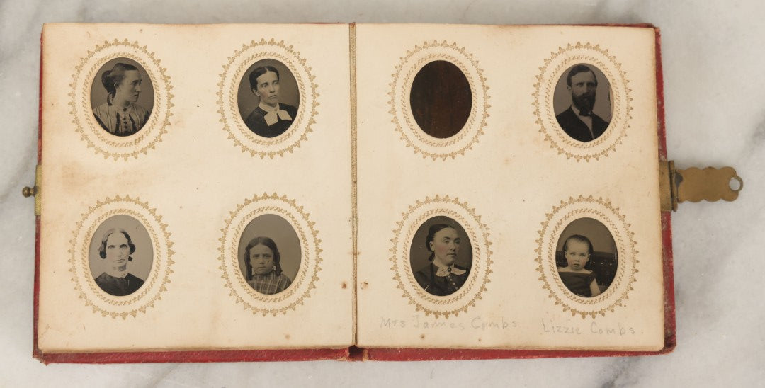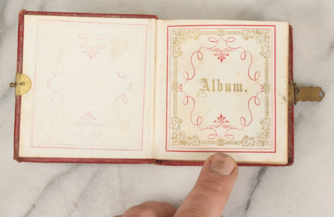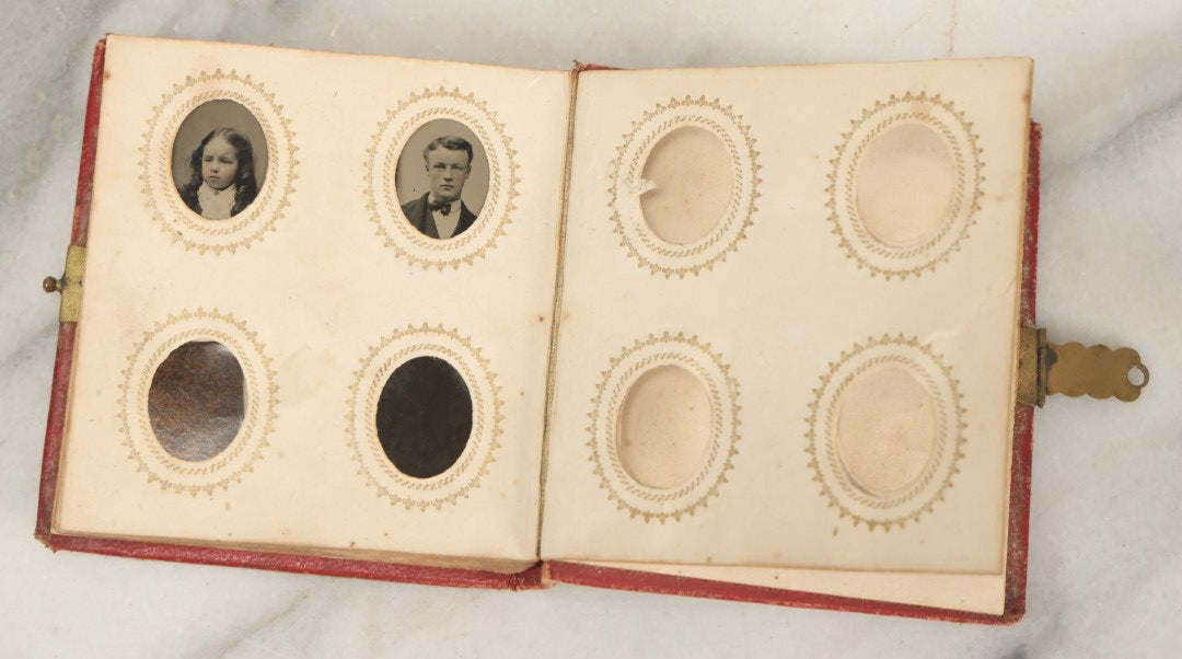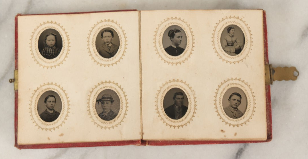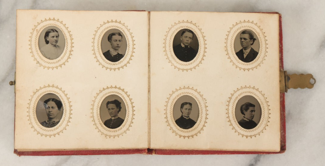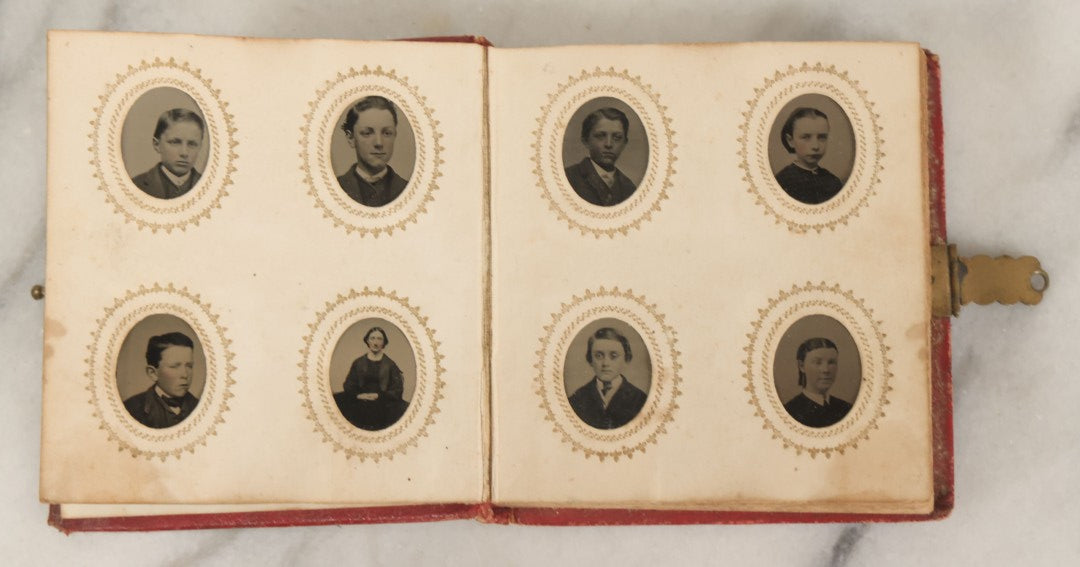 Lot 079 - Antique Red Gem Tintype Photograph Album Containing 70+ Photos, Including Three Dapper Young Men Smoking, Many Identified (All Pages Pictured)