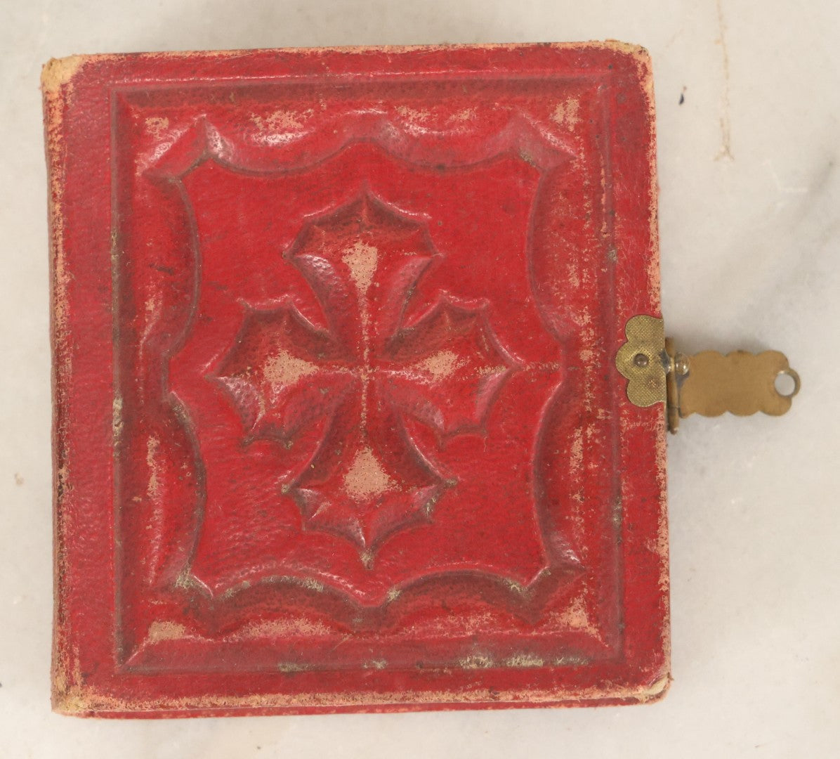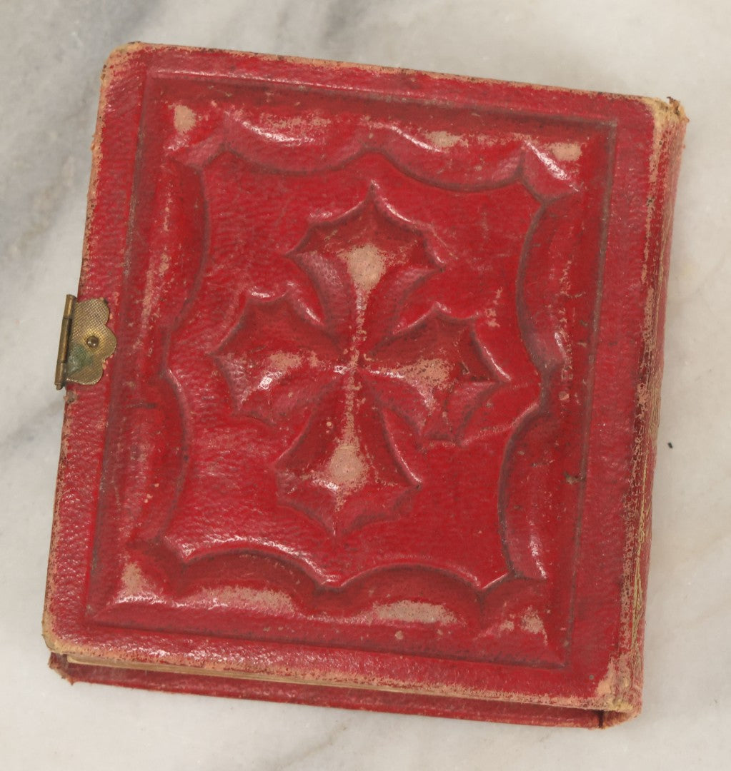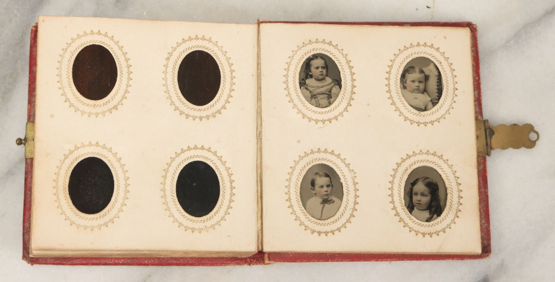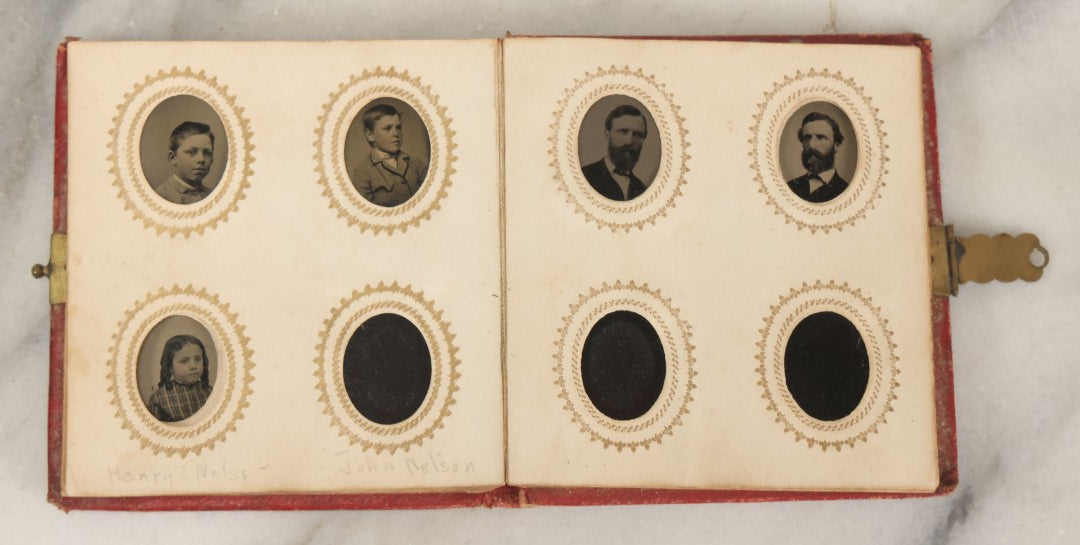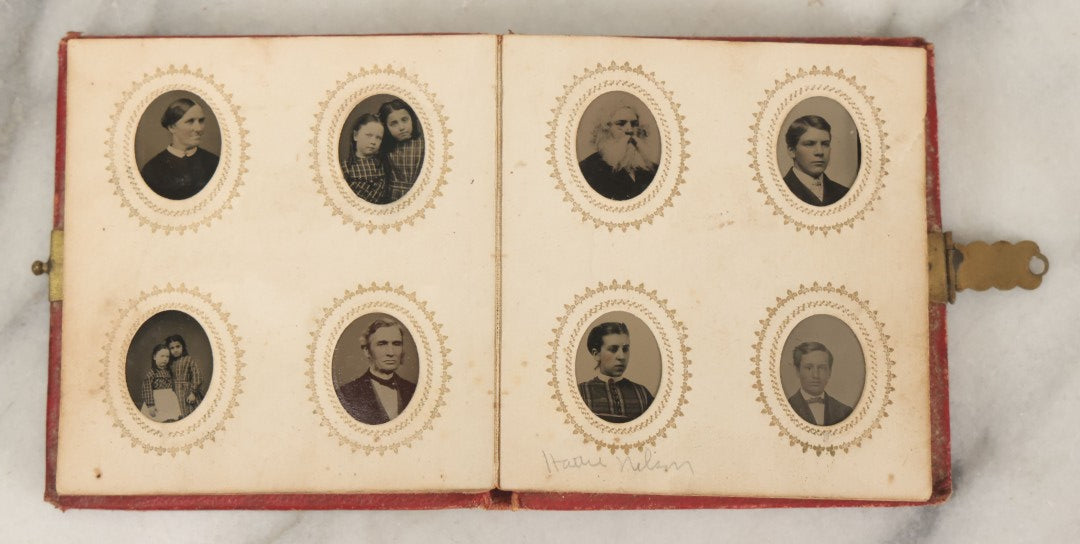 Lot 079 - Antique Red Gem Tintype Photograph Album Containing 70+ Photos, Including Three Dapper Young Men Smoking, Many Identified (All Pages Pictured)