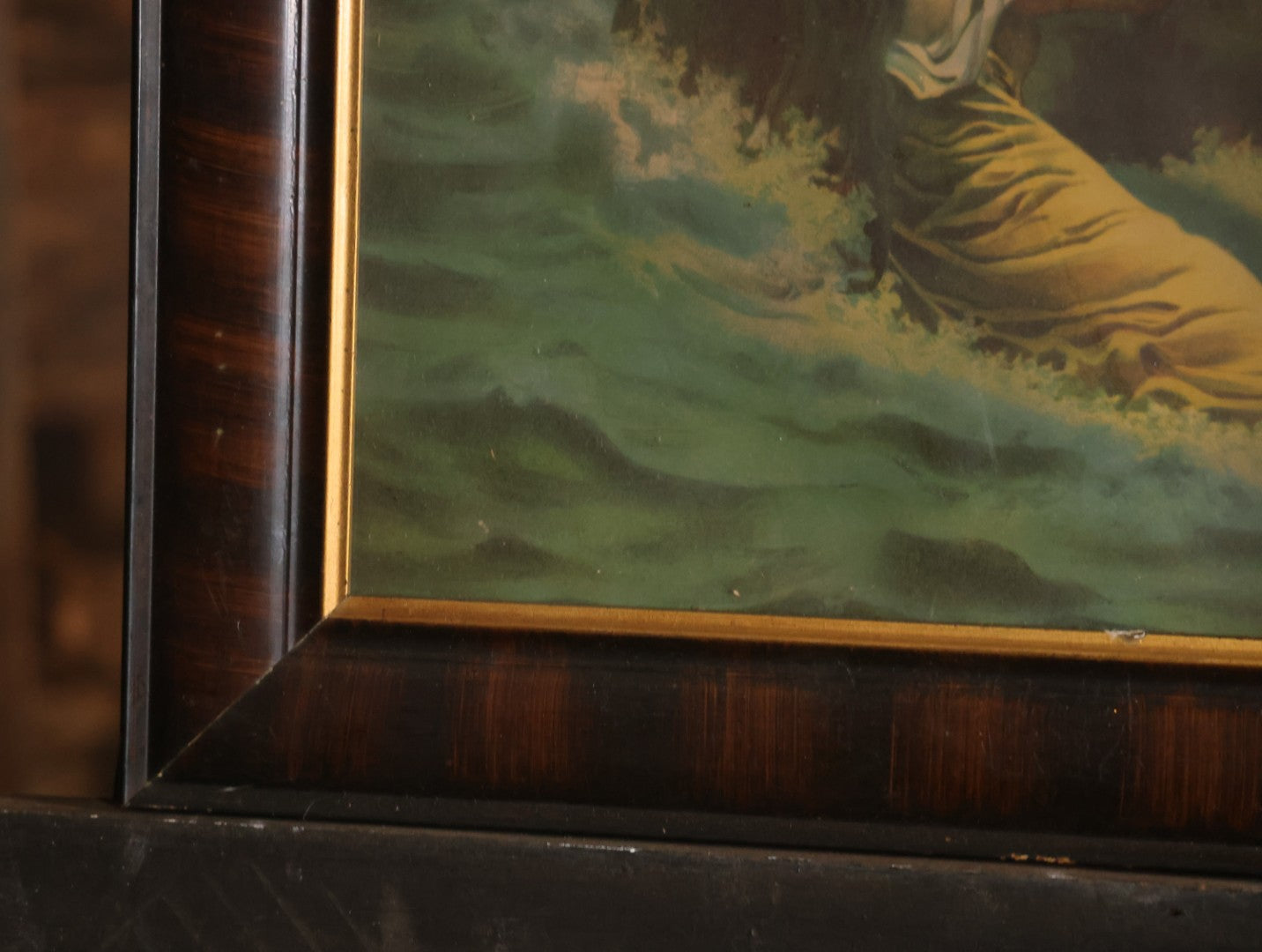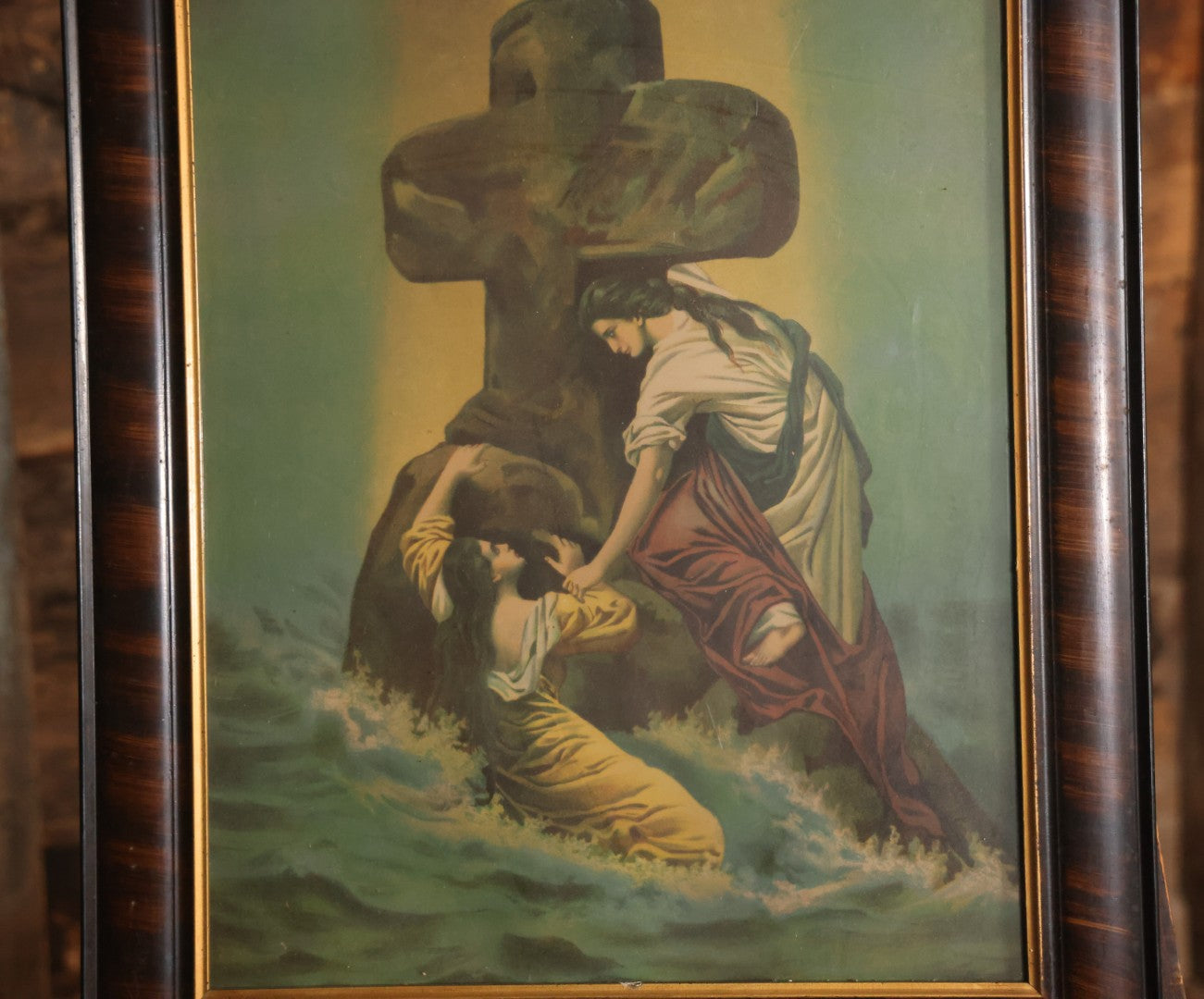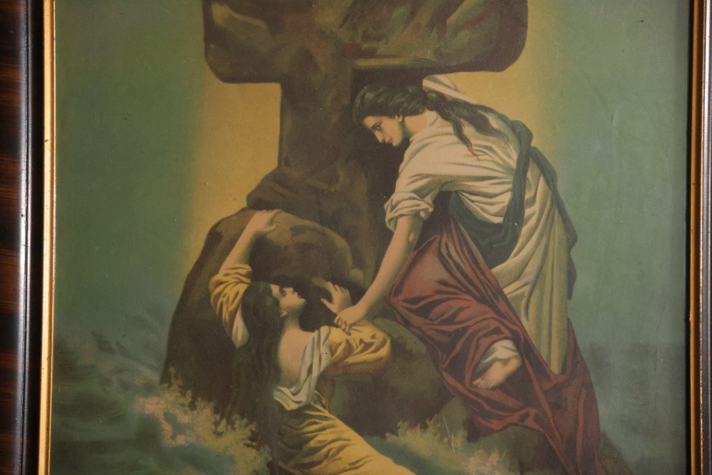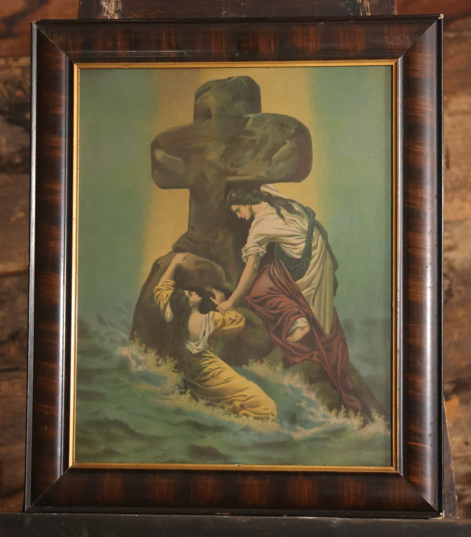 Antique "Rock Of Ages" Chromolithograph Religious Print In Wood Frame, 20-1/2" x 24-1/2"