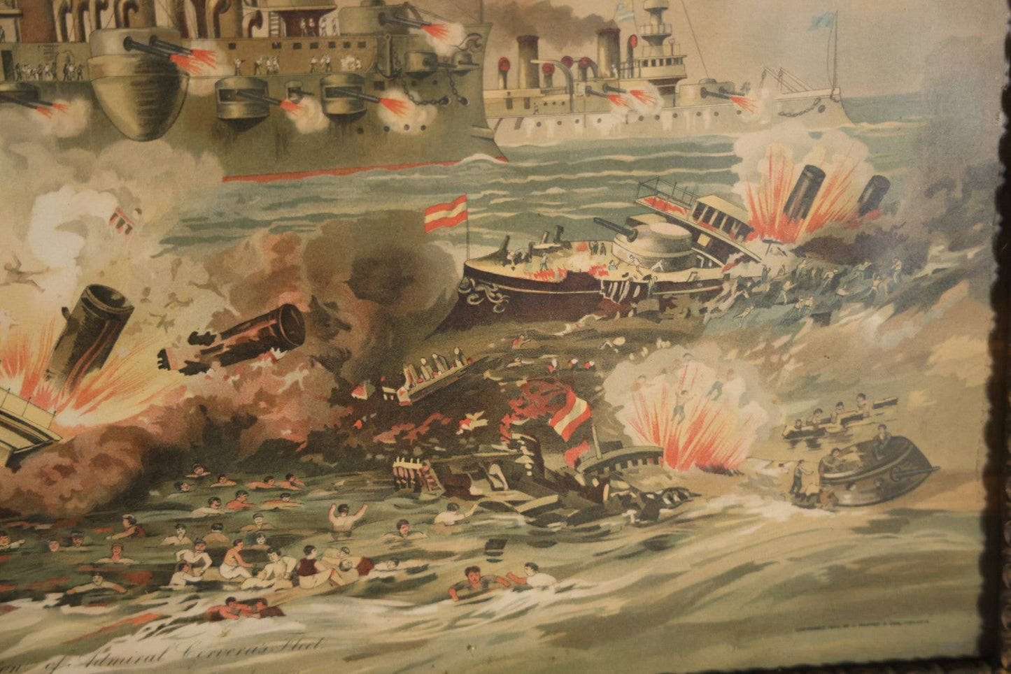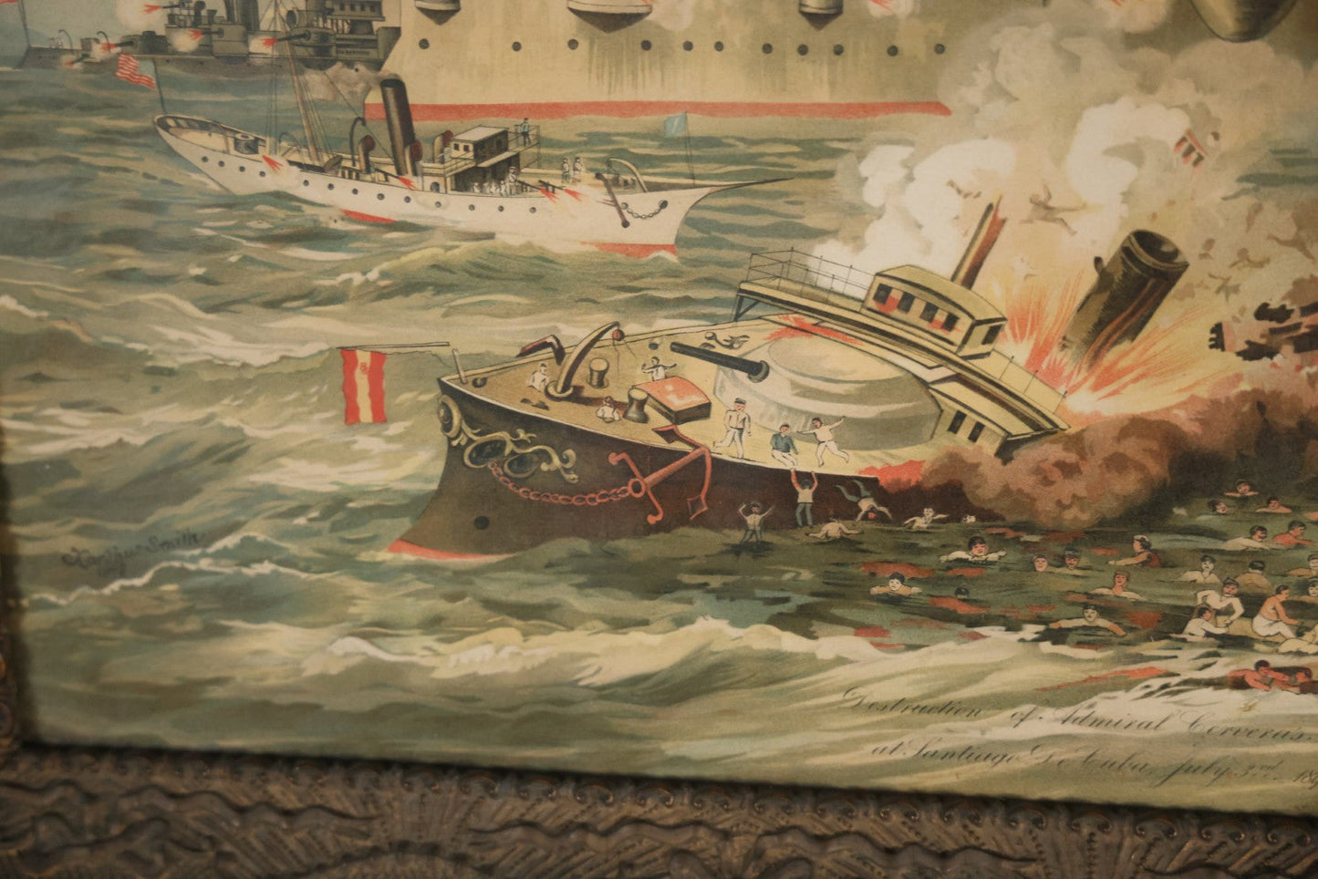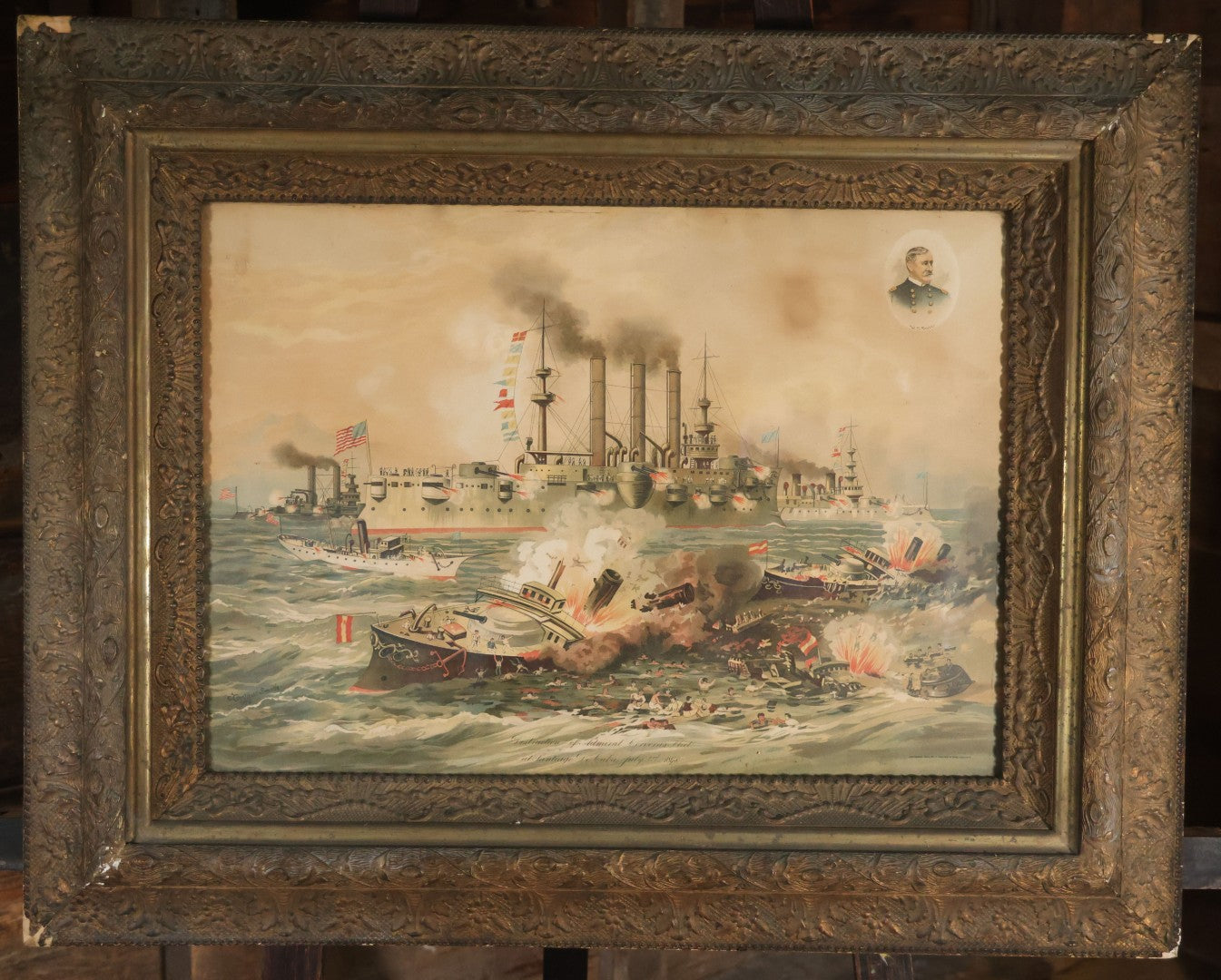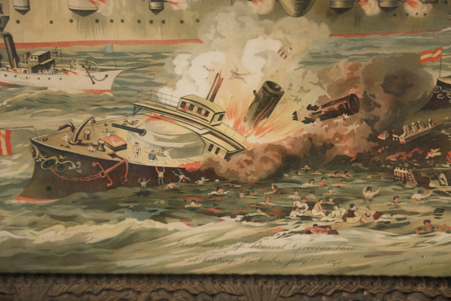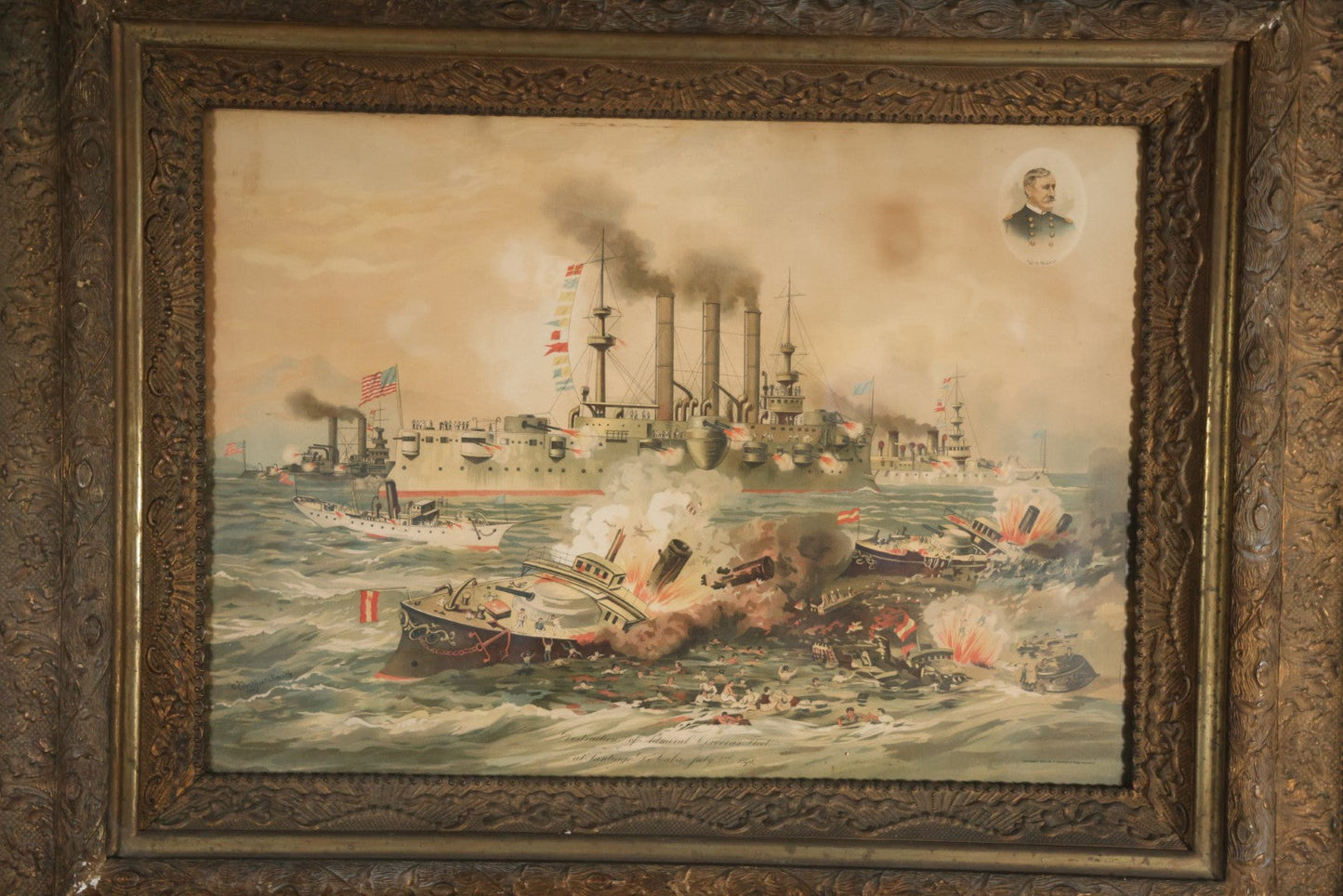 Antique Spanish American War Chromolithograph Print Depicting The Destruction Of Admiral Cervera's Fleet At Santiago De Cuba, July 3rd, 1898, In Large Ornate Frame, After Xanthus Russell Smith, Copyright 1898 By J. Hoover & Son, Philadelphia, 39" x 31"