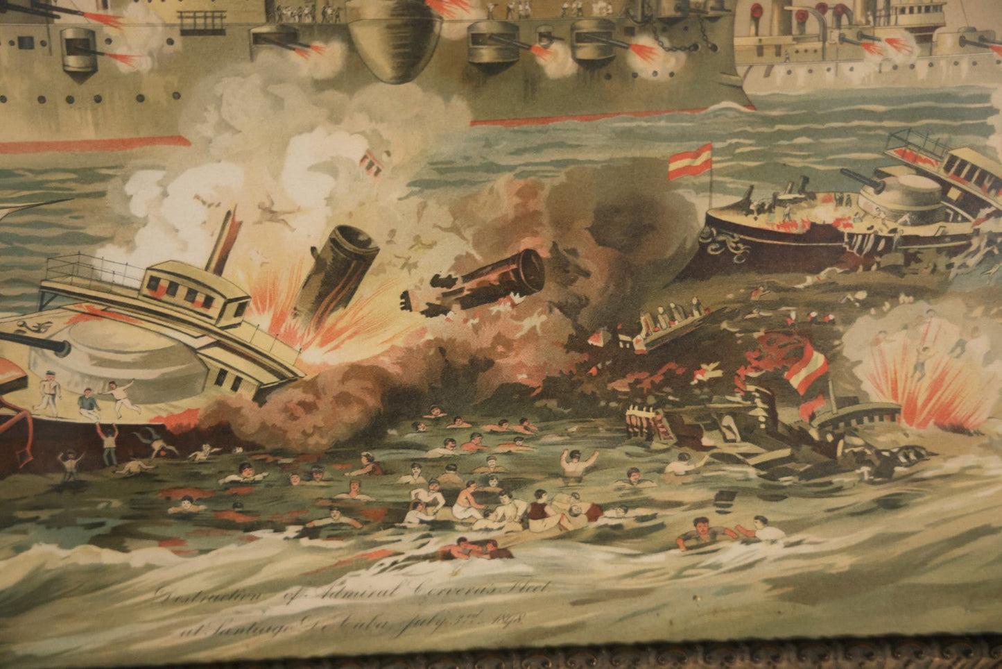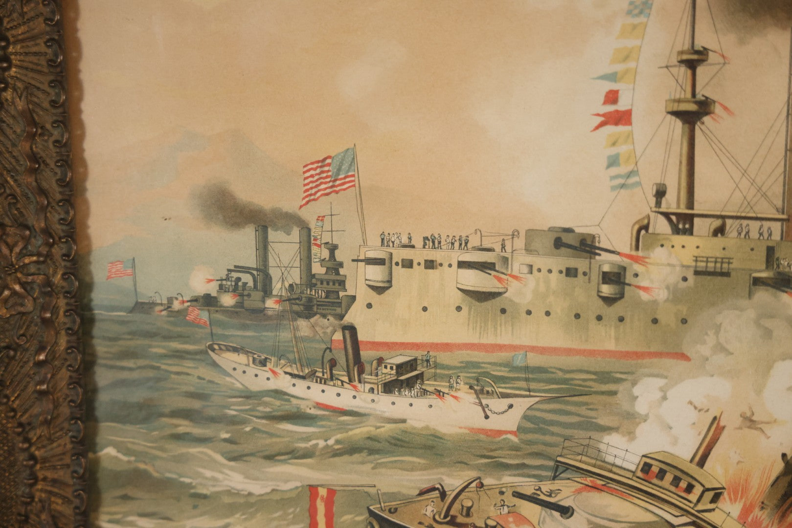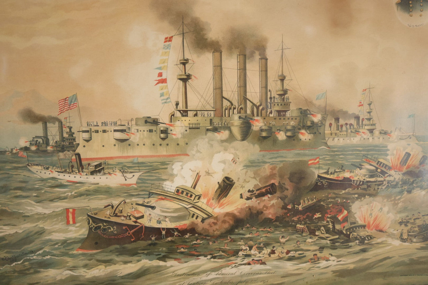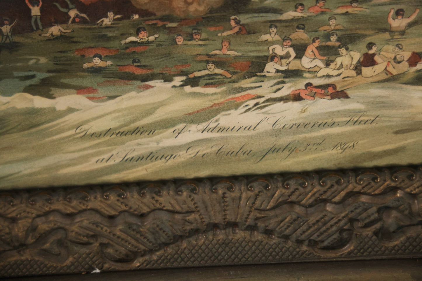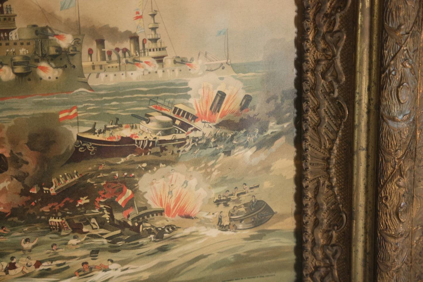 Antique Spanish American War Chromolithograph Print Depicting The Destruction Of Admiral Cervera's Fleet At Santiago De Cuba, July 3rd, 1898, In Large Ornate Frame, After Xanthus Russell Smith, Copyright 1898 By J. Hoover & Son, Philadelphia, 39" x 31"
