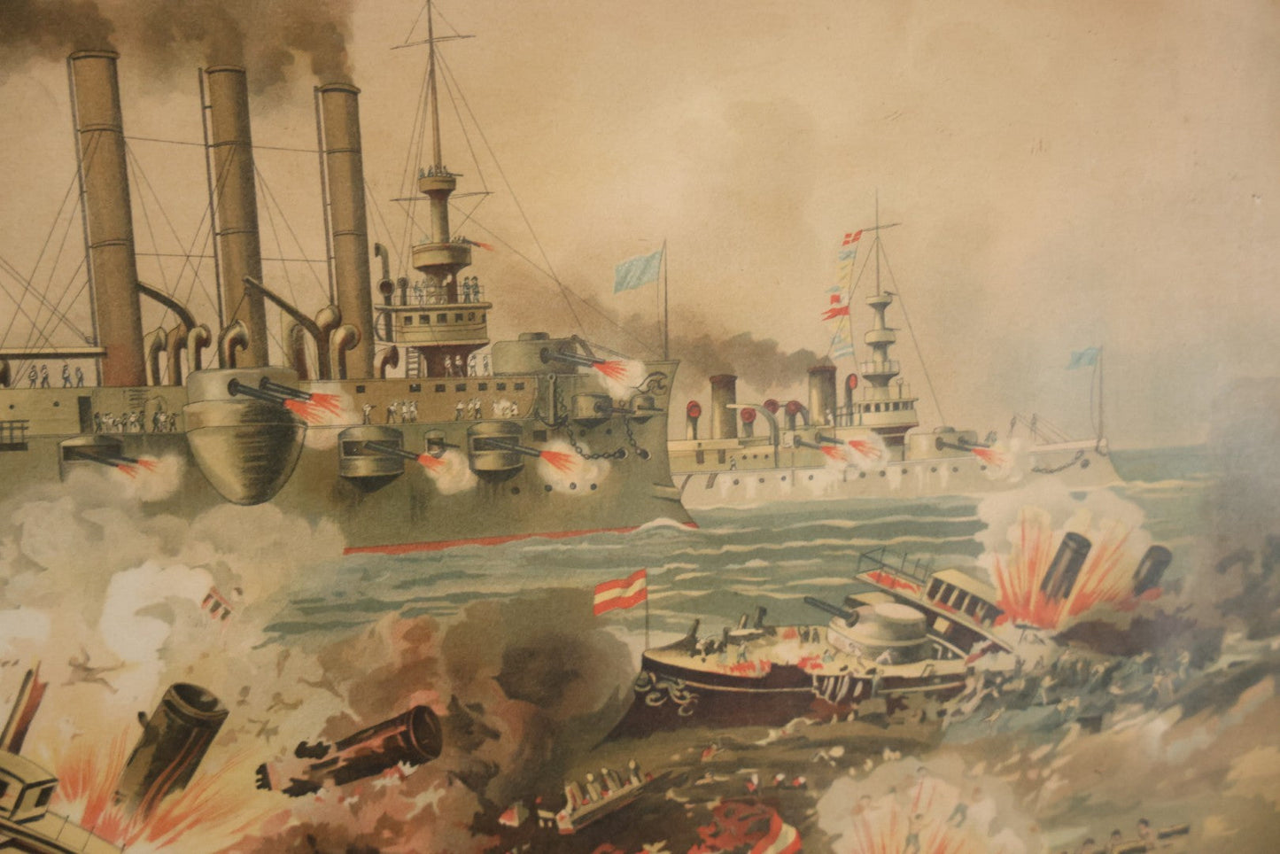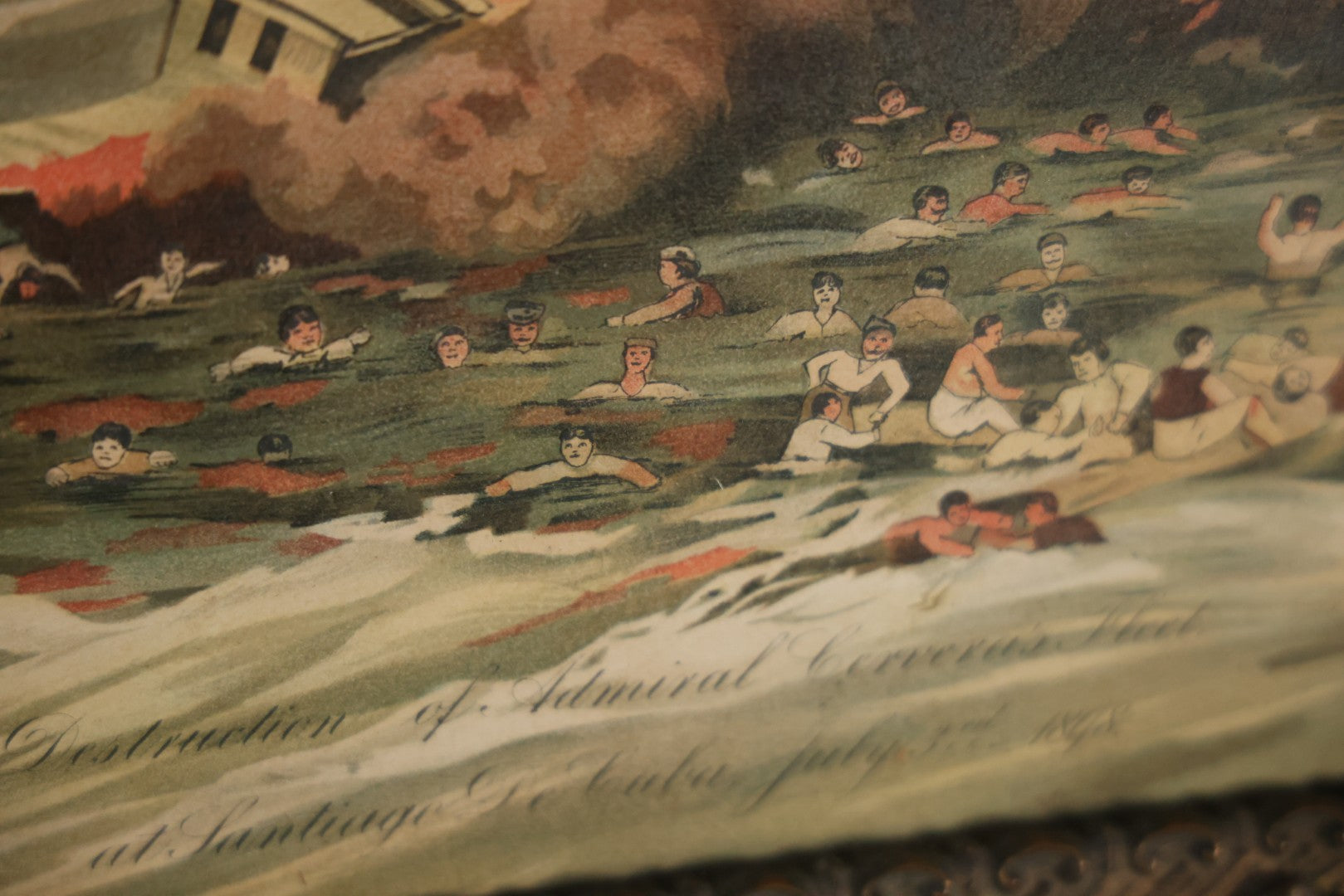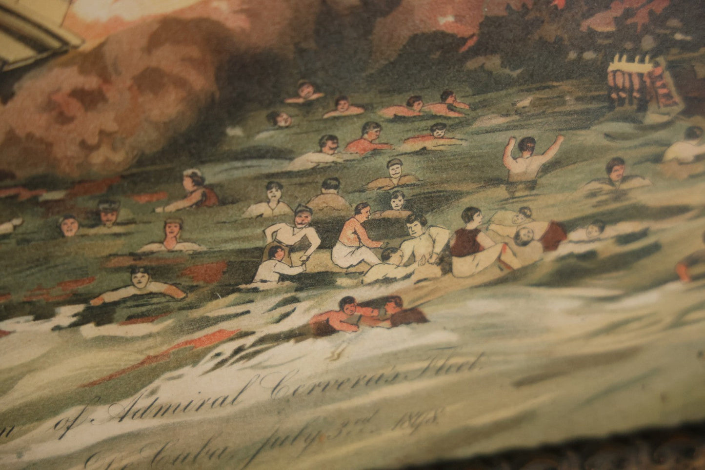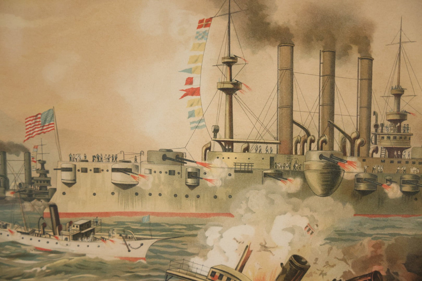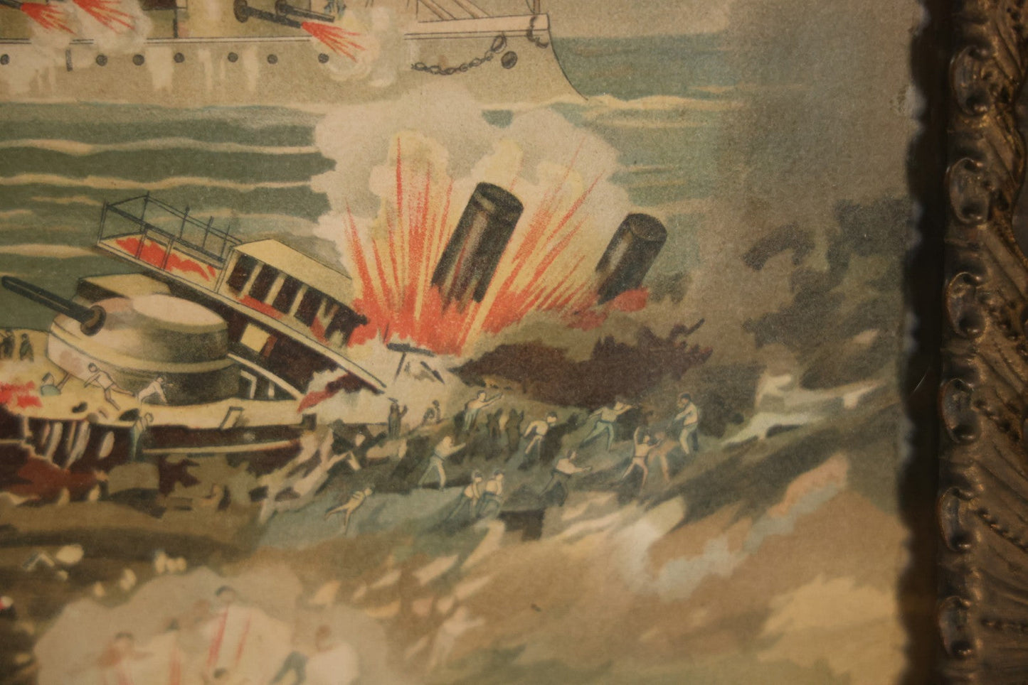 Antique Spanish American War Chromolithograph Print Depicting The Destruction Of Admiral Cervera's Fleet At Santiago De Cuba, July 3rd, 1898, In Large Ornate Frame, After Xanthus Russell Smith, Copyright 1898 By J. Hoover & Son, Philadelphia, 39" x 31"