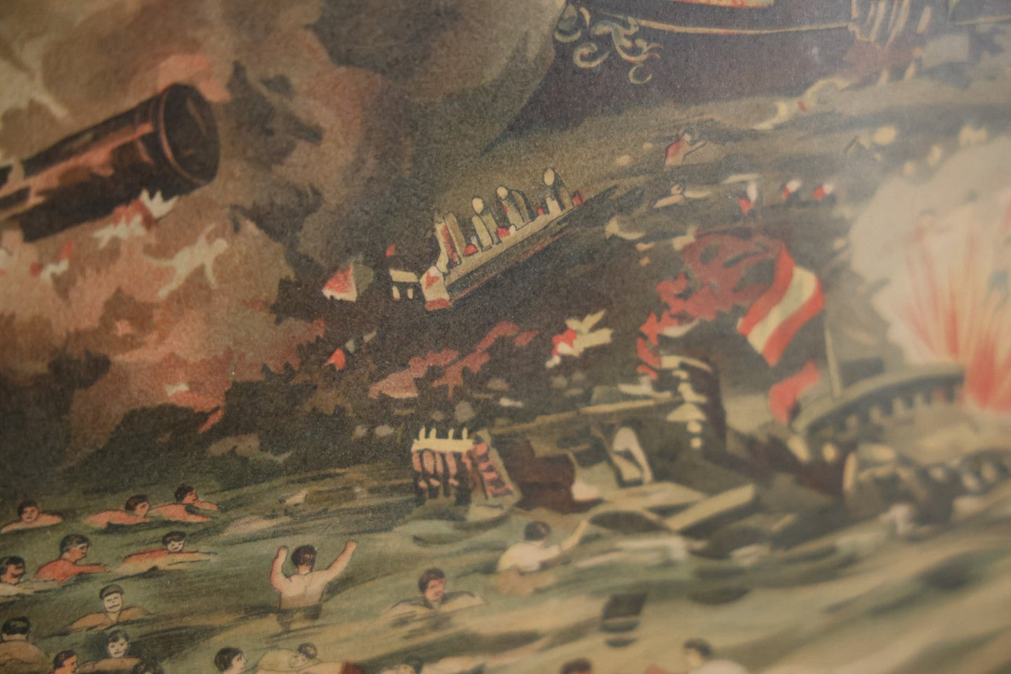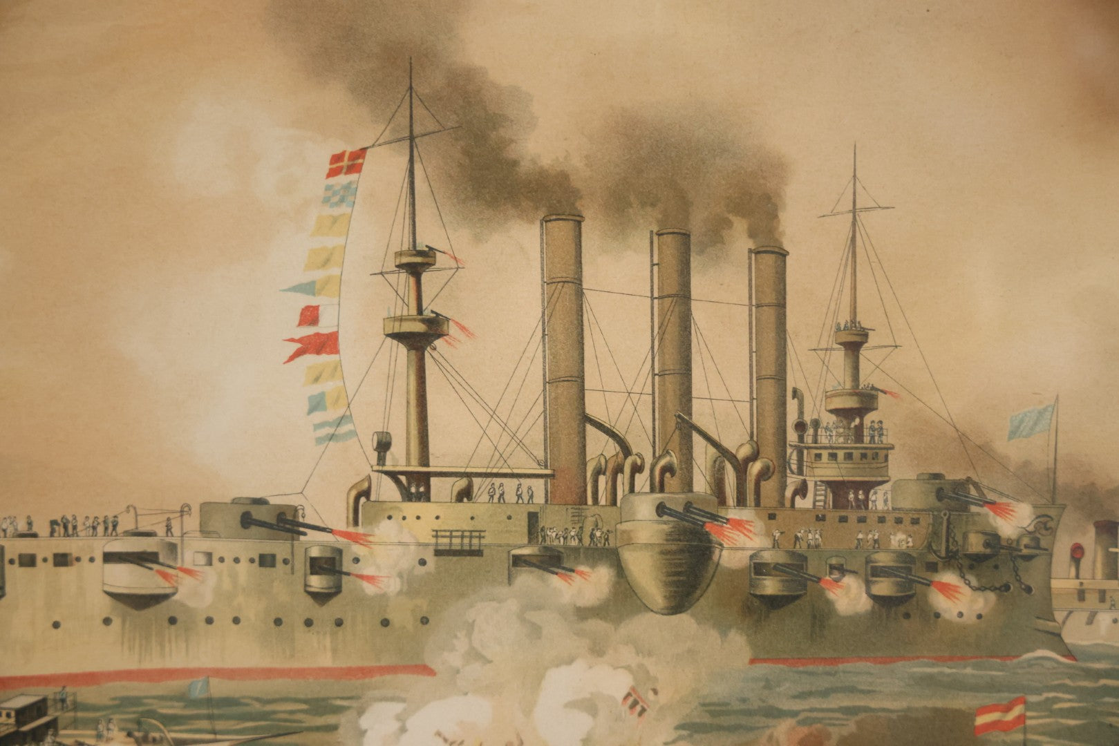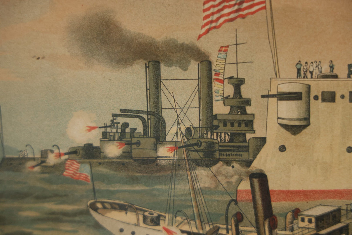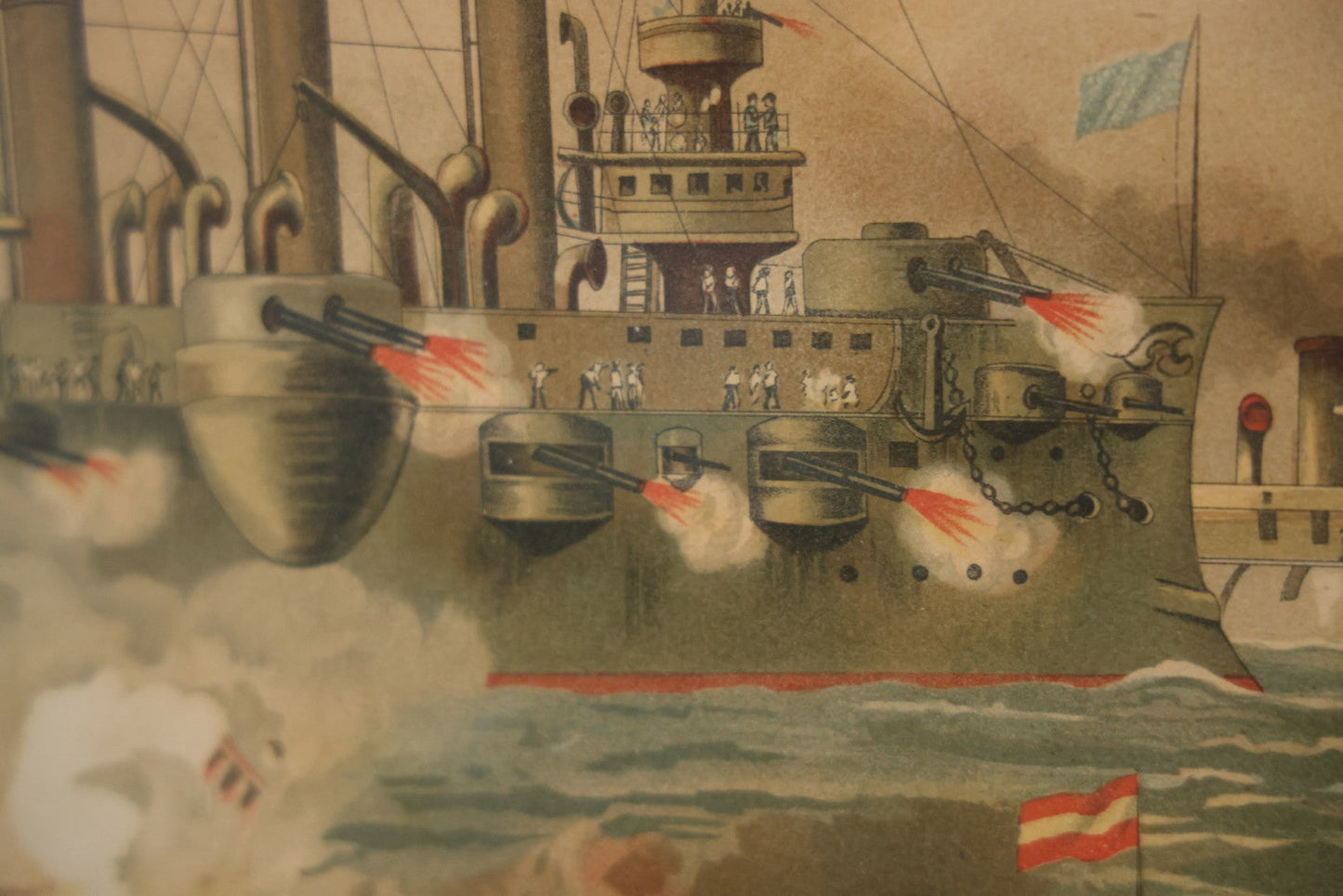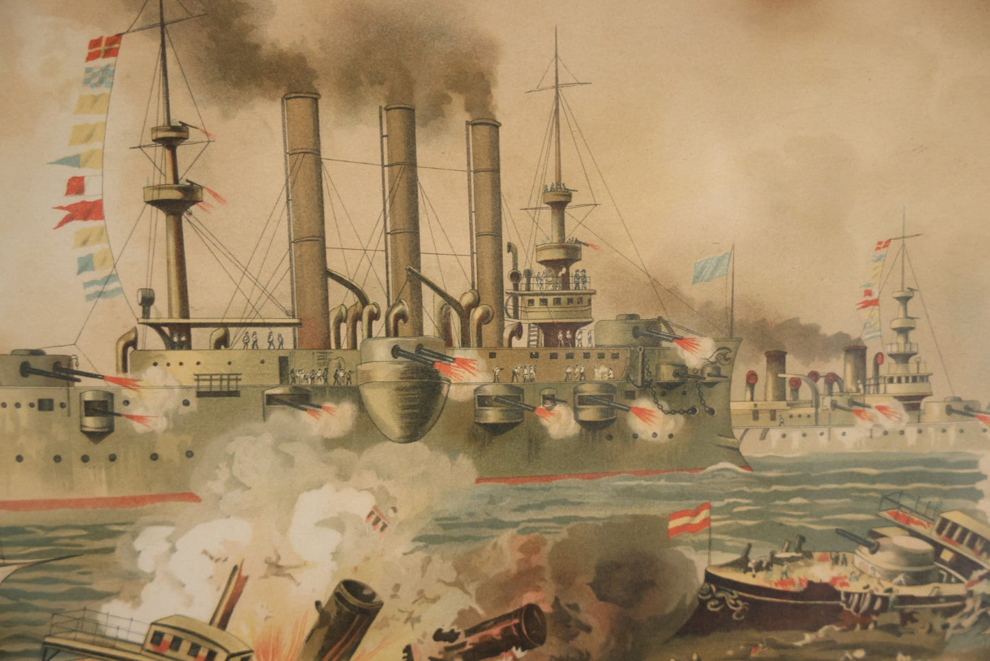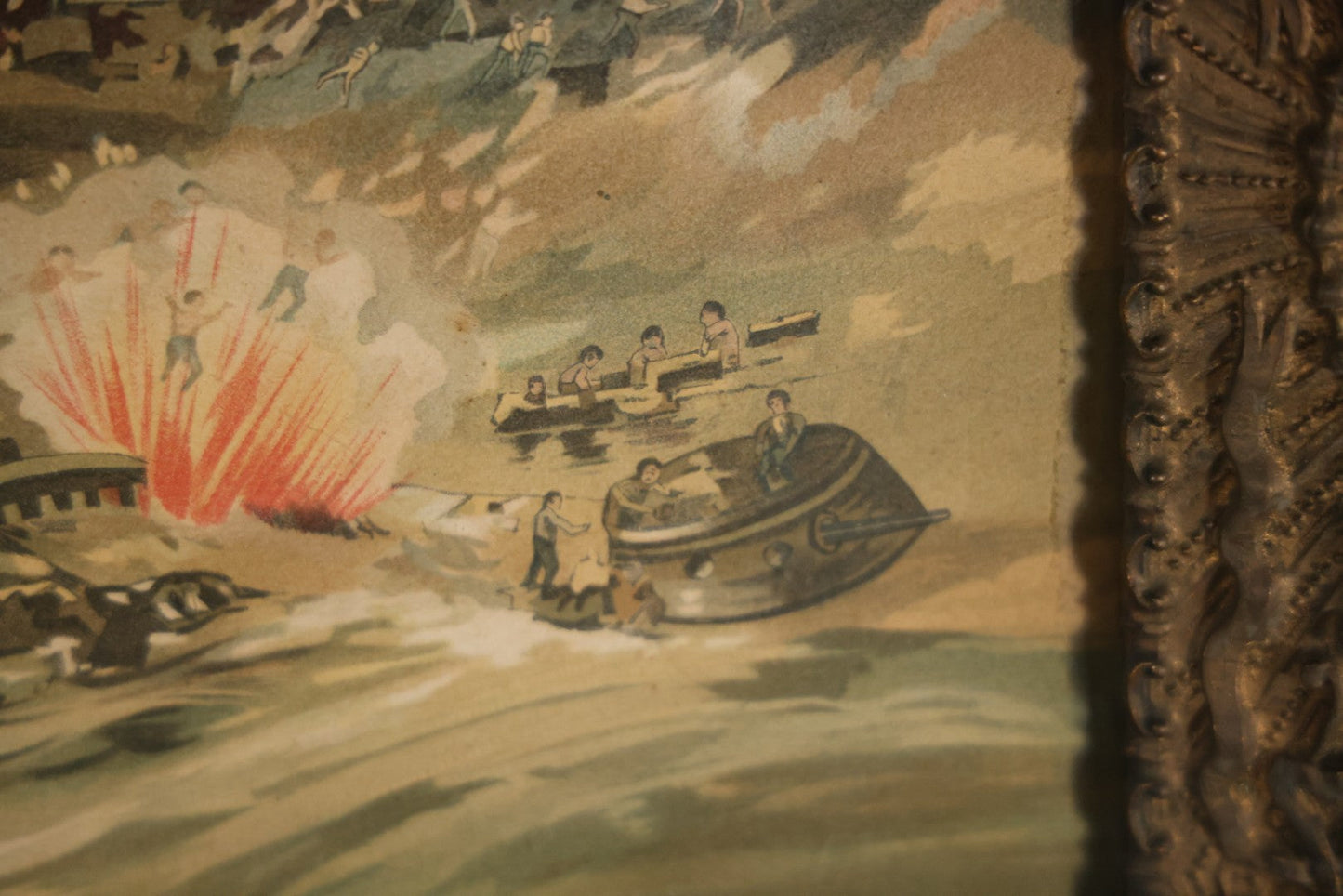 Antique Spanish American War Chromolithograph Print Depicting The Destruction Of Admiral Cervera's Fleet At Santiago De Cuba, July 3rd, 1898, In Large Ornate Frame, After Xanthus Russell Smith, Copyright 1898 By J. Hoover & Son, Philadelphia, 39" x 31"