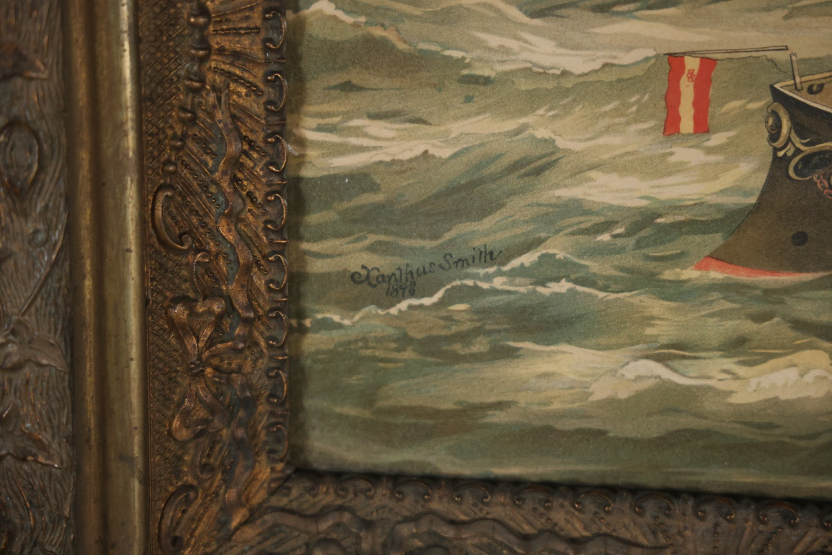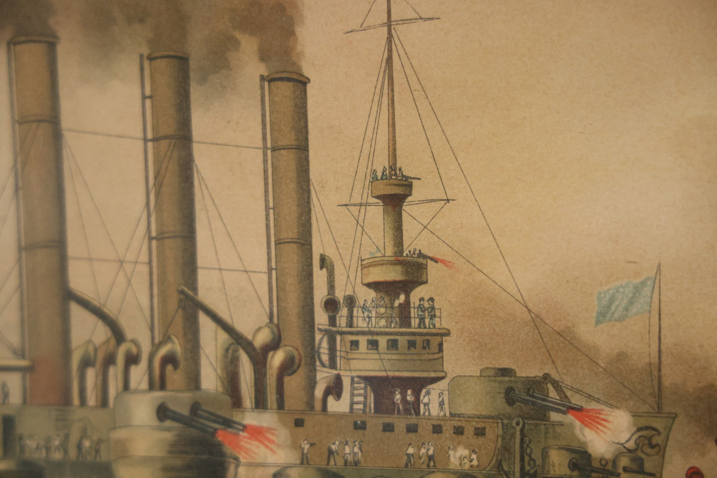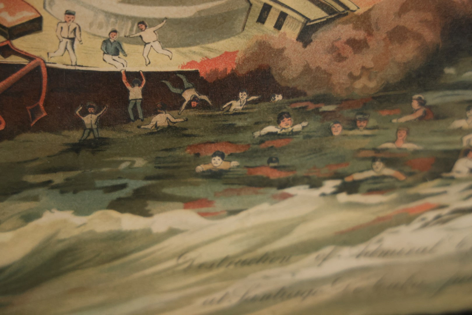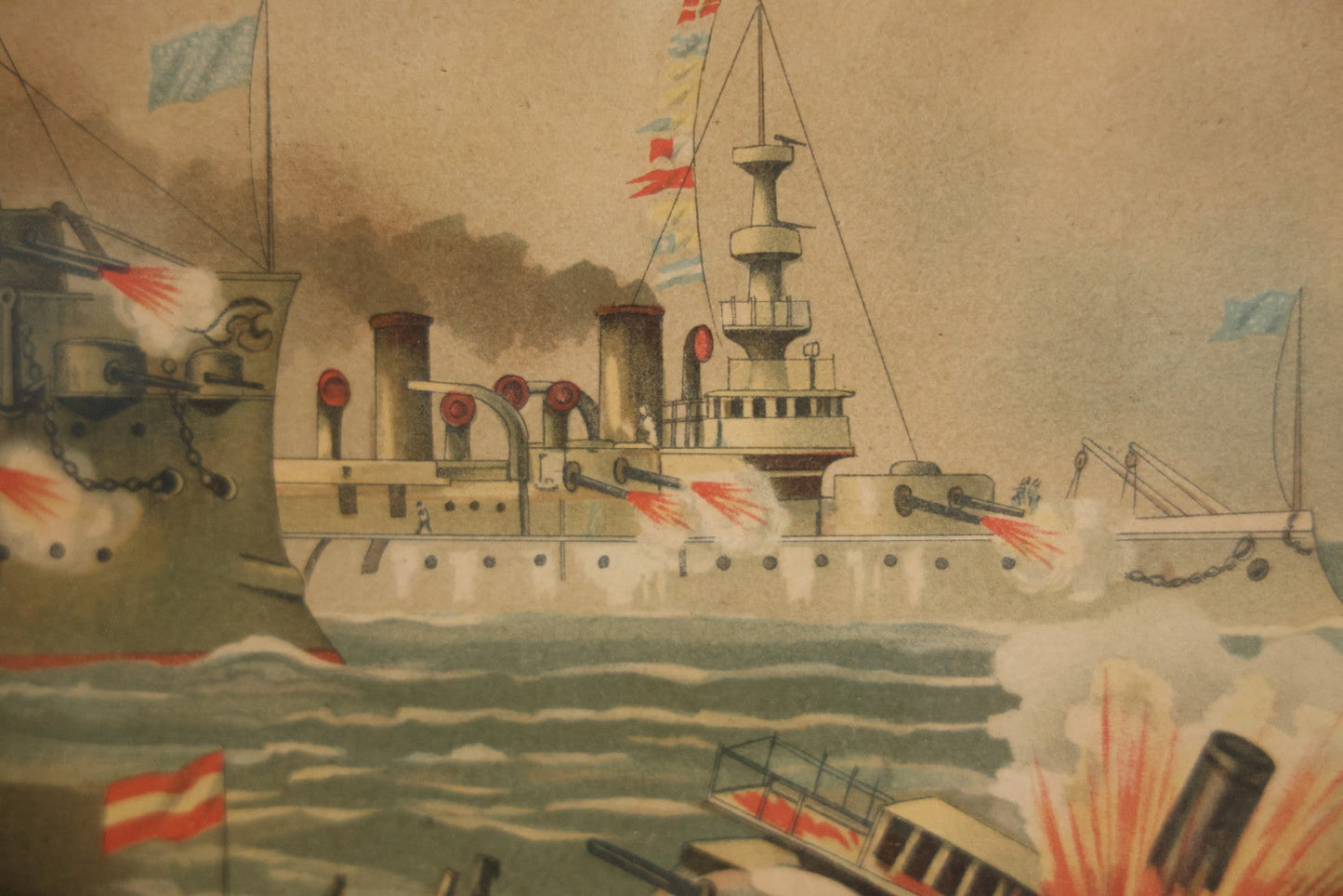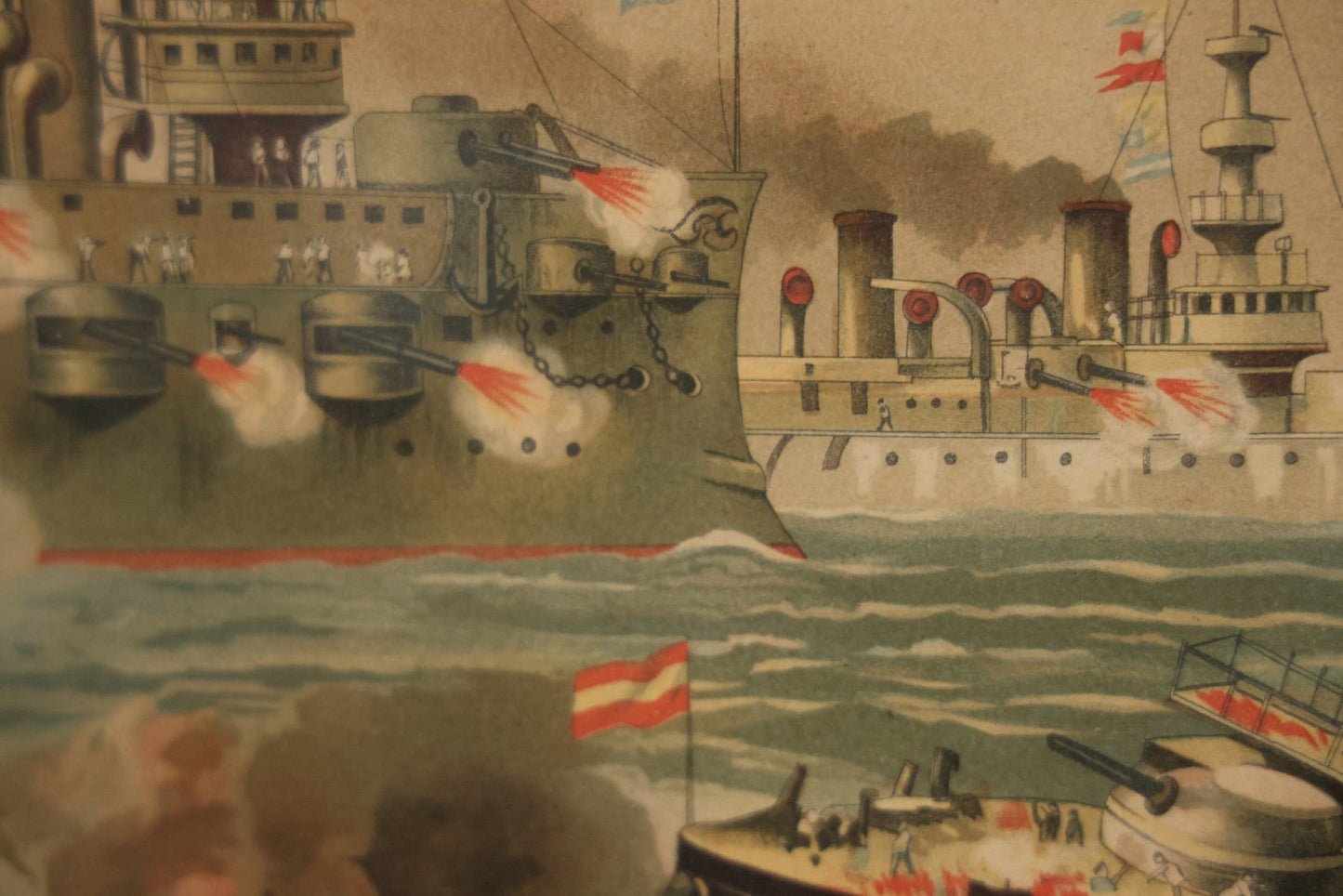 Antique Spanish American War Chromolithograph Print Depicting The Destruction Of Admiral Cervera's Fleet At Santiago De Cuba, July 3rd, 1898, In Large Ornate Frame, After Xanthus Russell Smith, Copyright 1898 By J. Hoover & Son, Philadelphia, 39" x 31"