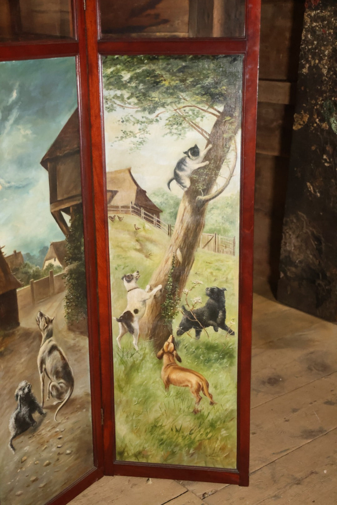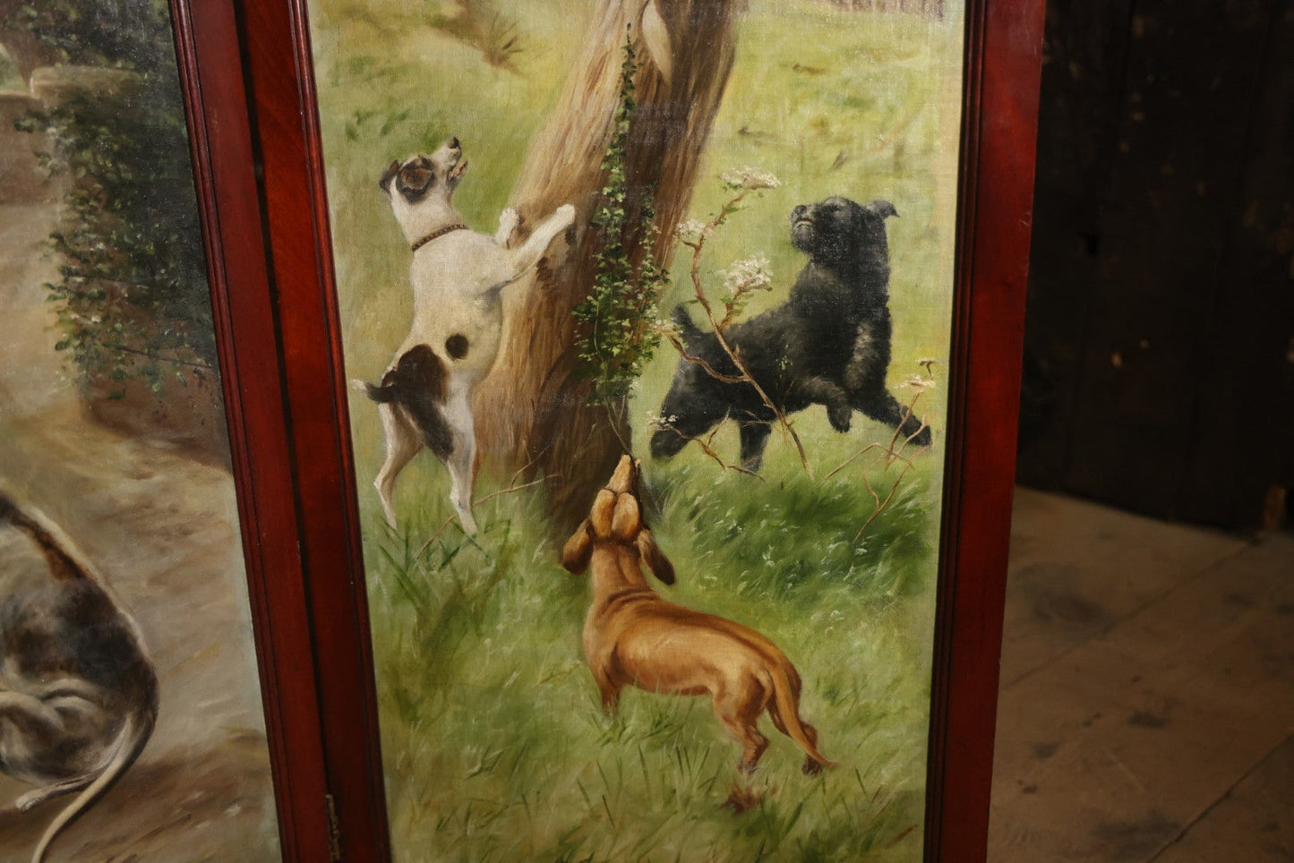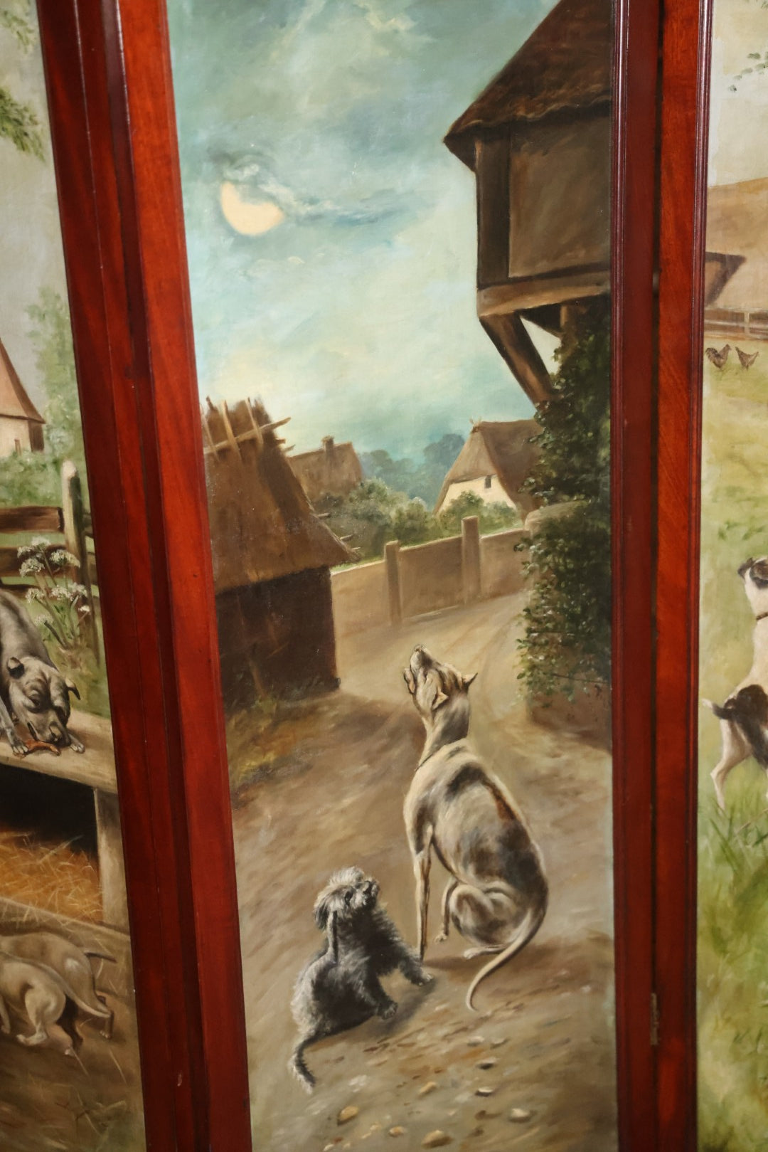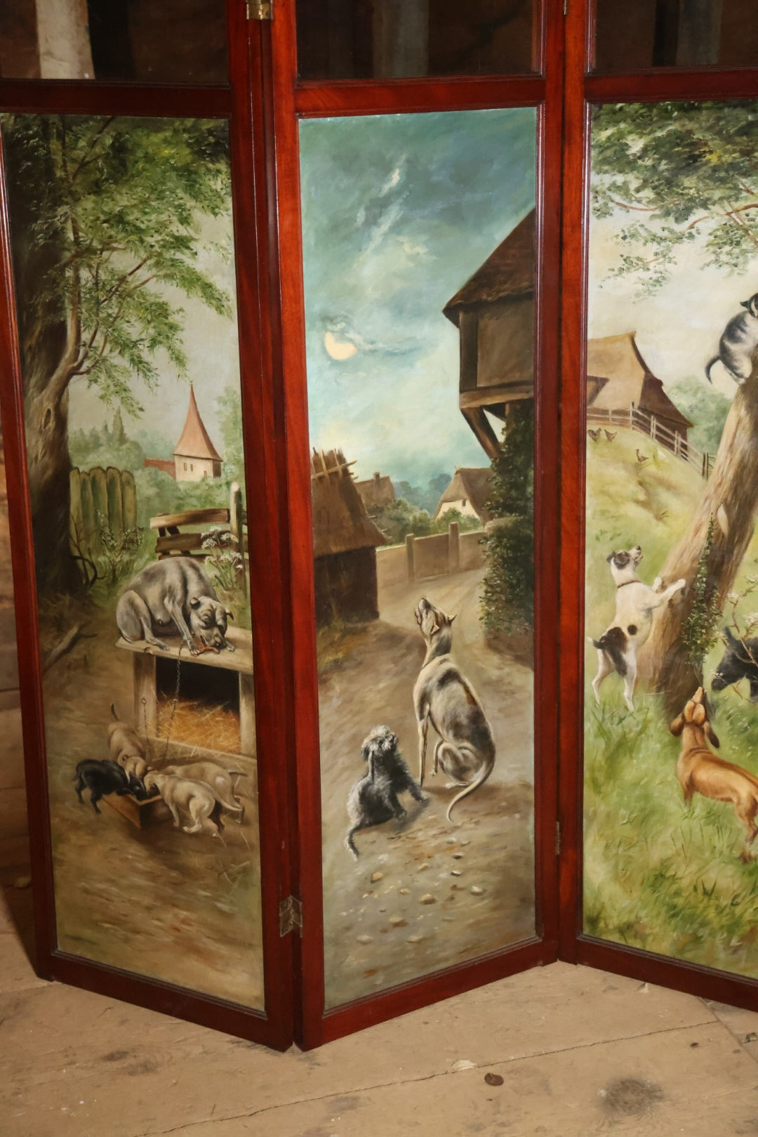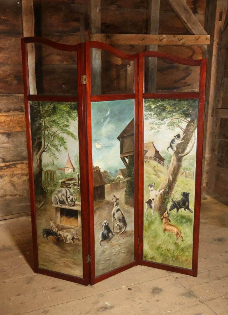 Antique Three Section Room Divider Screen With Hand Painted Scenes Of Dogs, Including Pitbull Dog And Her Pups, Two Dogs Looking At Moon, Three Dogs Chasing Cat Up Tree, Artist Signed E. Underwood, 1908, Landscape, Waterfall Scenes On Verso
