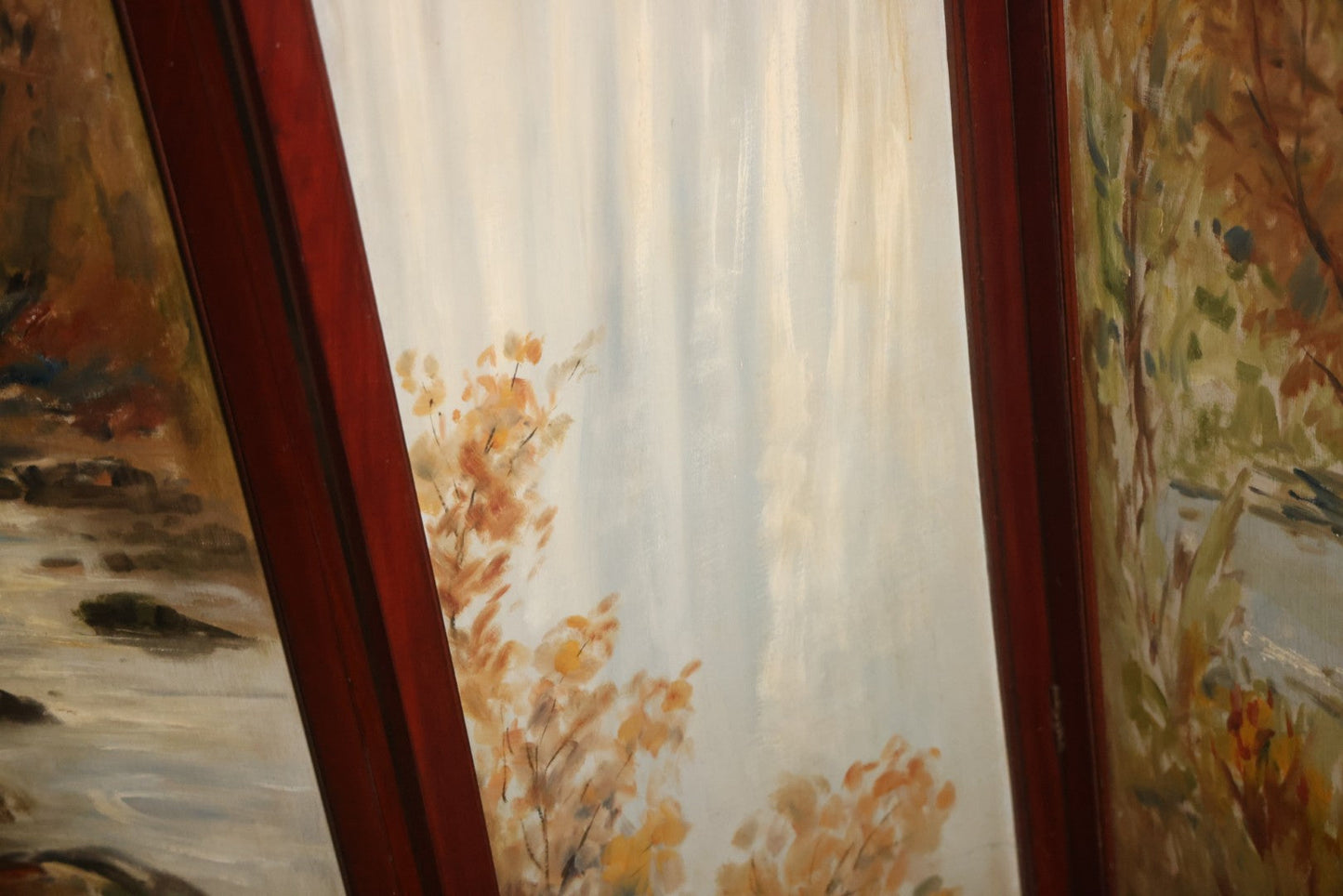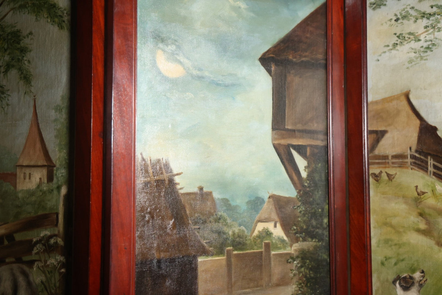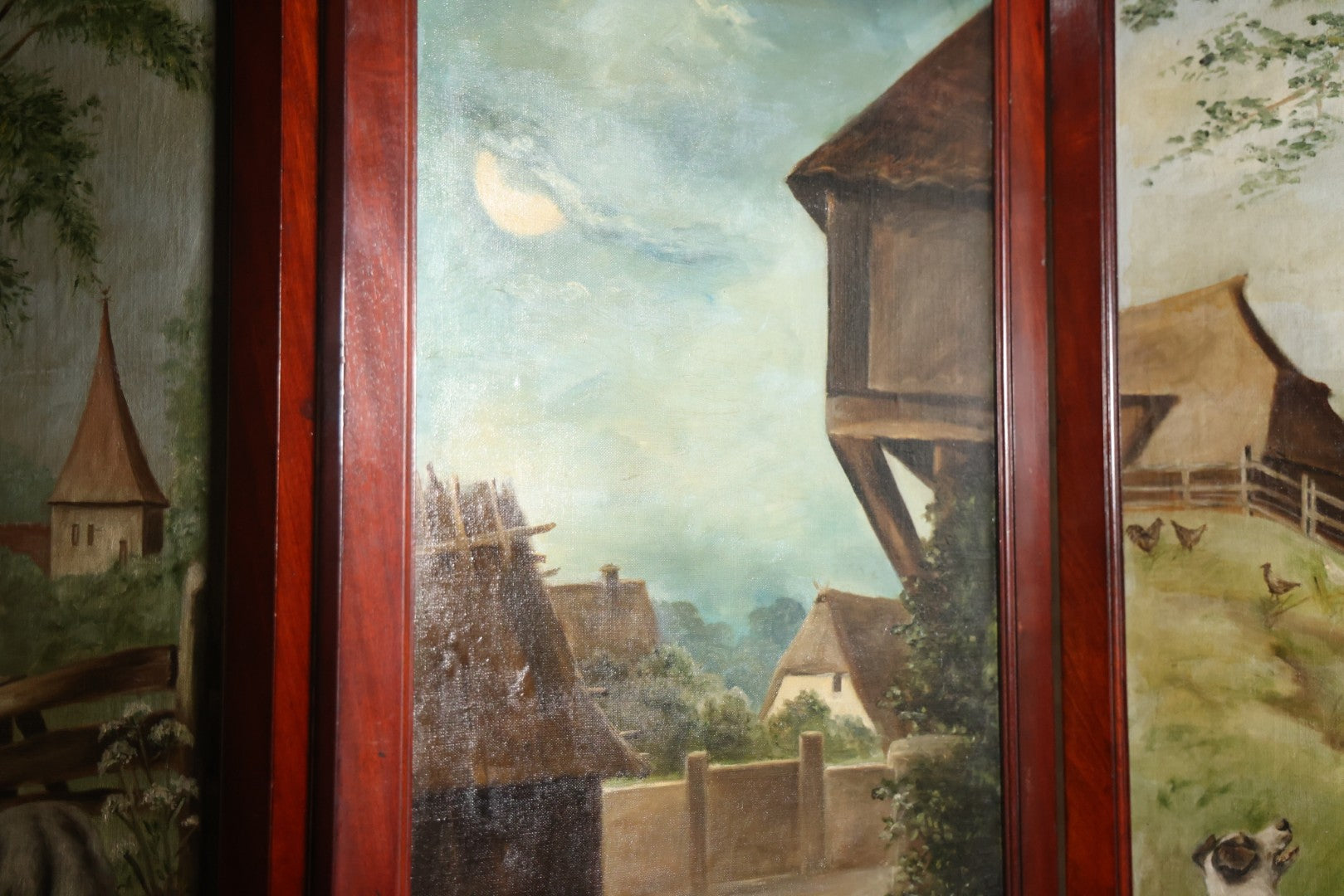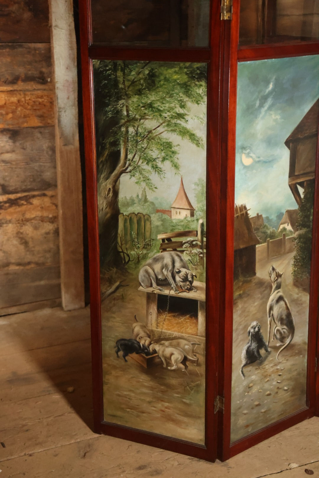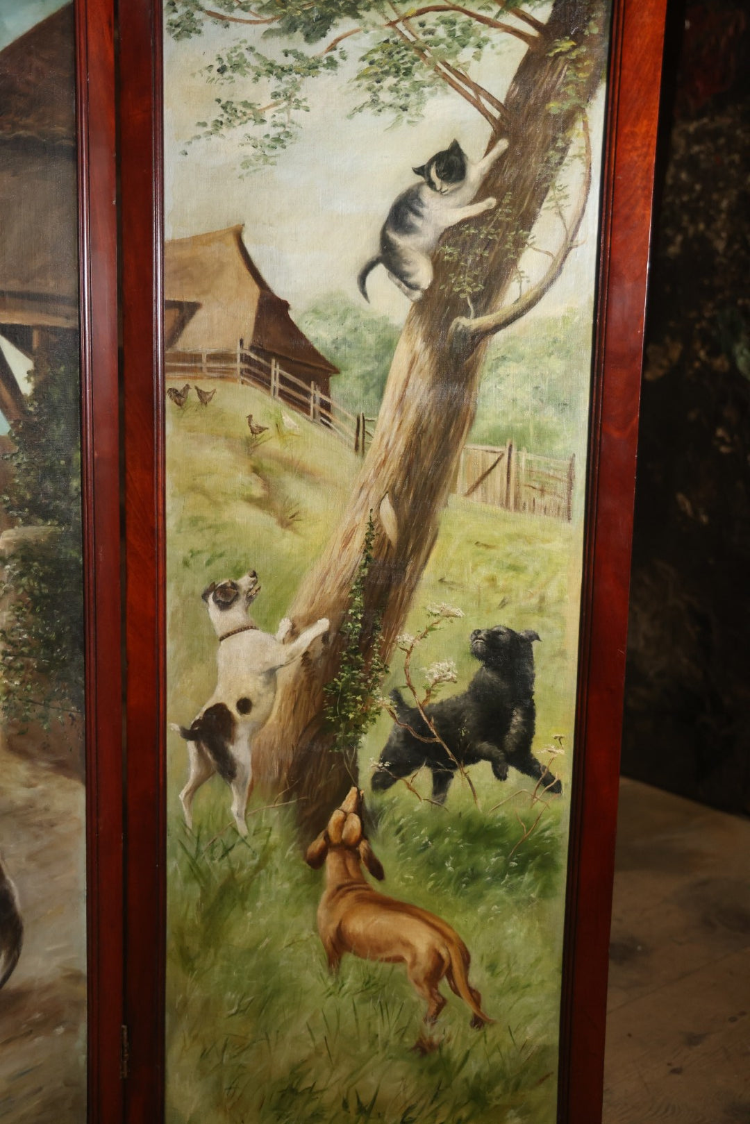 Antique Three Section Room Divider Screen With Hand Painted Scenes Of Dogs, Including Pitbull Dog And Her Pups, Two Dogs Looking At Moon, Three Dogs Chasing Cat Up Tree, Artist Signed E. Underwood, 1908, Landscape, Waterfall Scenes On Verso