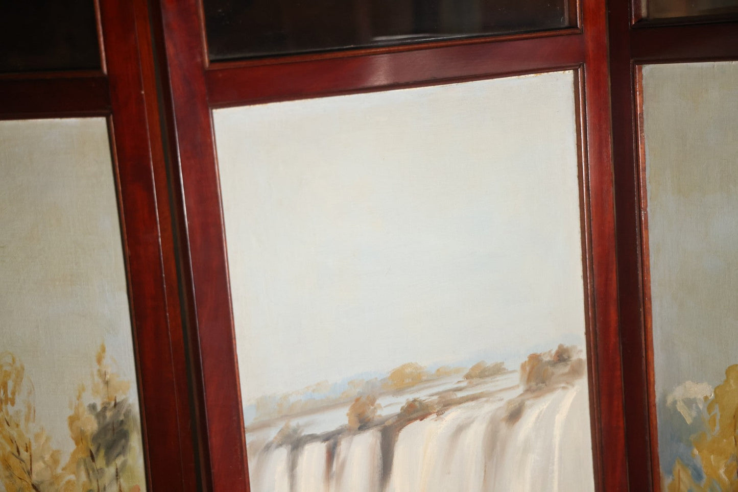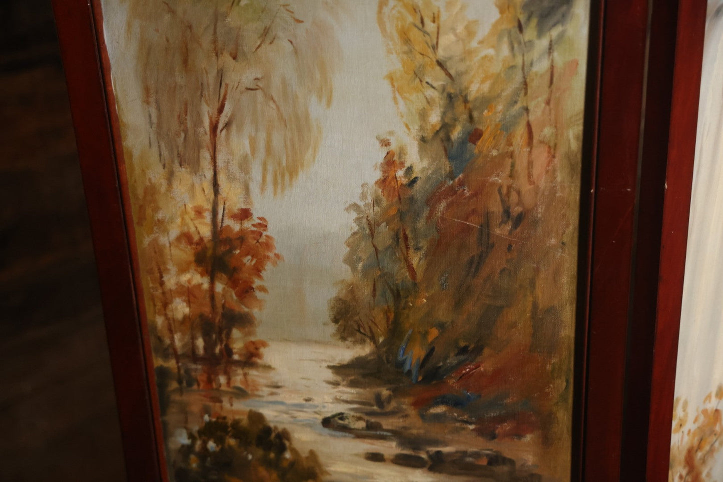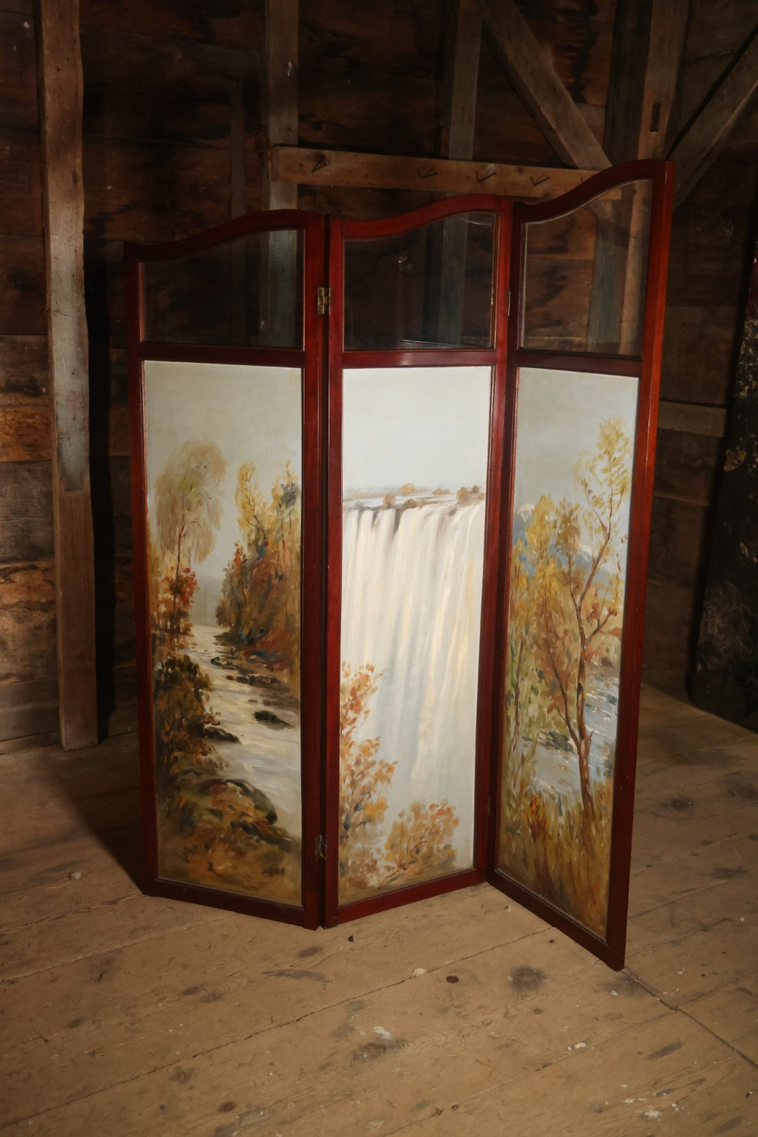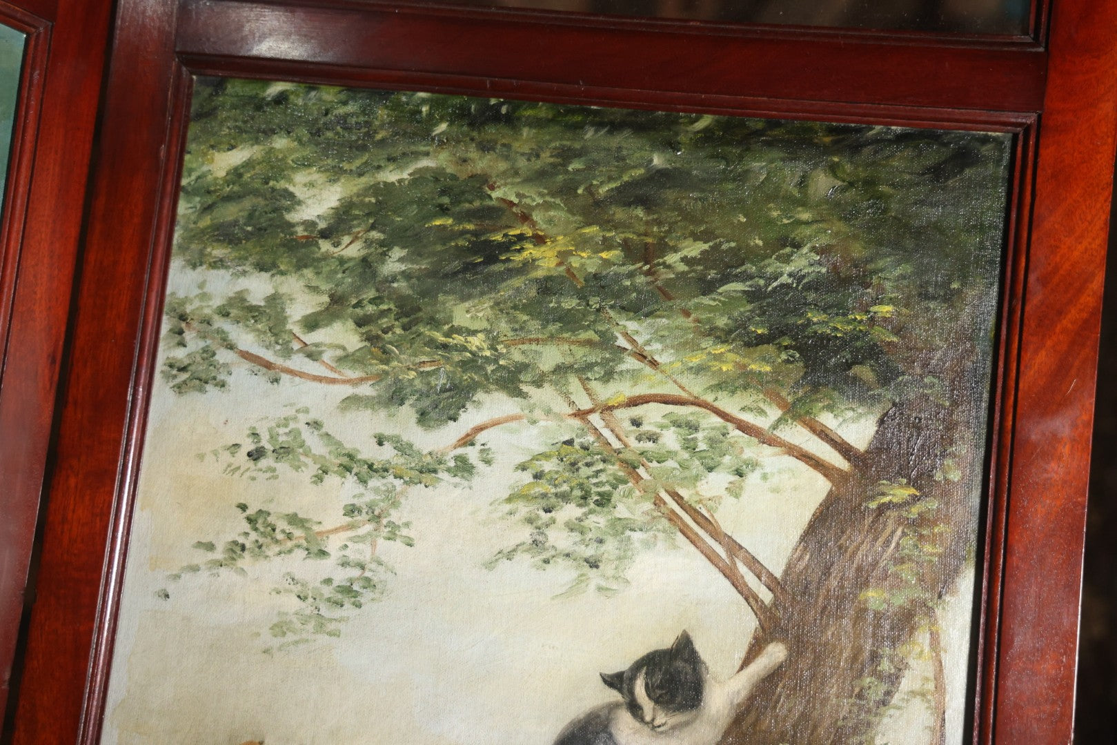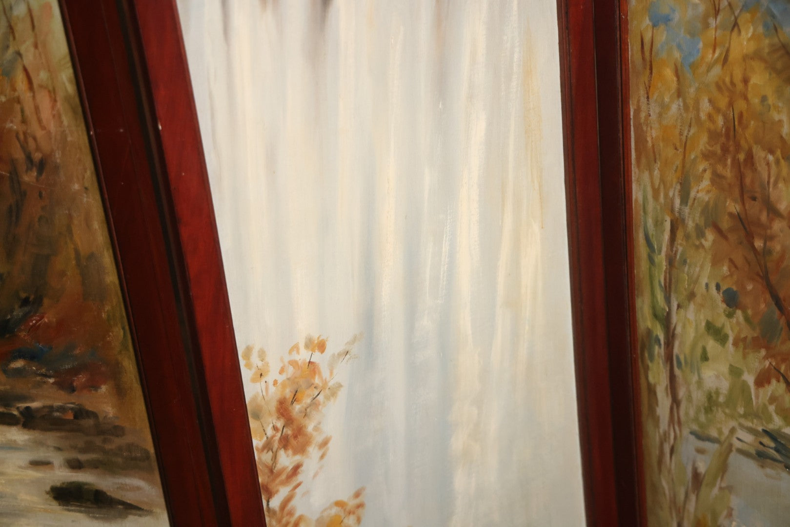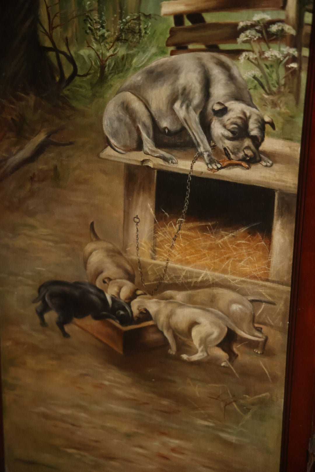 Antique Three Section Room Divider Screen With Hand Painted Scenes Of Dogs, Including Pitbull Dog And Her Pups, Two Dogs Looking At Moon, Three Dogs Chasing Cat Up Tree, Artist Signed E. Underwood, 1908, Landscape, Waterfall Scenes On Verso