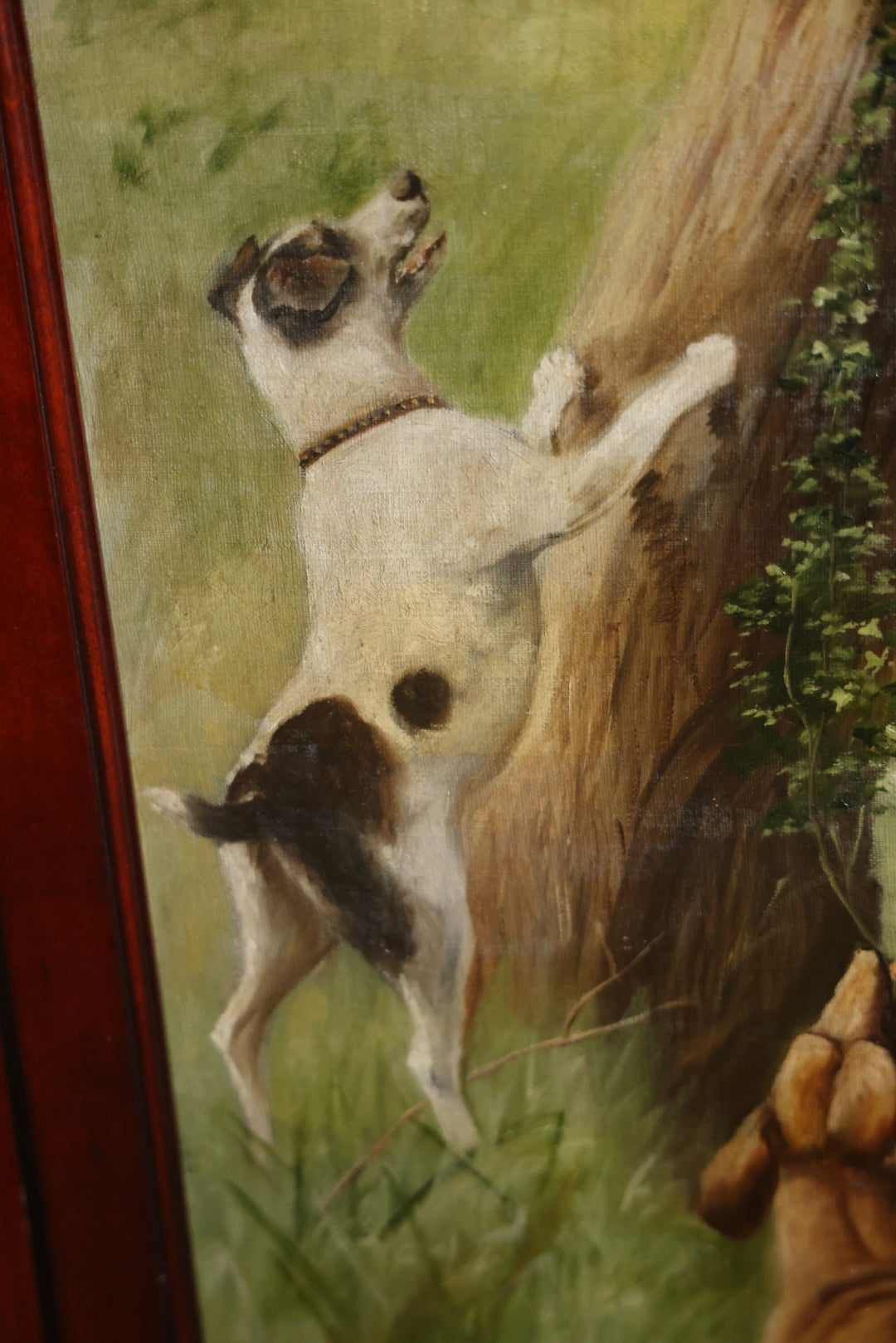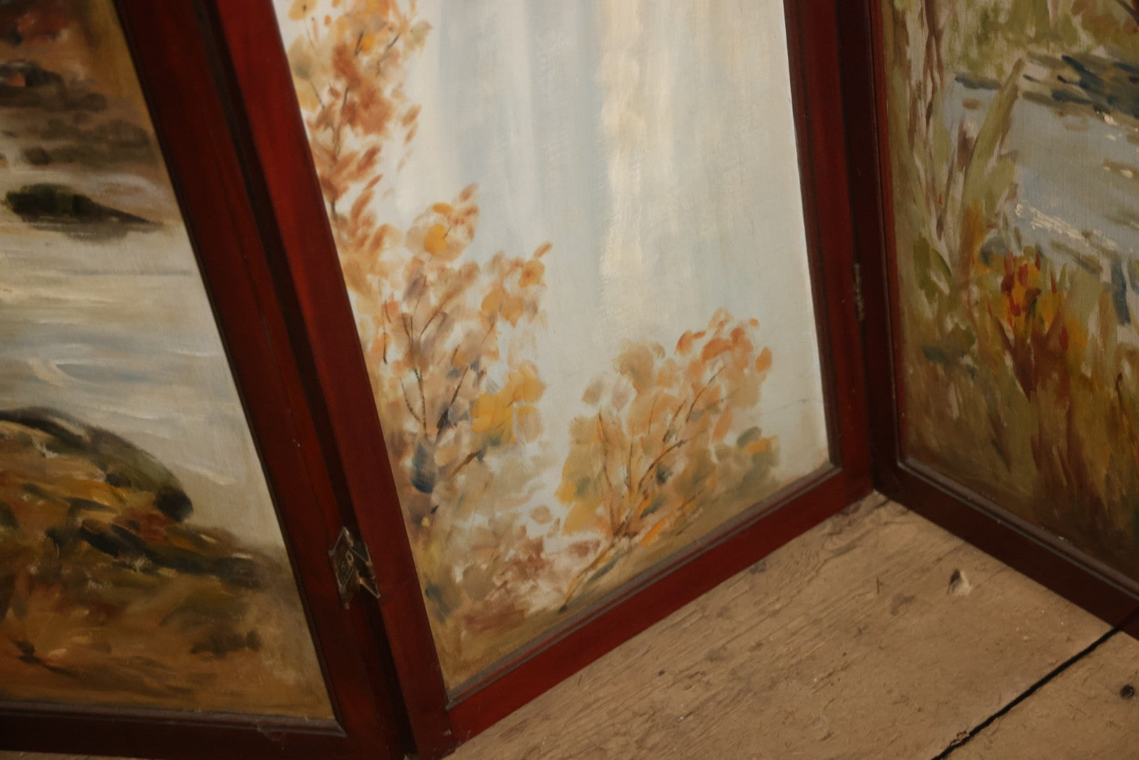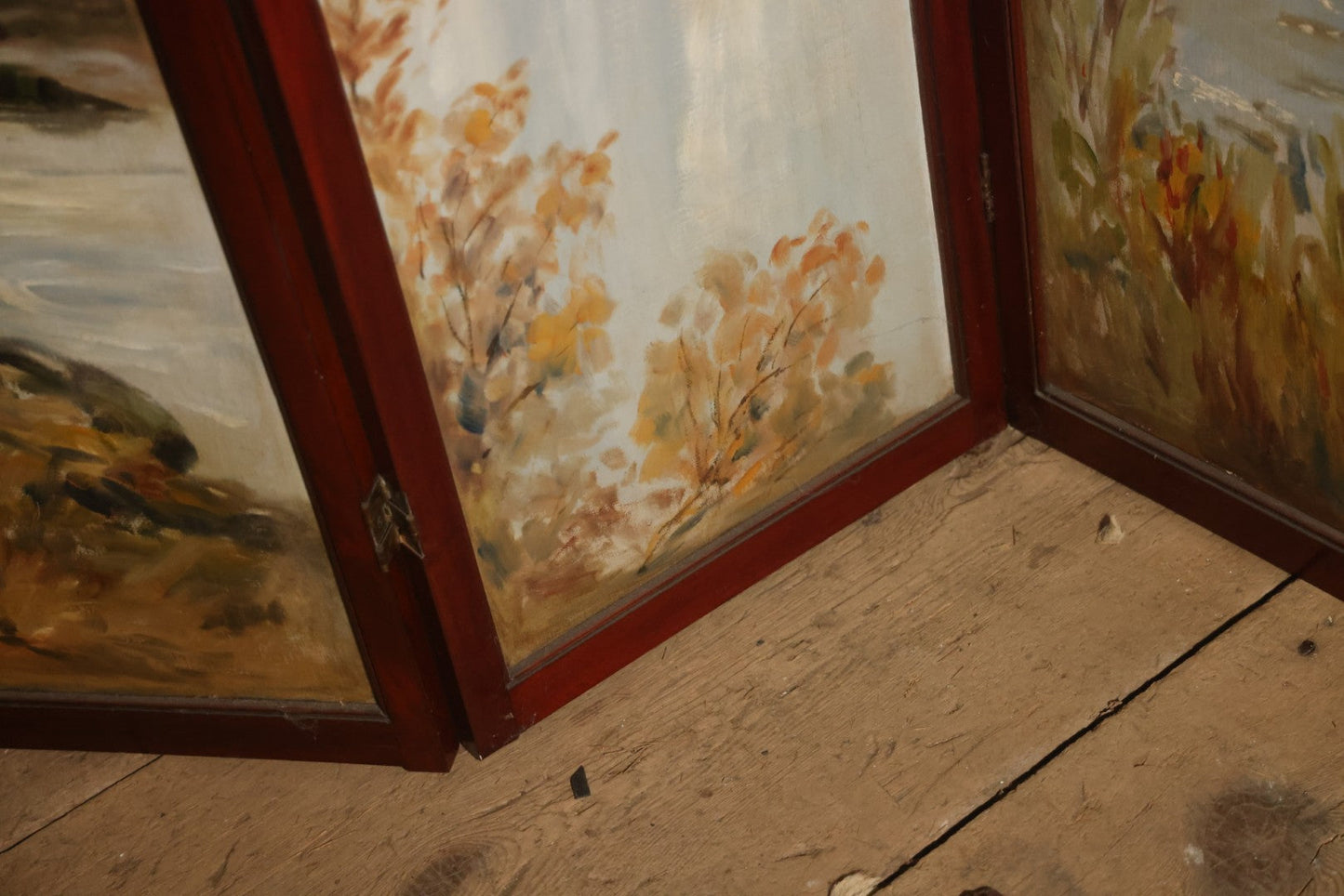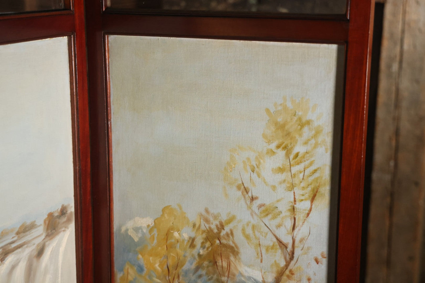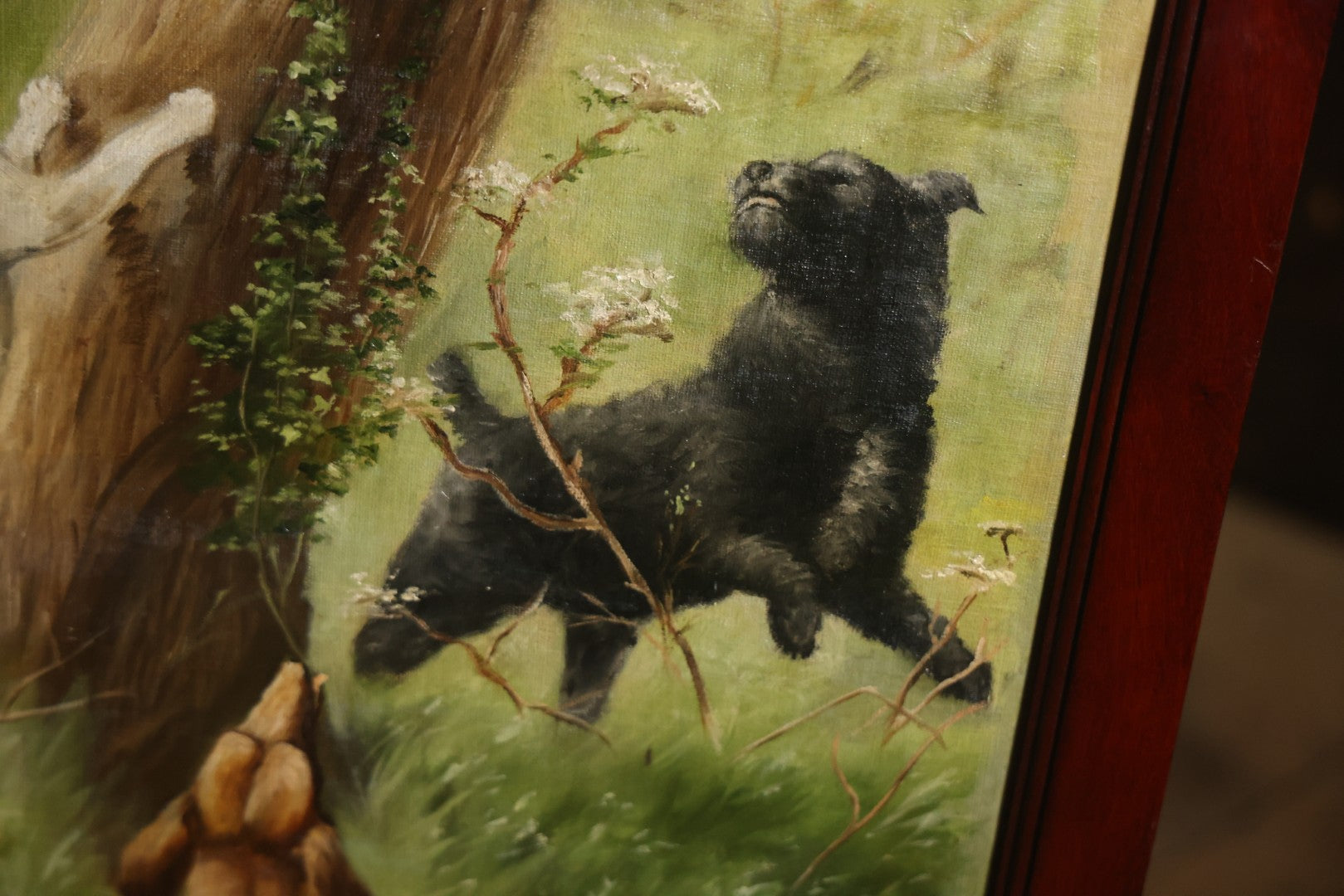 Antique Three Section Room Divider Screen With Hand Painted Scenes Of Dogs, Including Pitbull Dog And Her Pups, Two Dogs Looking At Moon, Three Dogs Chasing Cat Up Tree, Artist Signed E. Underwood, 1908, Landscape, Waterfall Scenes On Verso