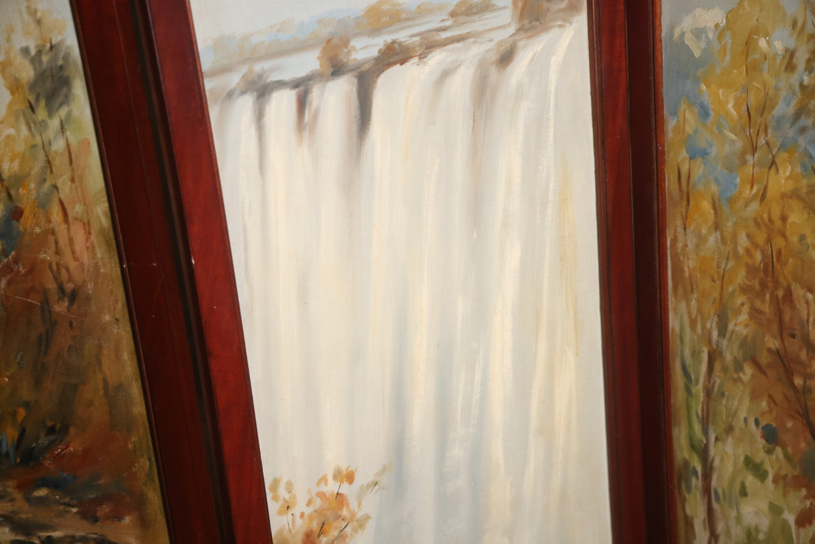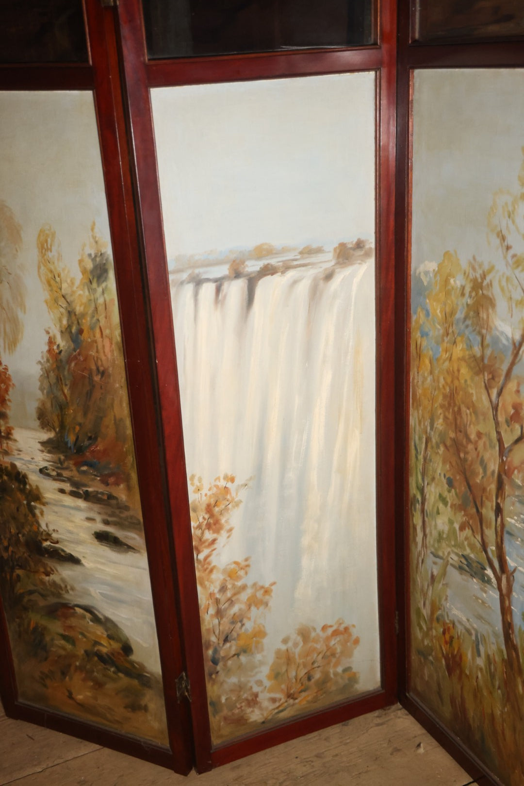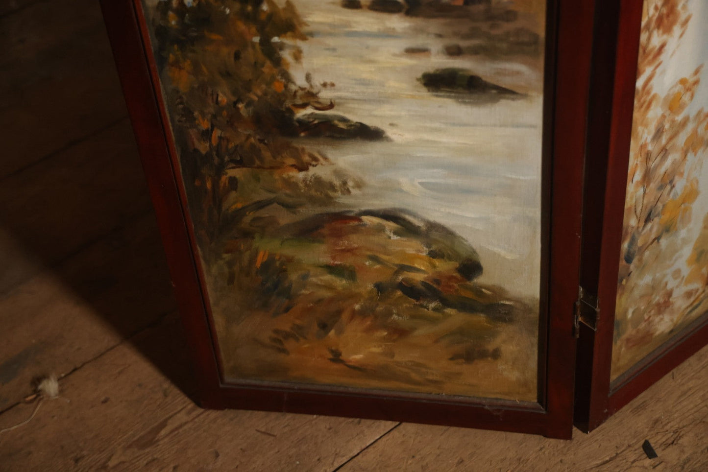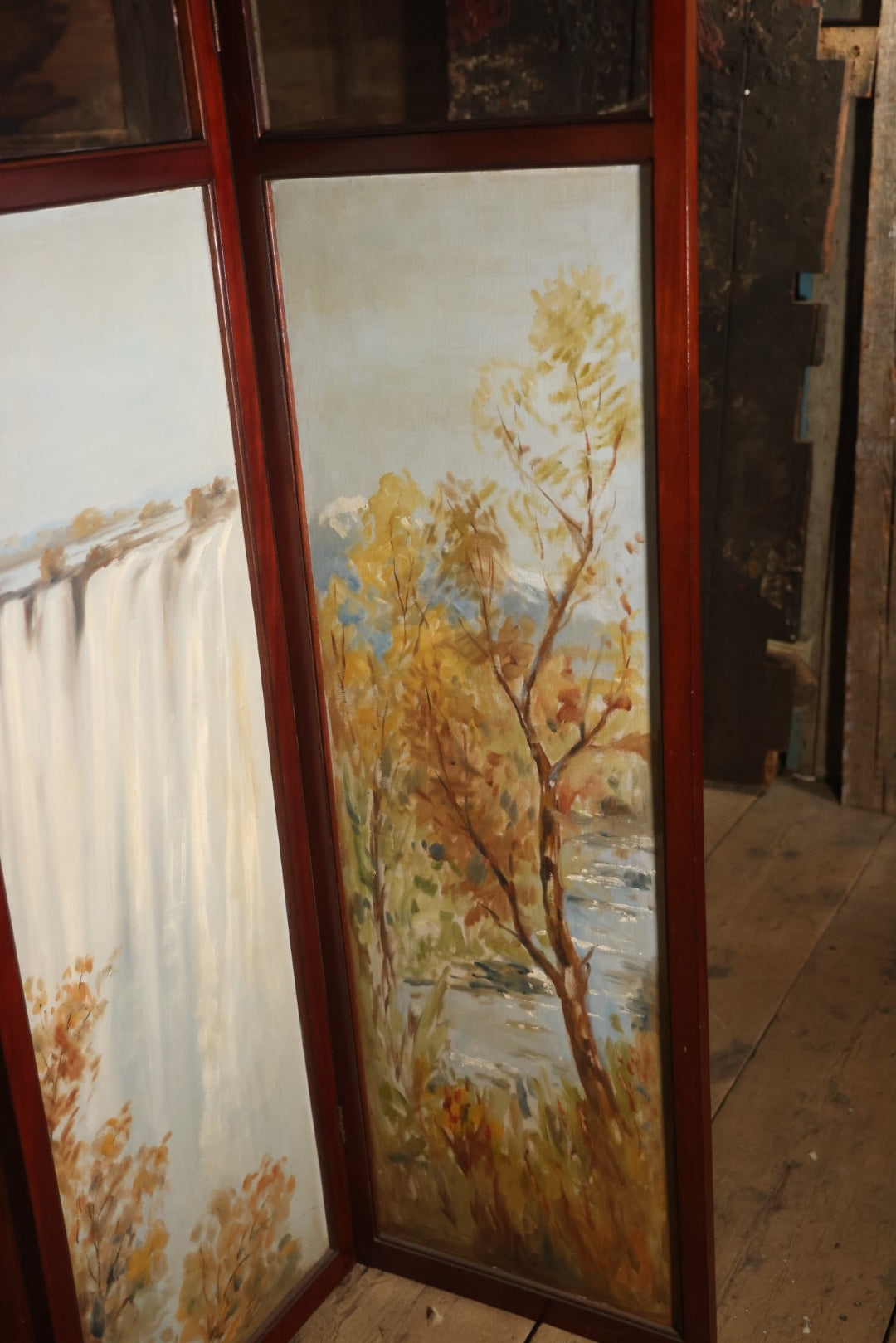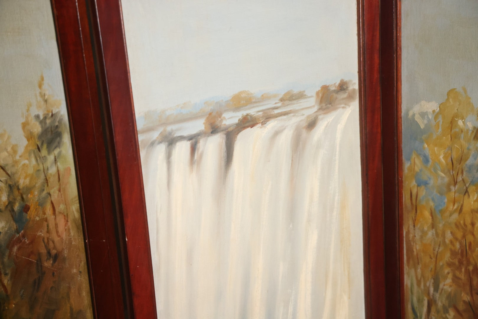 Antique Three Section Room Divider Screen With Hand Painted Scenes Of Dogs, Including Pitbull Dog And Her Pups, Two Dogs Looking At Moon, Three Dogs Chasing Cat Up Tree, Artist Signed E. Underwood, 1908, Landscape, Waterfall Scenes On Verso