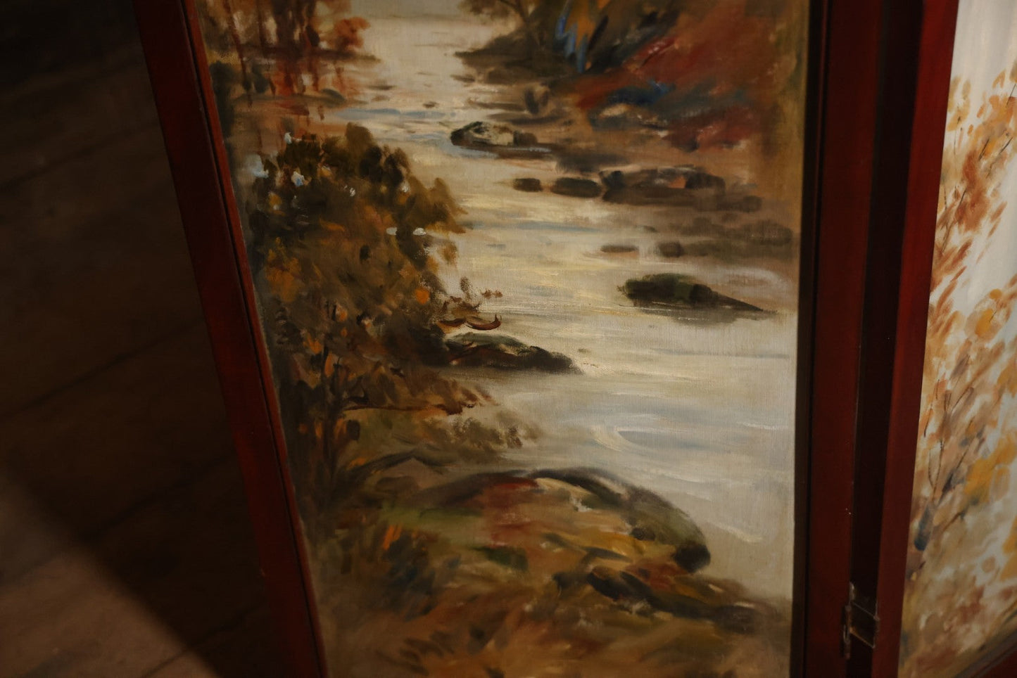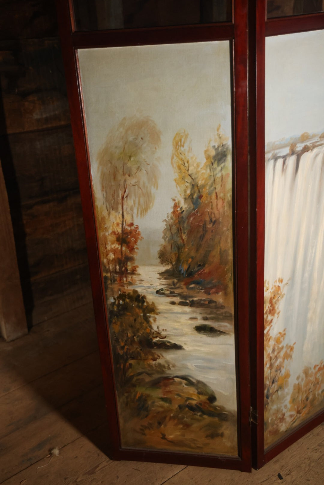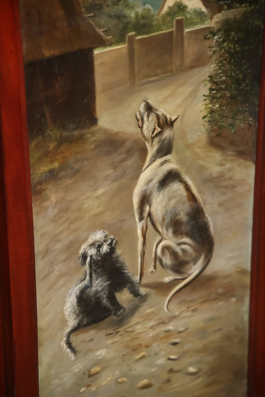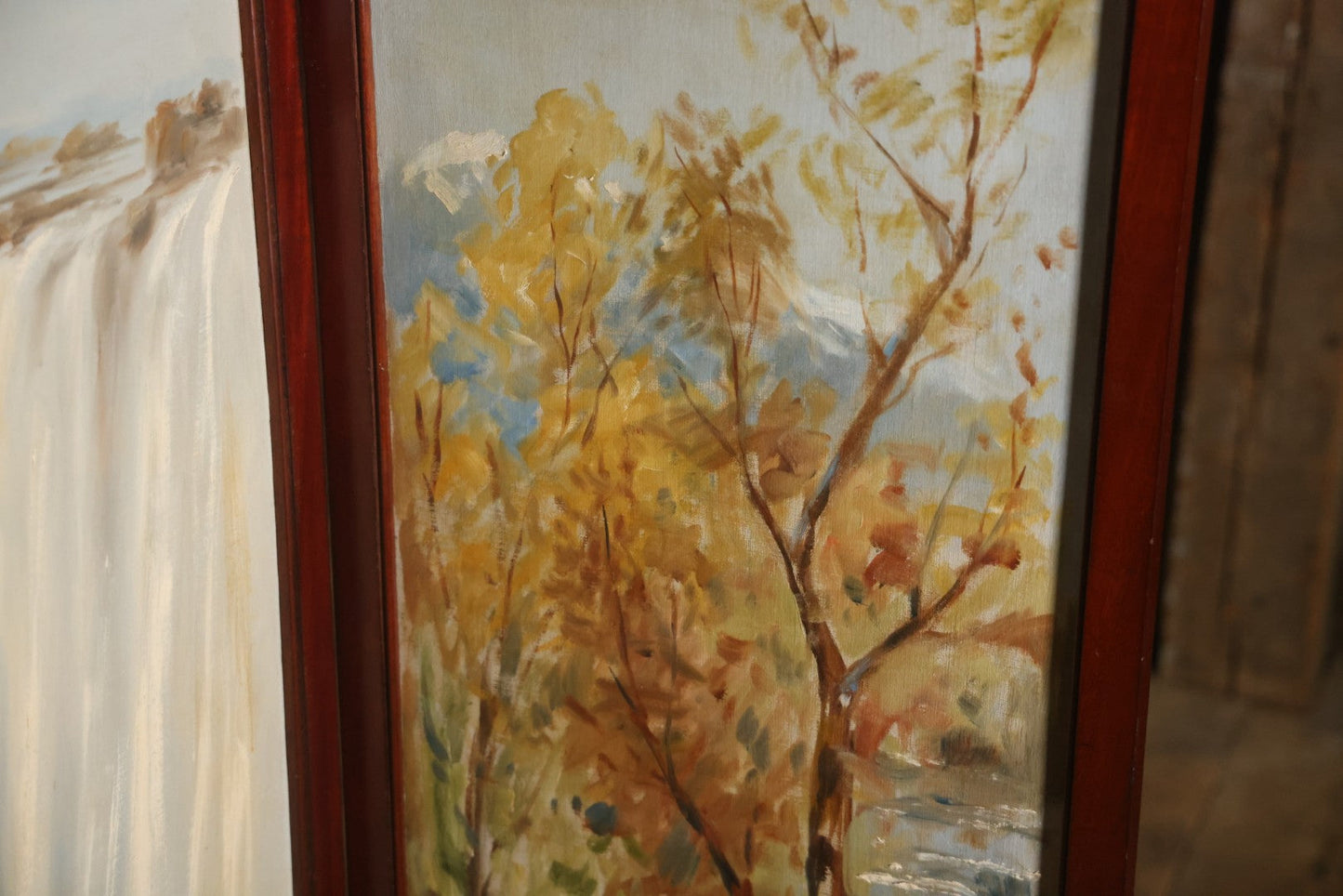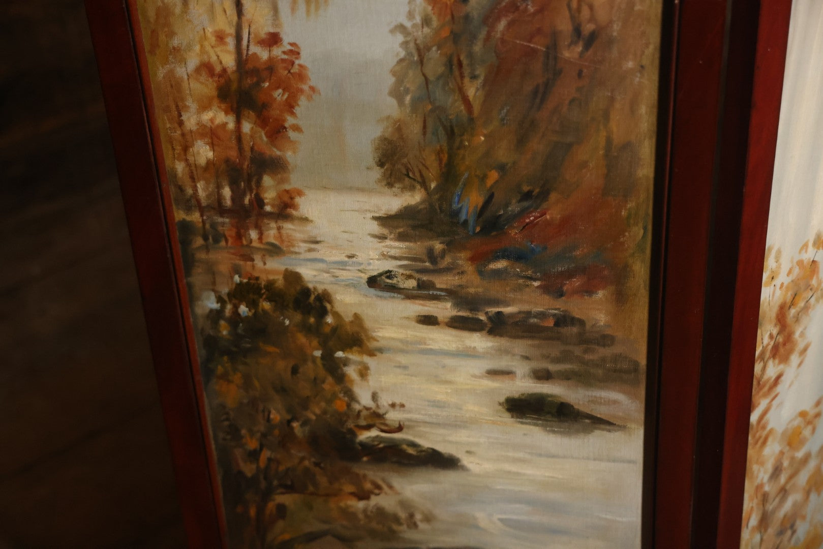Antique Three Section Room Divider Screen With Hand Painted Scenes Of Dogs, Including Pitbull Dog And Her Pups, Two Dogs Looking At Moon, Three Dogs Chasing Cat Up Tree, Artist Signed E. Underwood, 1908, Landscape, Waterfall Scenes On Verso