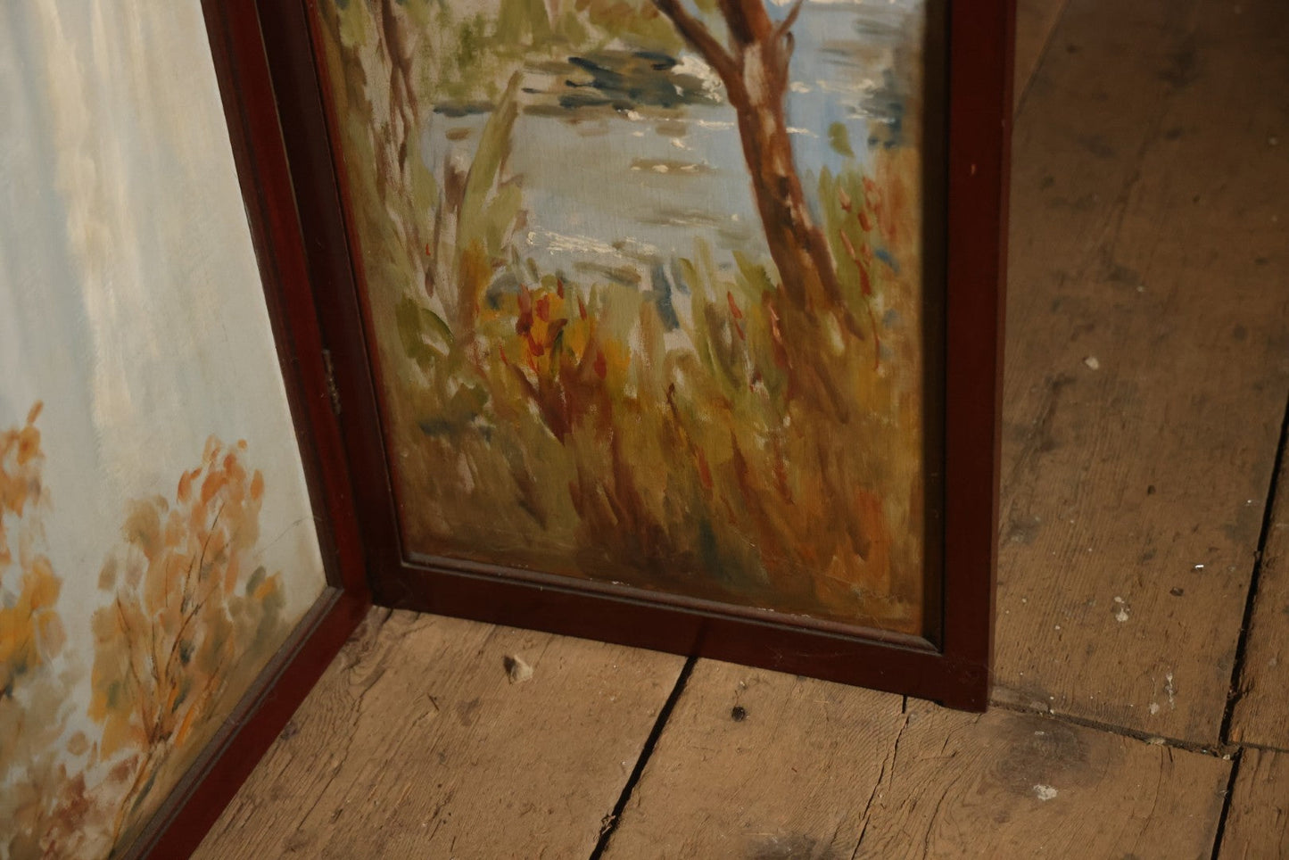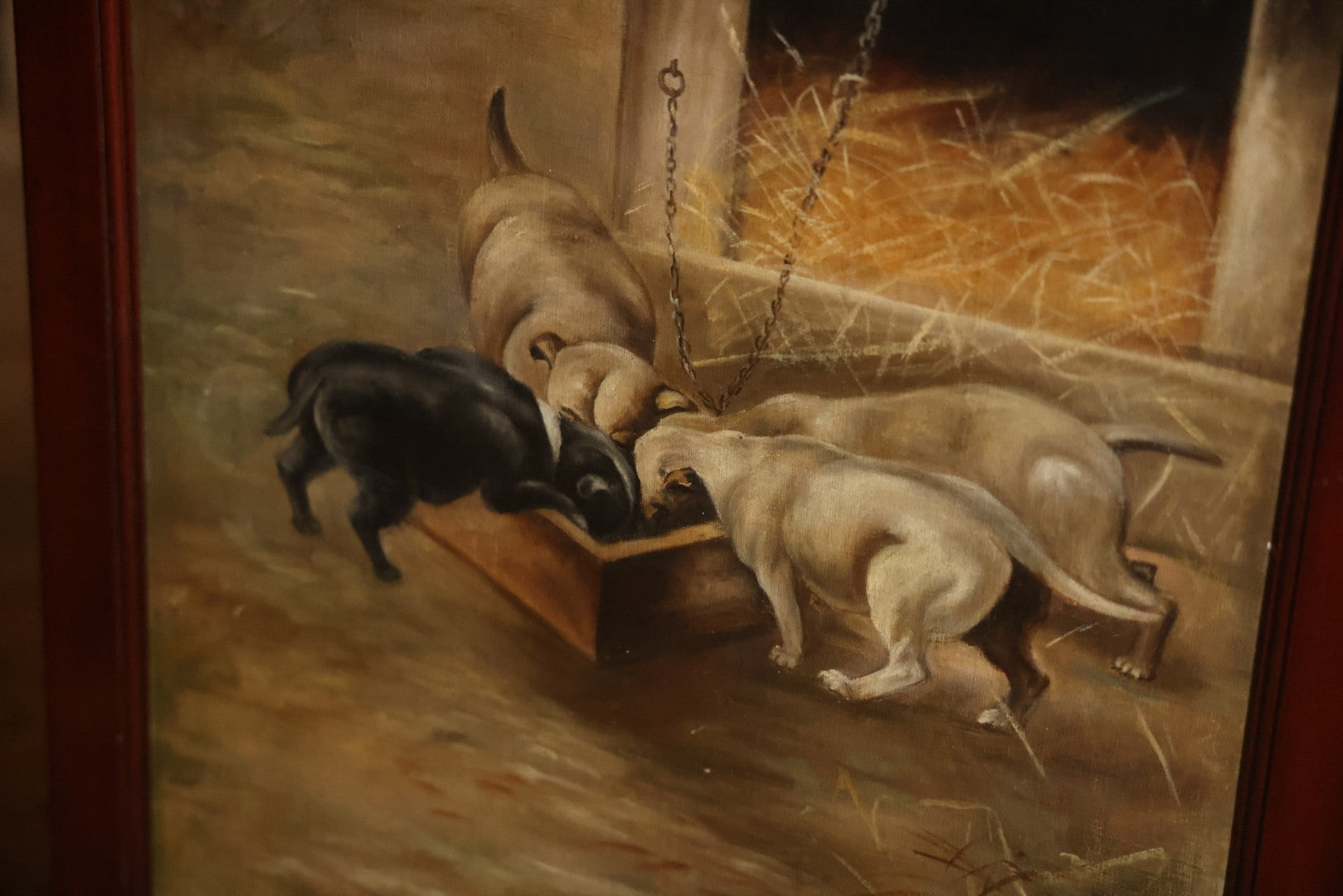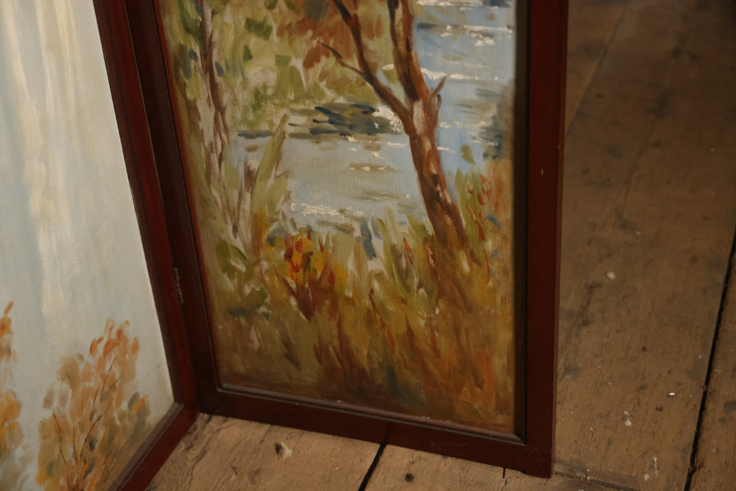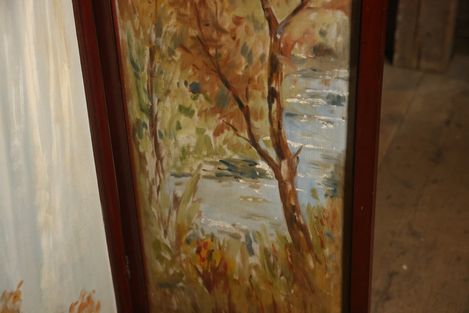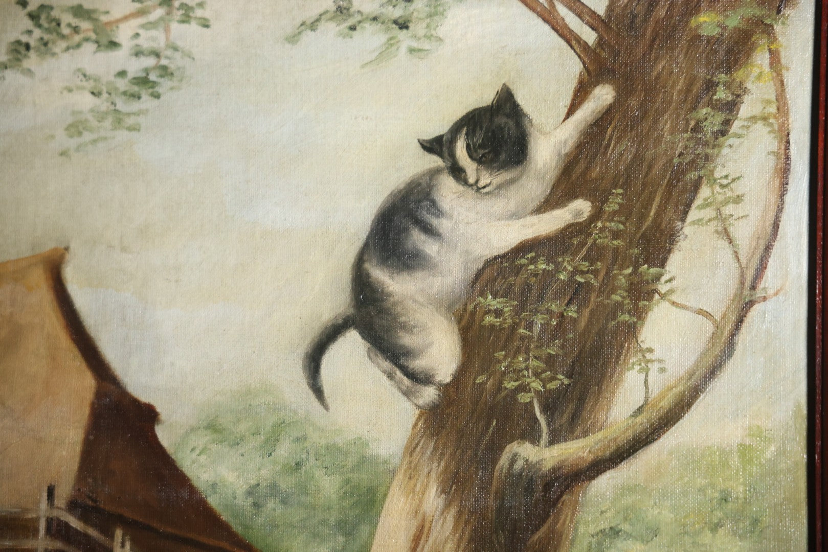 Antique Three Section Room Divider Screen With Hand Painted Scenes Of Dogs, Including Pitbull Dog And Her Pups, Two Dogs Looking At Moon, Three Dogs Chasing Cat Up Tree, Artist Signed E. Underwood, 1908, Landscape, Waterfall Scenes On Verso
