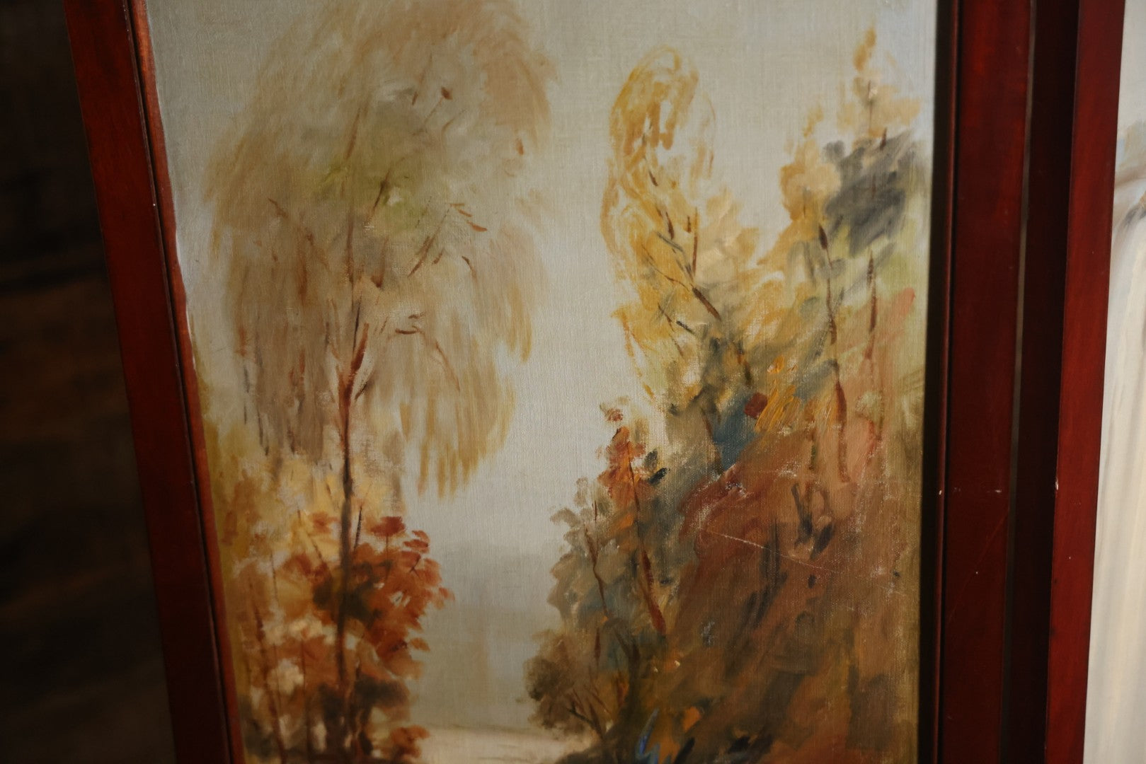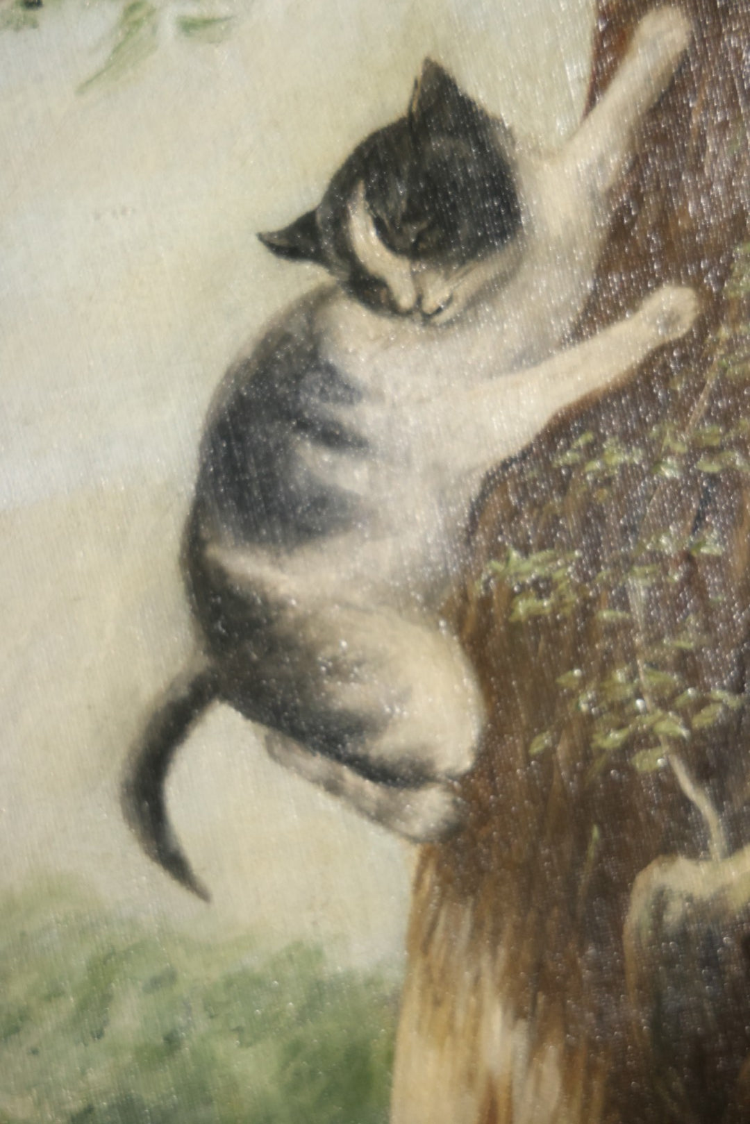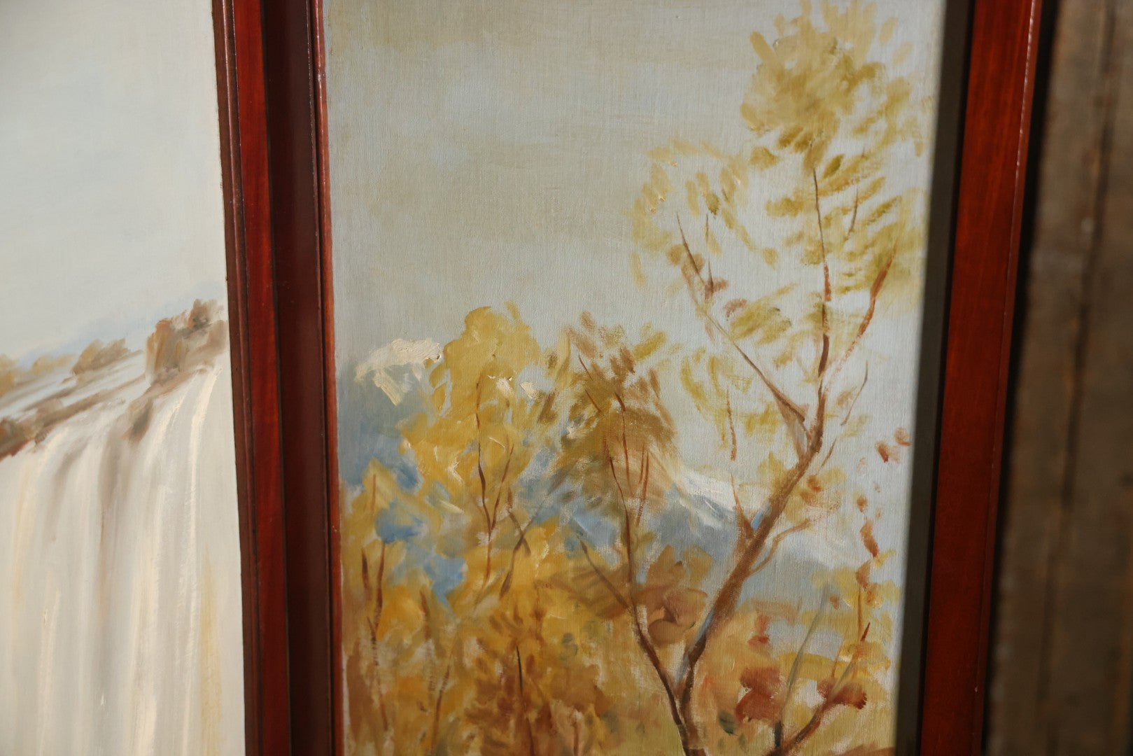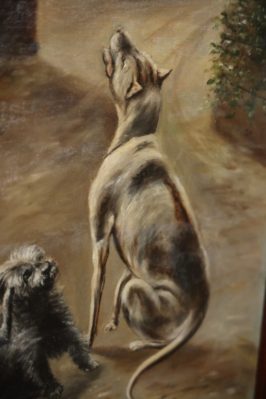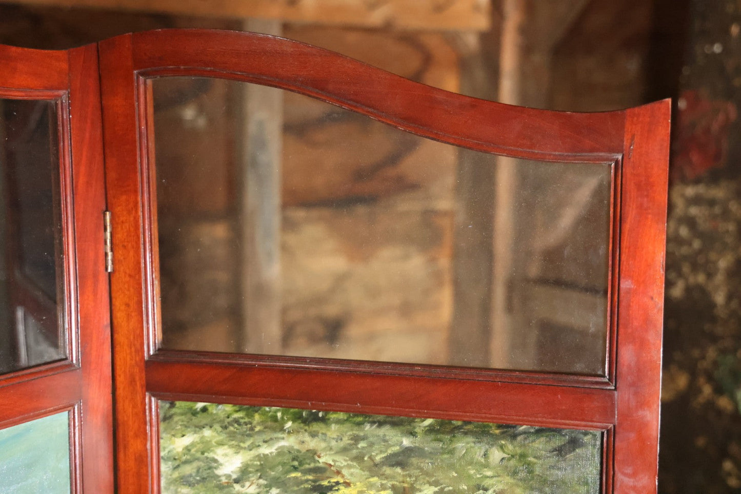 Antique Three Section Room Divider Screen With Hand Painted Scenes Of Dogs, Including Pitbull Dog And Her Pups, Two Dogs Looking At Moon, Three Dogs Chasing Cat Up Tree, Artist Signed E. Underwood, 1908, Landscape, Waterfall Scenes On Verso
