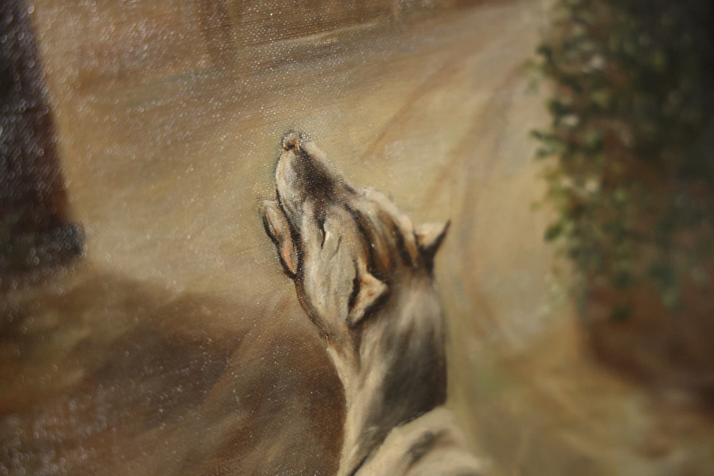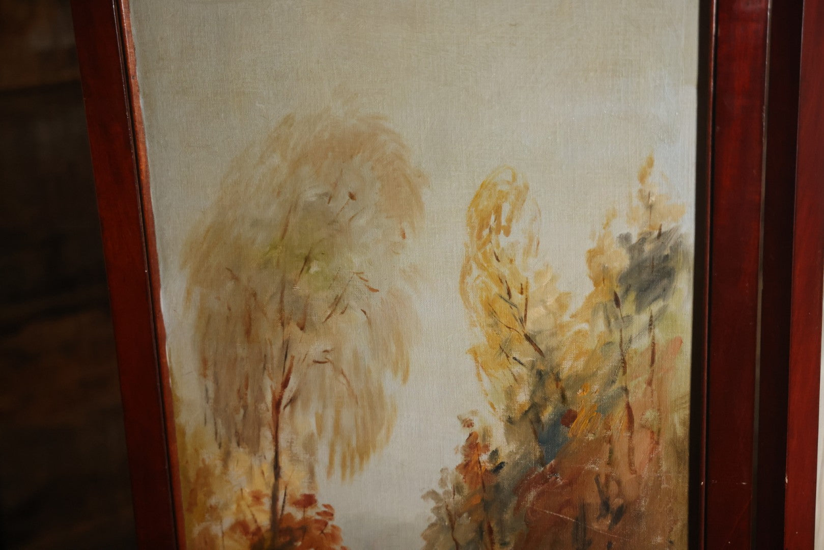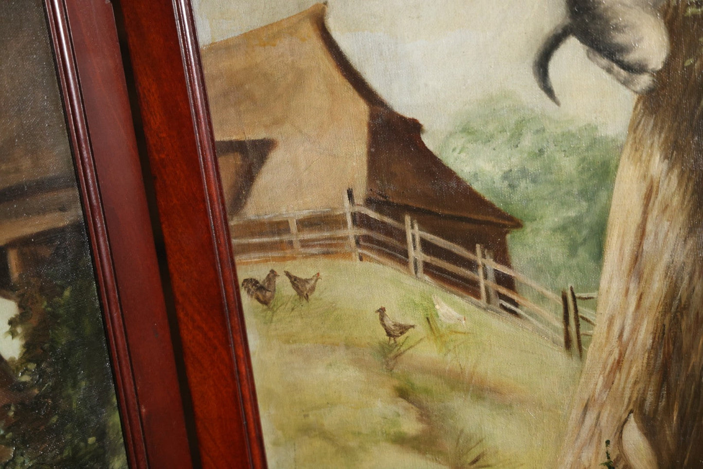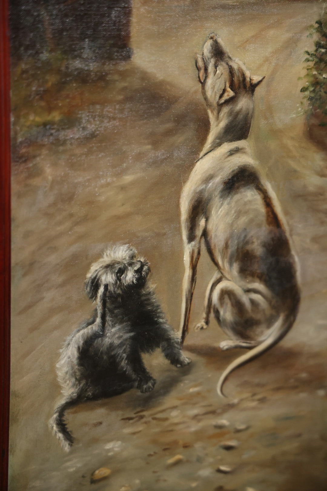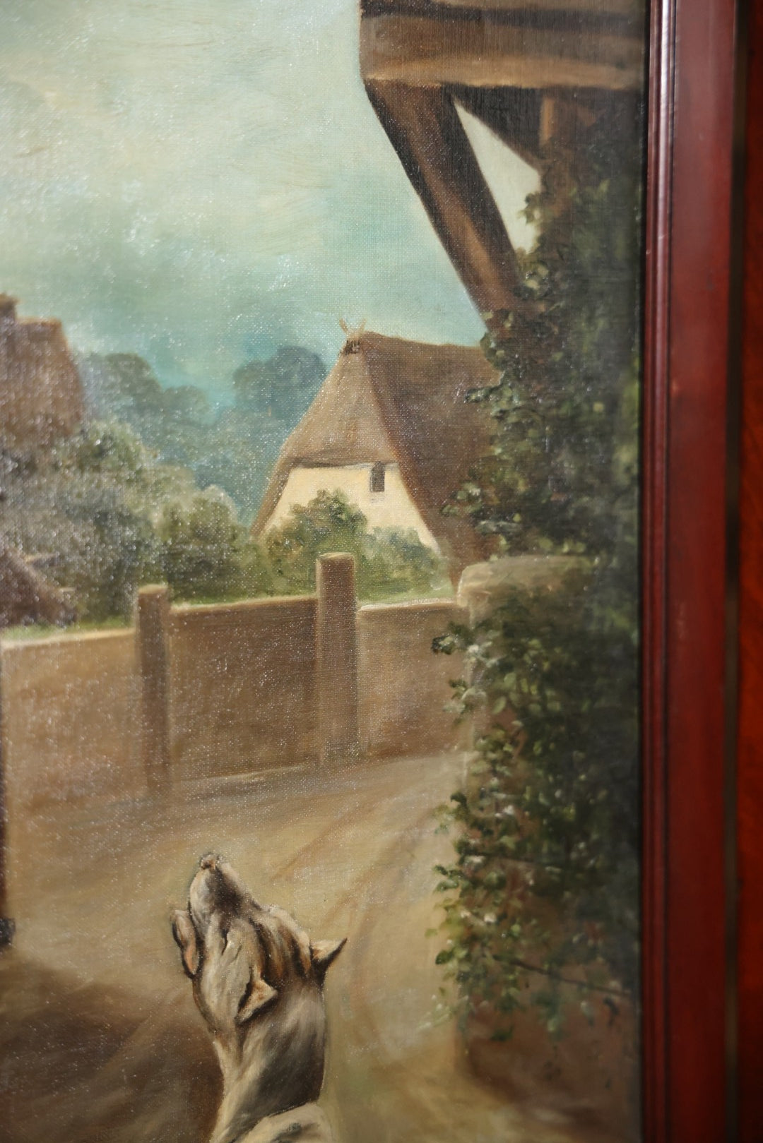 Antique Three Section Room Divider Screen With Hand Painted Scenes Of Dogs, Including Pitbull Dog And Her Pups, Two Dogs Looking At Moon, Three Dogs Chasing Cat Up Tree, Artist Signed E. Underwood, 1908, Landscape, Waterfall Scenes On Verso