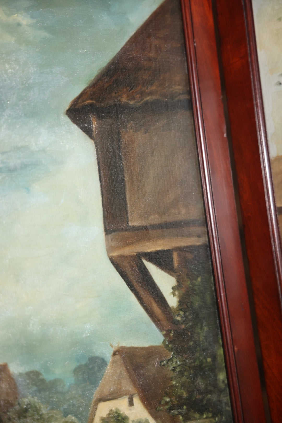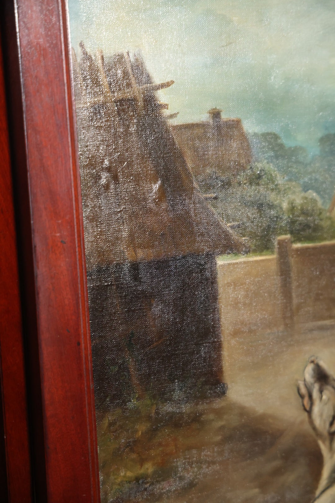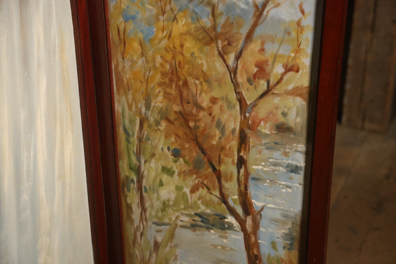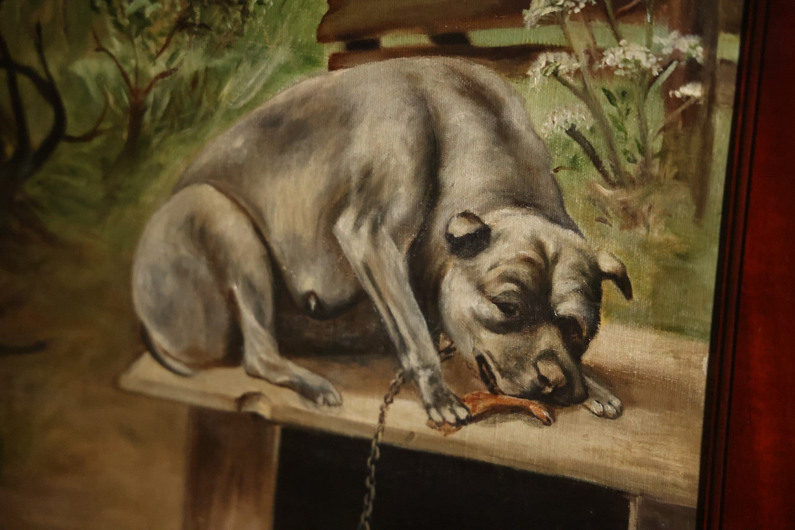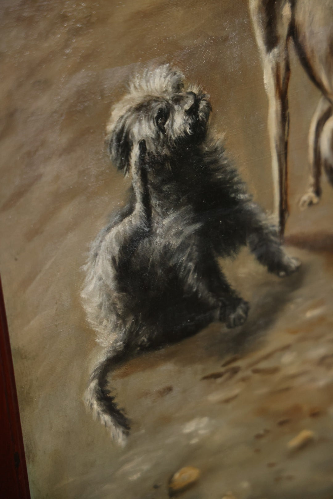 Antique Three Section Room Divider Screen With Hand Painted Scenes Of Dogs, Including Pitbull Dog And Her Pups, Two Dogs Looking At Moon, Three Dogs Chasing Cat Up Tree, Artist Signed E. Underwood, 1908, Landscape, Waterfall Scenes On Verso