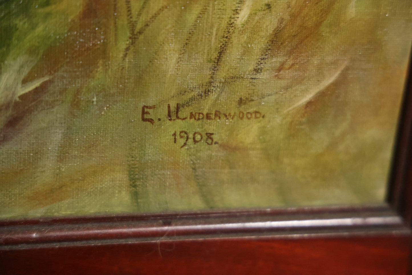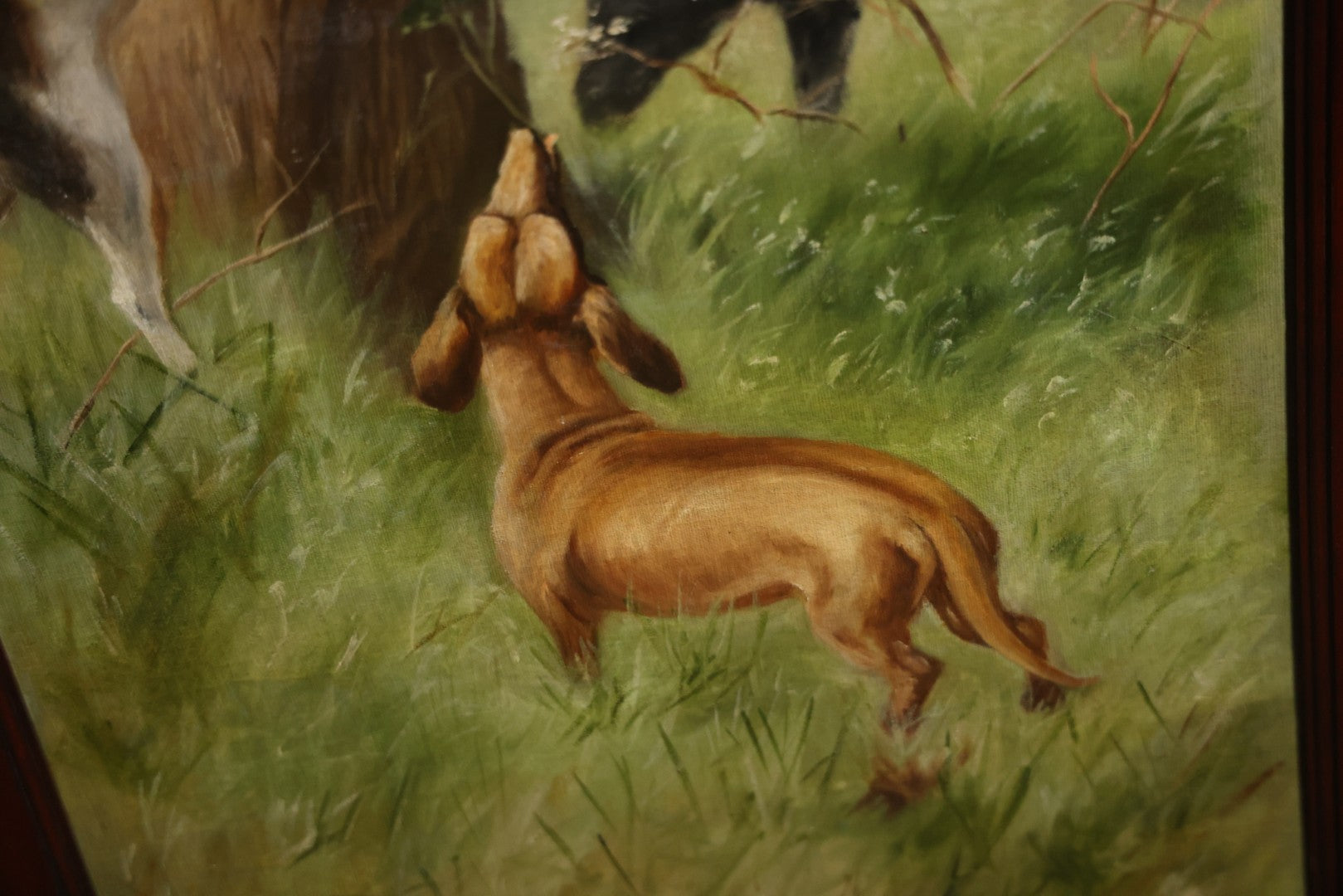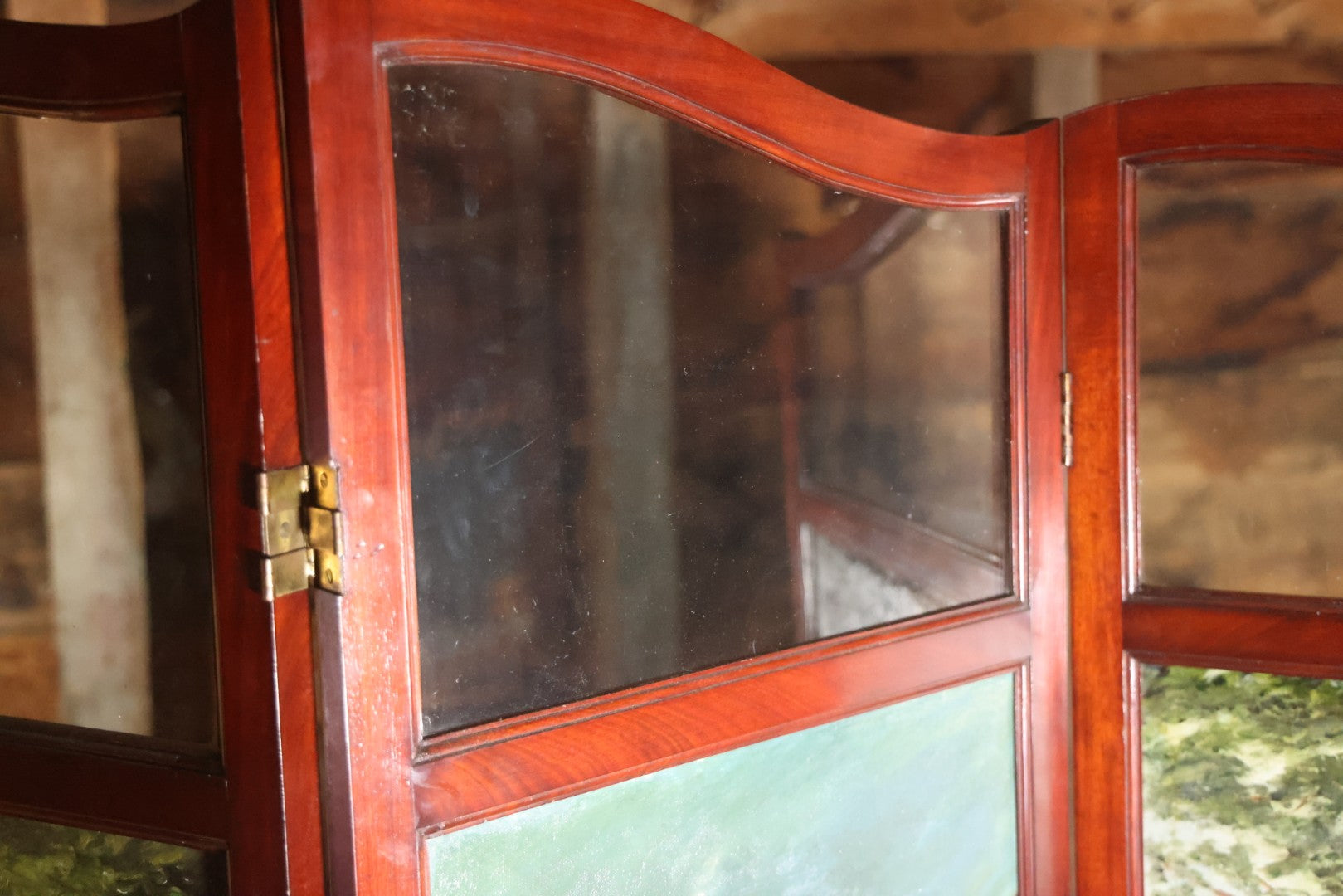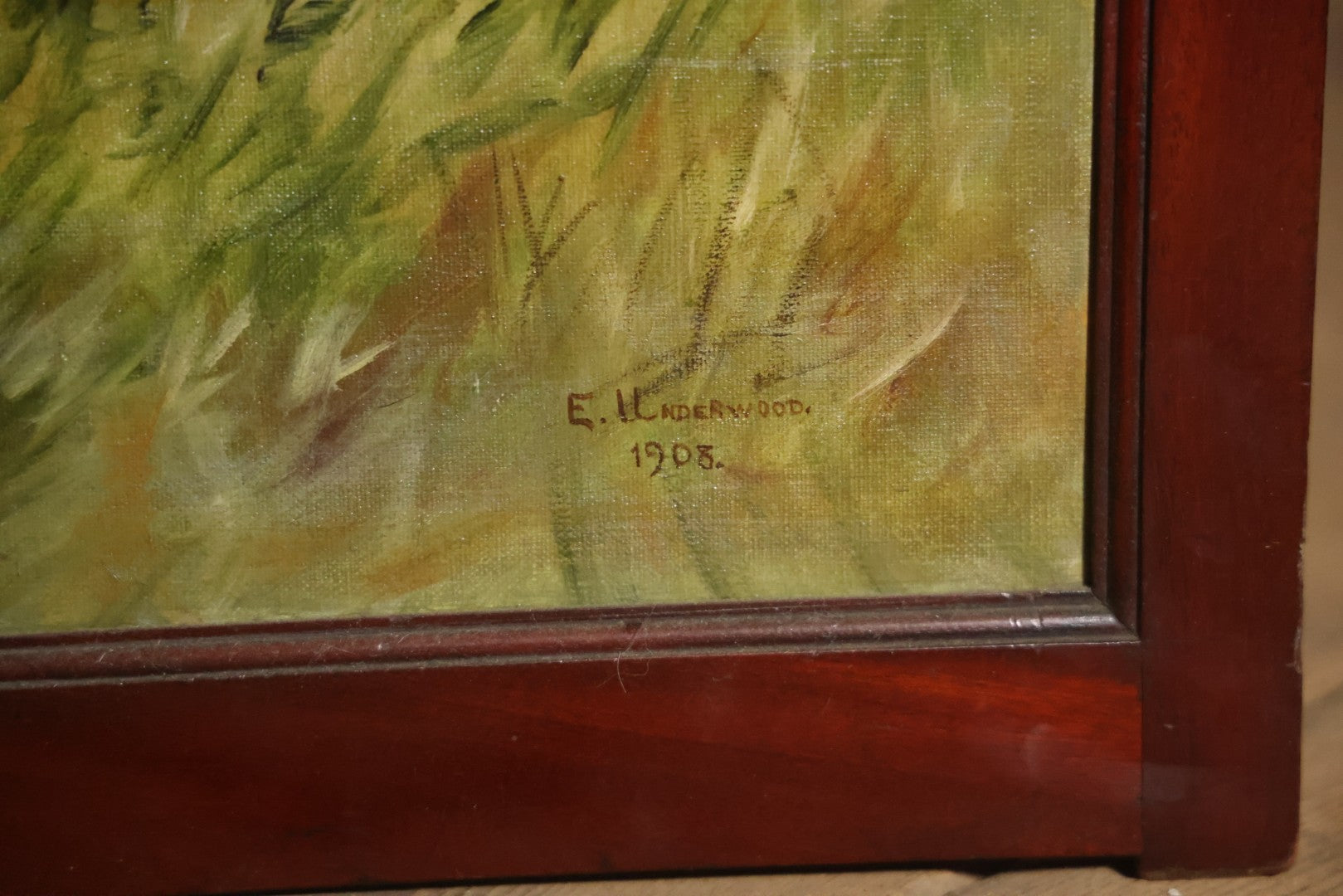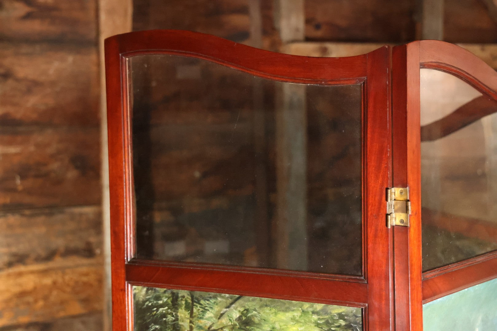 This three section room divider screen depicts wonderfully crafted scenes of dogs at play, and is artist signed in the lower right. The back side features landscape scenes with a waterfall. It is artist signed, though I am unable to identify this E. Underwood. Fated 1908. Bi-fold hinges. Glass windows on top. Overall dimensions 53-1/4" W x 65-3/4". Panels each 17-1/2 W".