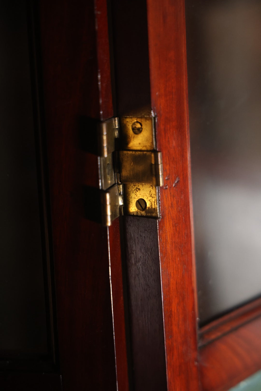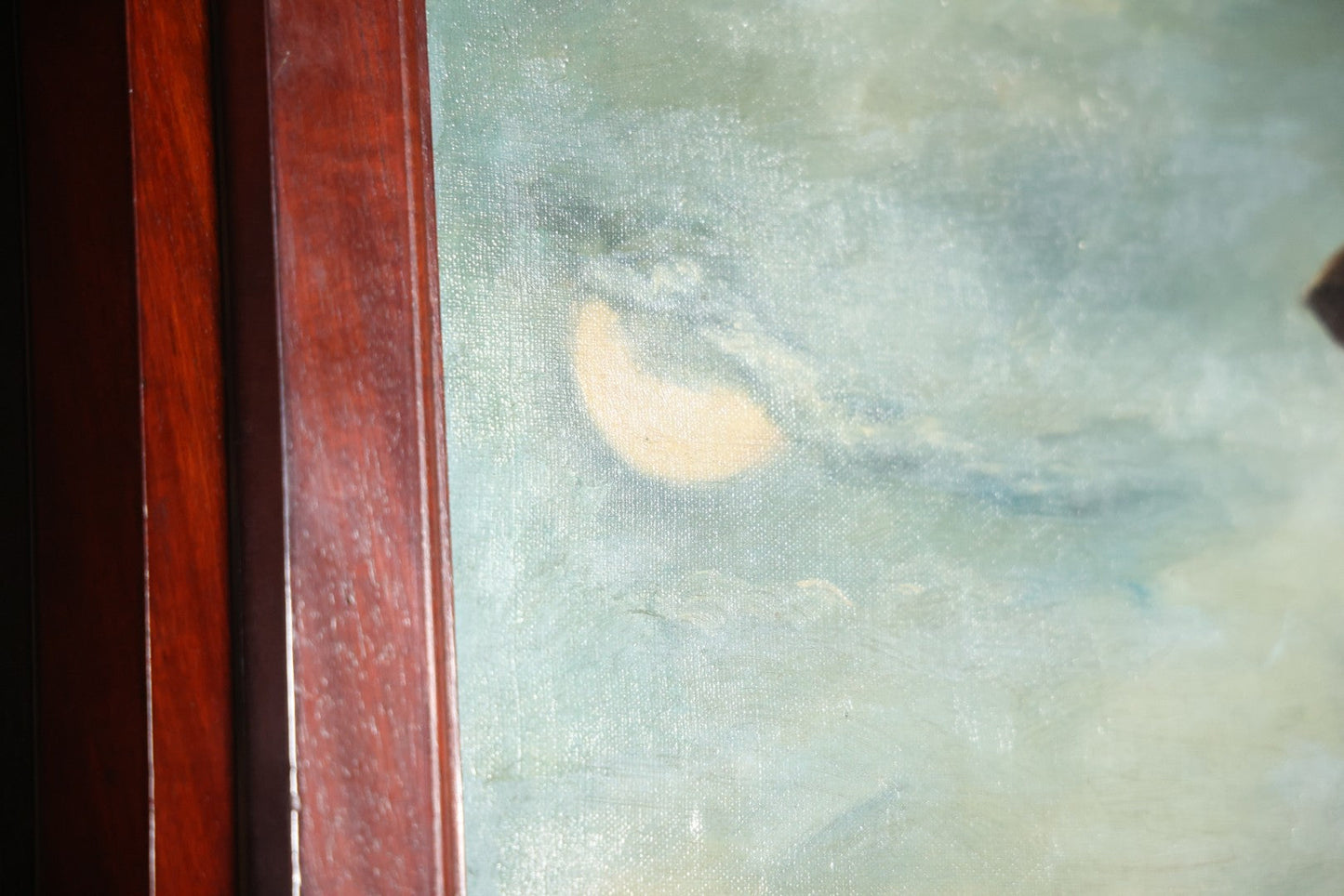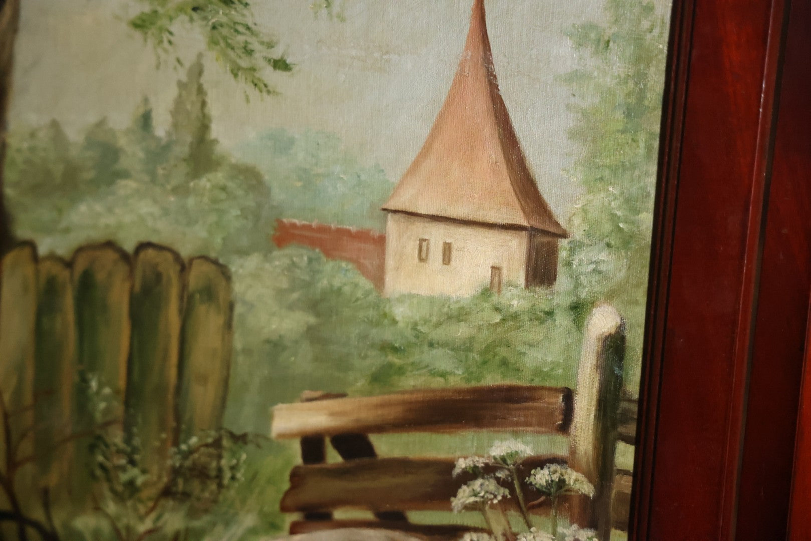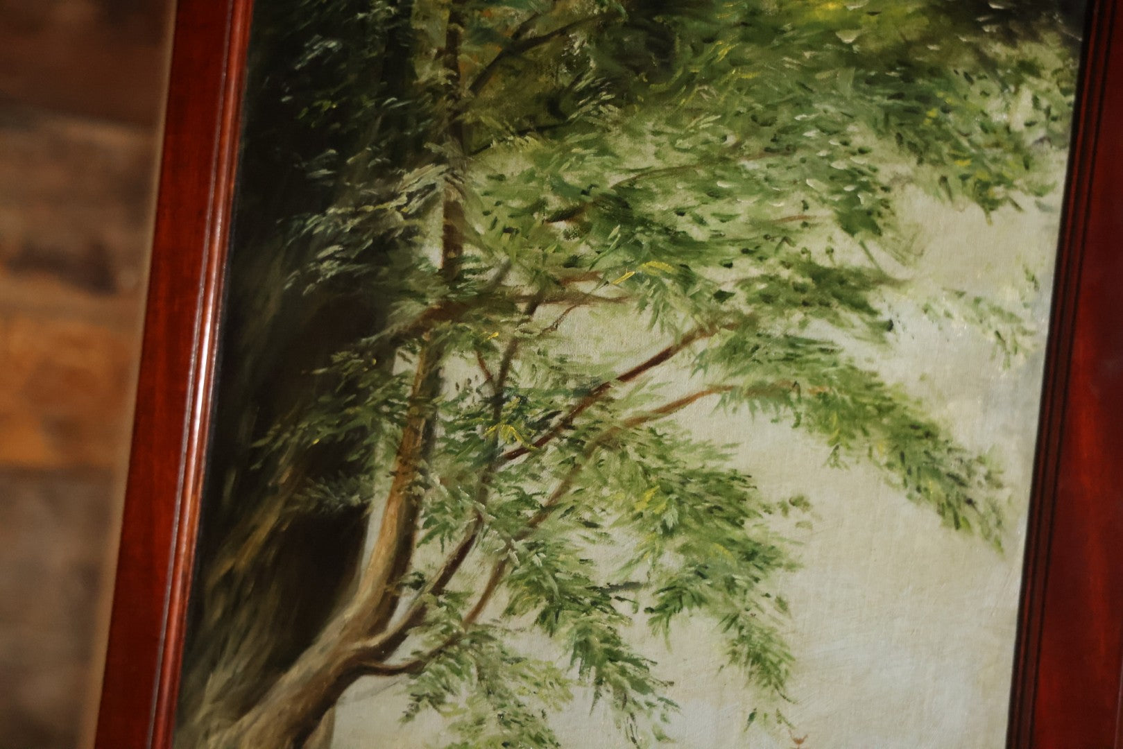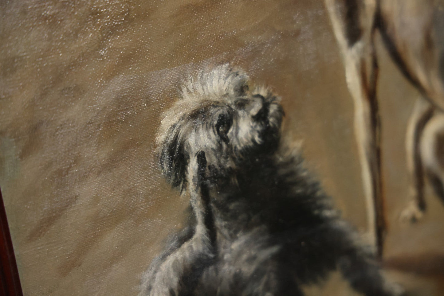 This three section room divider screen depicts wonderfully crafted scenes of dogs at play, and is artist signed in the lower right. The back side features landscape scenes with a waterfall. It is artist signed, though I am unable to identify this E. Underwood. Fated 1908. Bi-fold hinges. Glass windows on top. Overall dimensions 53-1/4" W x 65-3/4". Panels each 17-1/2 W".