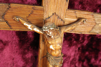 Well worn, yet beautiful, this antique tramp art crucifix has a haunting quality and is ready to adorn your wall. Significant signs of wear from being handled for years and years. Please see photos. The cross measures 11" x 15".