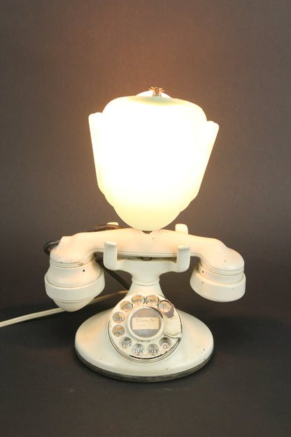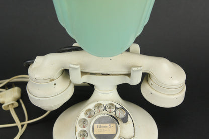 Here is an excellent antique white rotary phone that someone converted into a lamp many years ago. The lamp is well built and features a stunning green plastic art deco shade that clips onto the bulb. The lamp is in working order. The bulb will be included in the sale, but please note that the bulb is quite old and is not guaranteed to survive shipping - any standard bulb will fit this lamp and shade. The phone features some general wear from use and handling. The shade has some tape residue on it, but as far as I can tell it was never cracked.