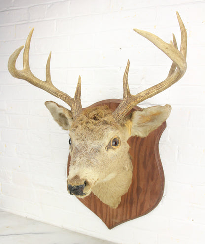 Here is a stunning antique whitetail deer 8-point buck with an impressive rack, nice wood shield mounting, and warm glass eyes. This mount is in great condition, except for a bit of splitting on the lower lip and bottom of the nose. The 8-point antler rack spans 19 inches.