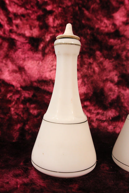 Here is a pair of antique barbershop dispensers - one made of milk glass for witch hazel and one made of frosted glass for water. These two dispensers are sold together for one price. Each features painted pin striping and lettering and a removable ceramic spout with a cork base. Each jar measures 8" tall including the spout, and the bases each have a diameter of 3.75".