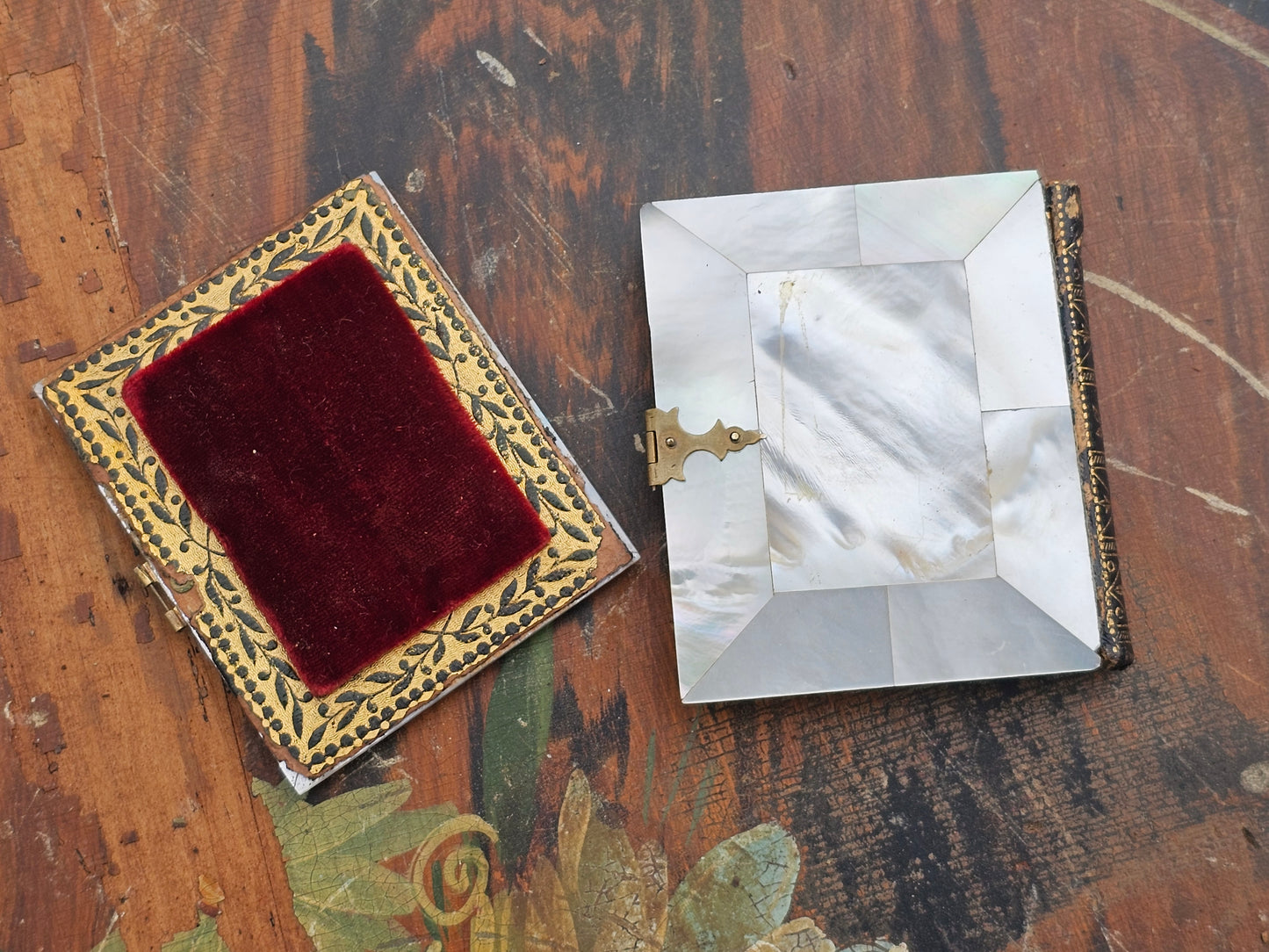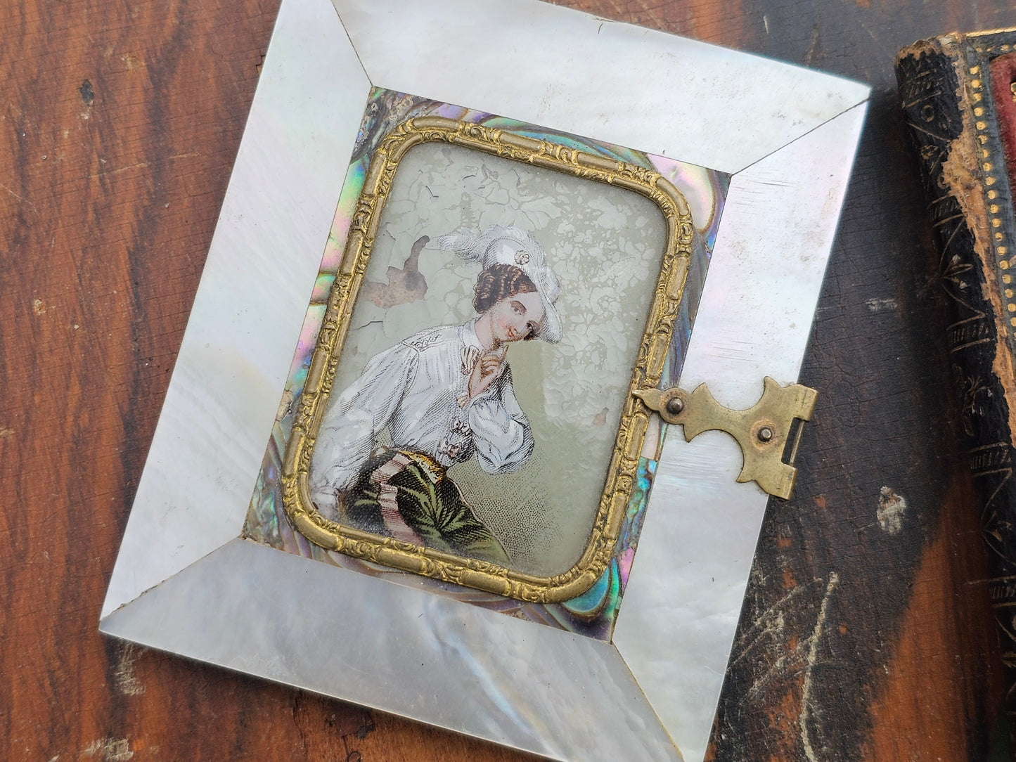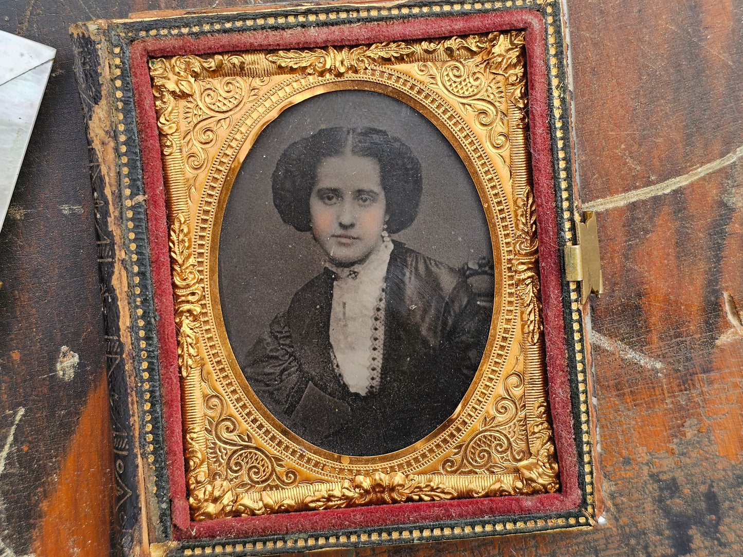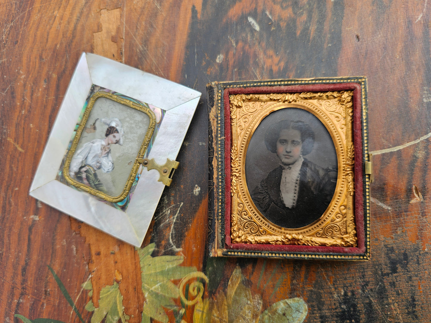 Beautiful 1/9th plate ambrotype photograph of young woman in incredible reverse painted mother of pearl case, separated cover