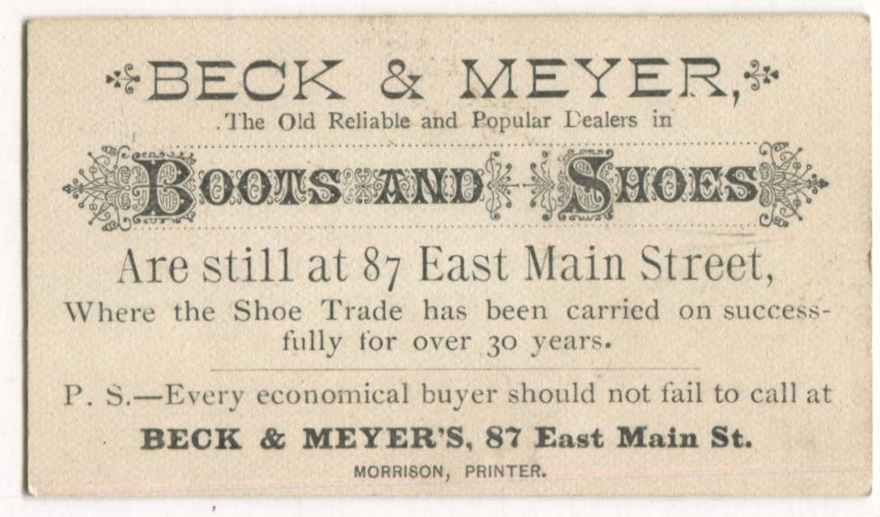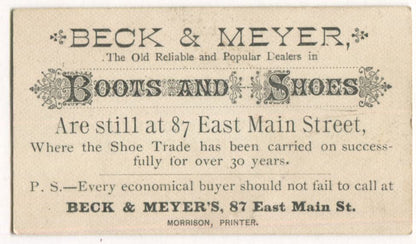 Beck & Meyer, Dealer of Boots & Shoes, Rochester, NY Antique Trade Card