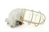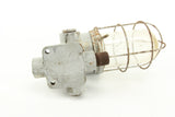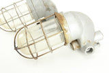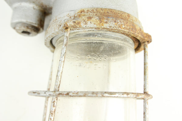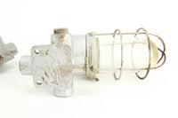 Here is an excellent and stylish pair of vintage heavy duty industrial light fixtures manufactured in the USA by Benjamin Vapolet. These metal fixtures feature glass domes and metal cages and weigh nearly seven pounds each. The light fixtures have not been tested and may be missing electrical components. Please consult a licensed electrician before attempting to repair or install these fixtures.
