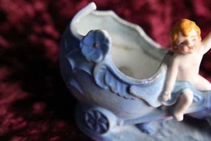 This vintage bisque and porcelain figurine features a small child with a fist raised in the air riding a blue tiger pulling a cart. The cart has a small bowl that could be used for coins, jewelry, trinkets, or whatever use you may find. The bottom of the figurine is marked Mepocoware, Made in Japan. This vintage piece measures 7" in length.